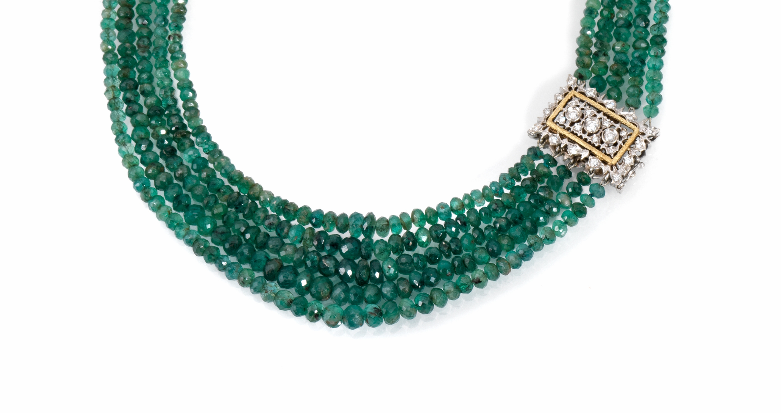 realizzata a cinque fili di smeraldo sfaccettati posti in lieve gradazione, fermatura rettangolare in oro bianco ed oro giallo traforato e cesellato decorata da piccoli brillanti