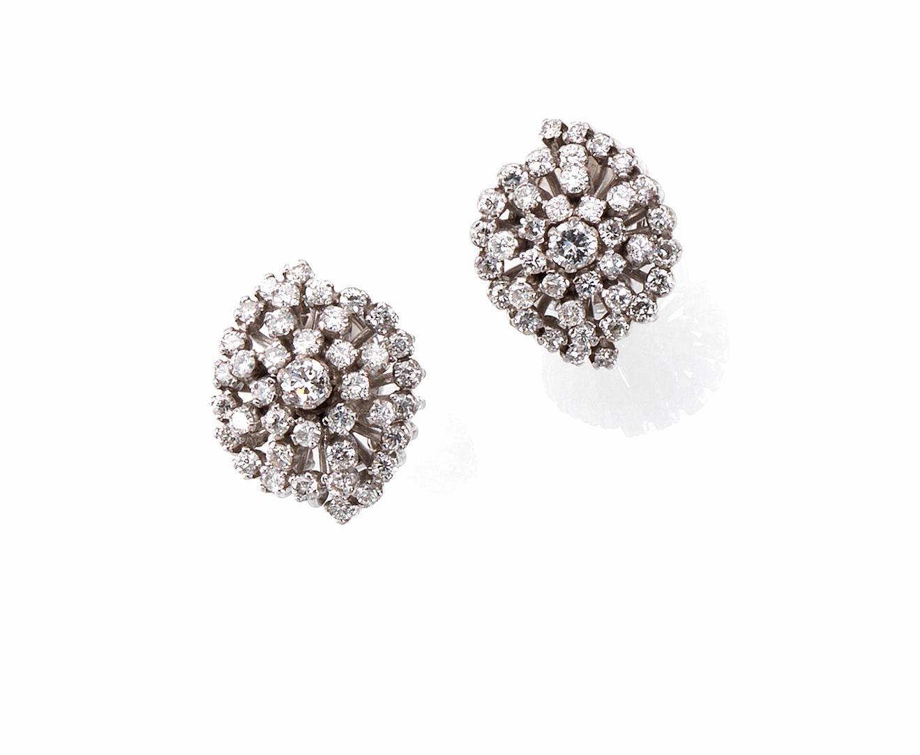 Paio di orecchini in oro bianco e diamanticiascuno formato da due linee curve...