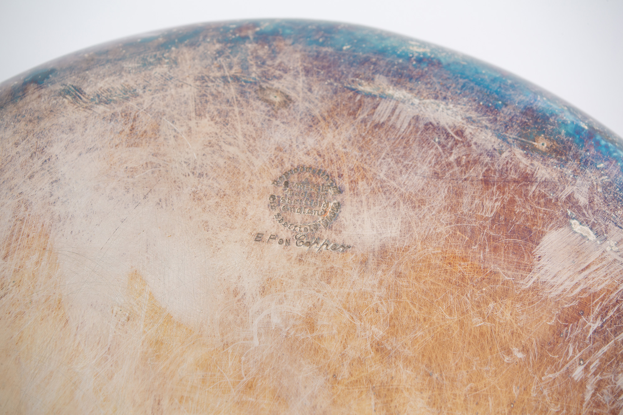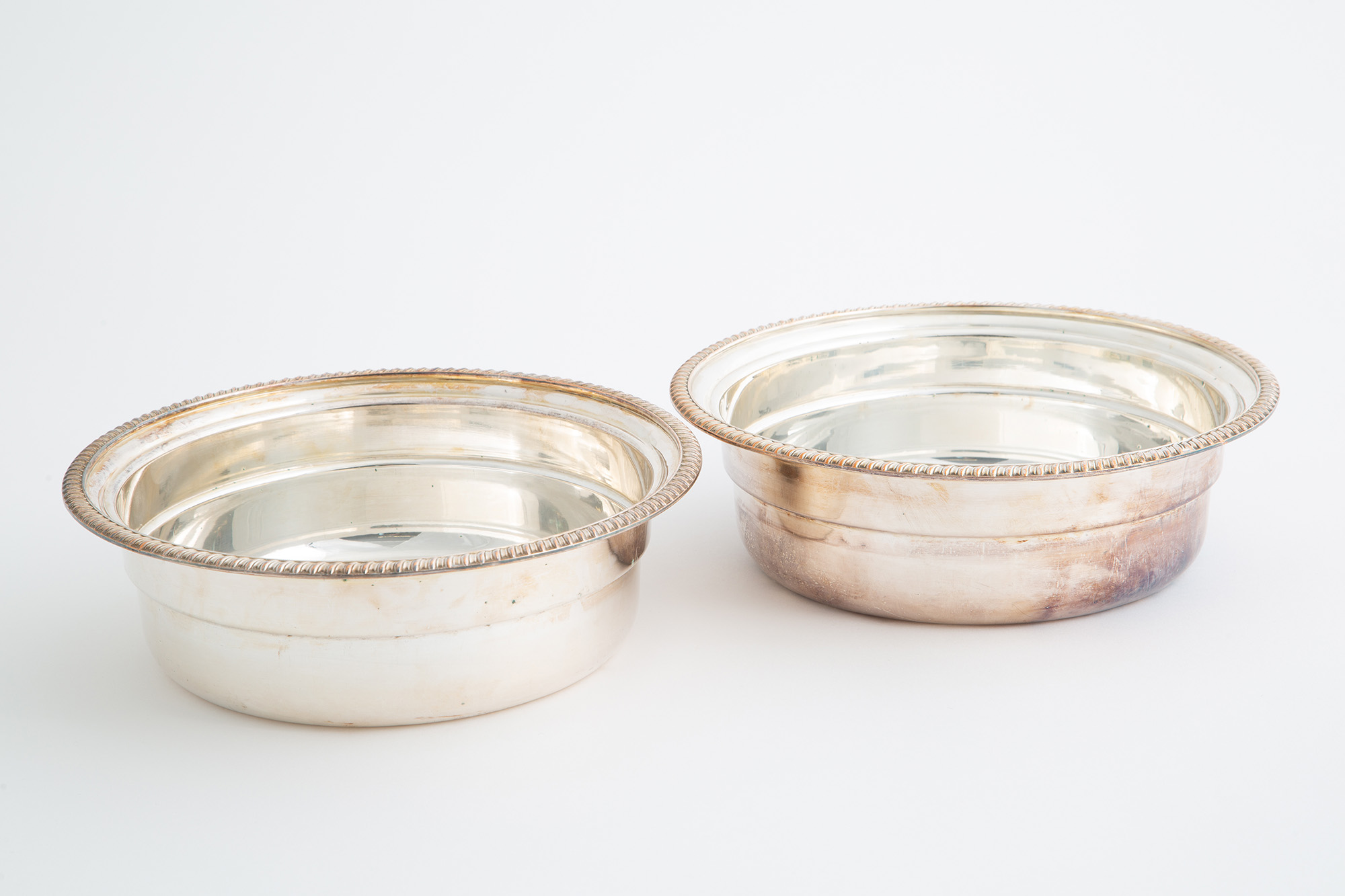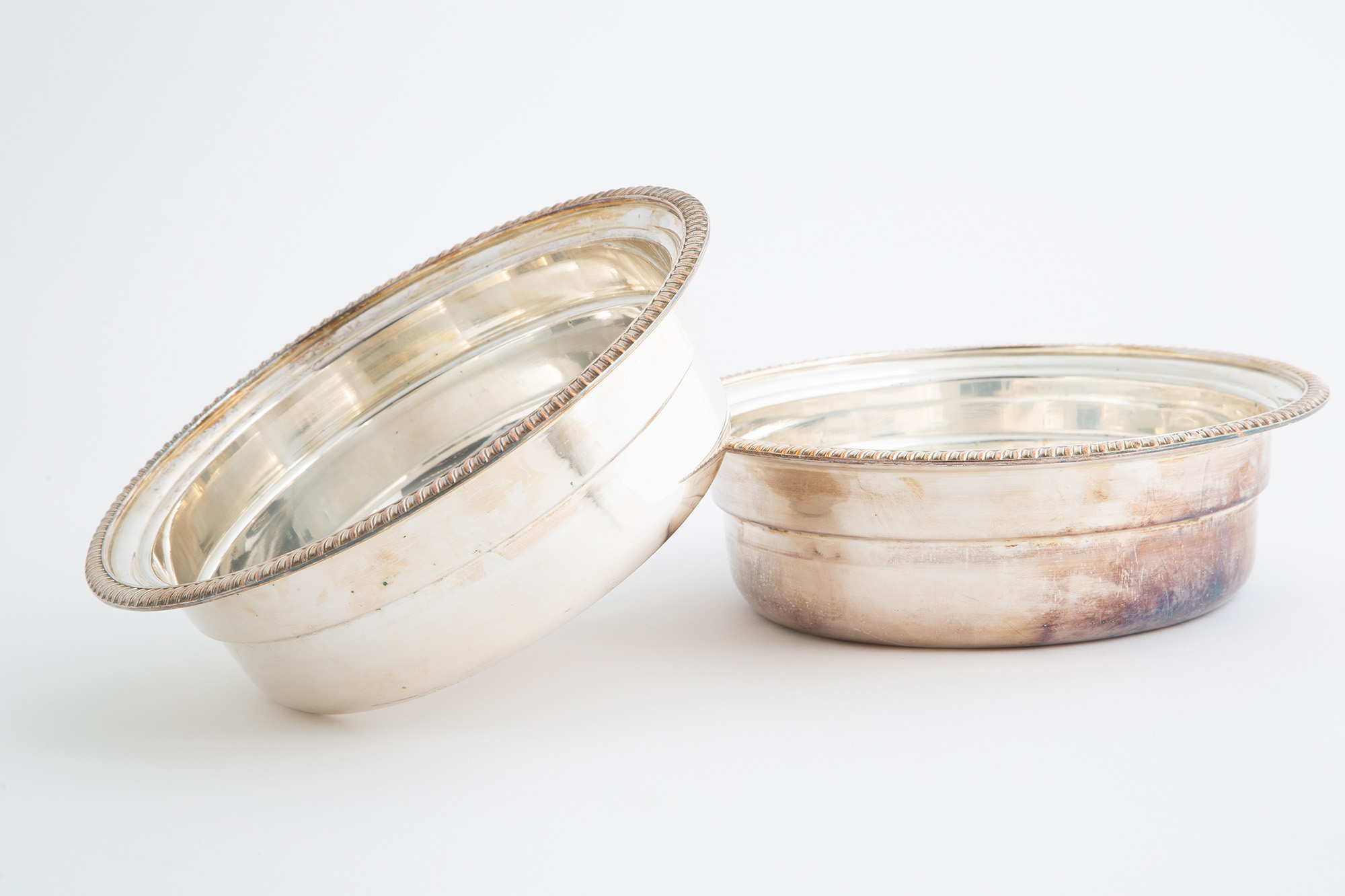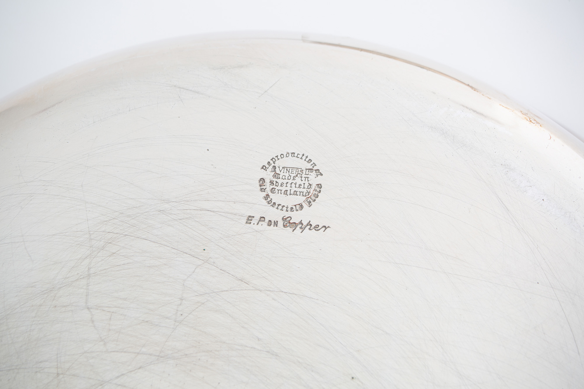 Due ciotole in sheffield. Marcate sul fondo. XX secolo. Mis. Alt. cm. 8 Diam. cm. 24 ca.