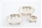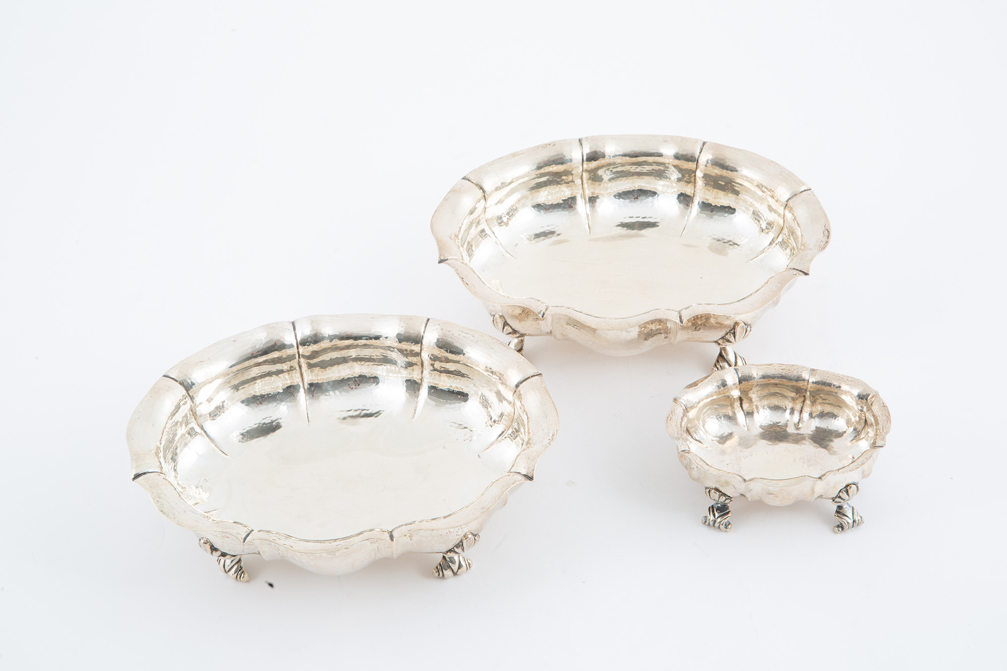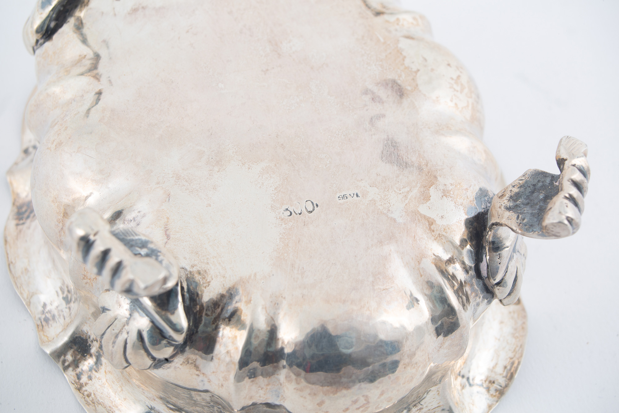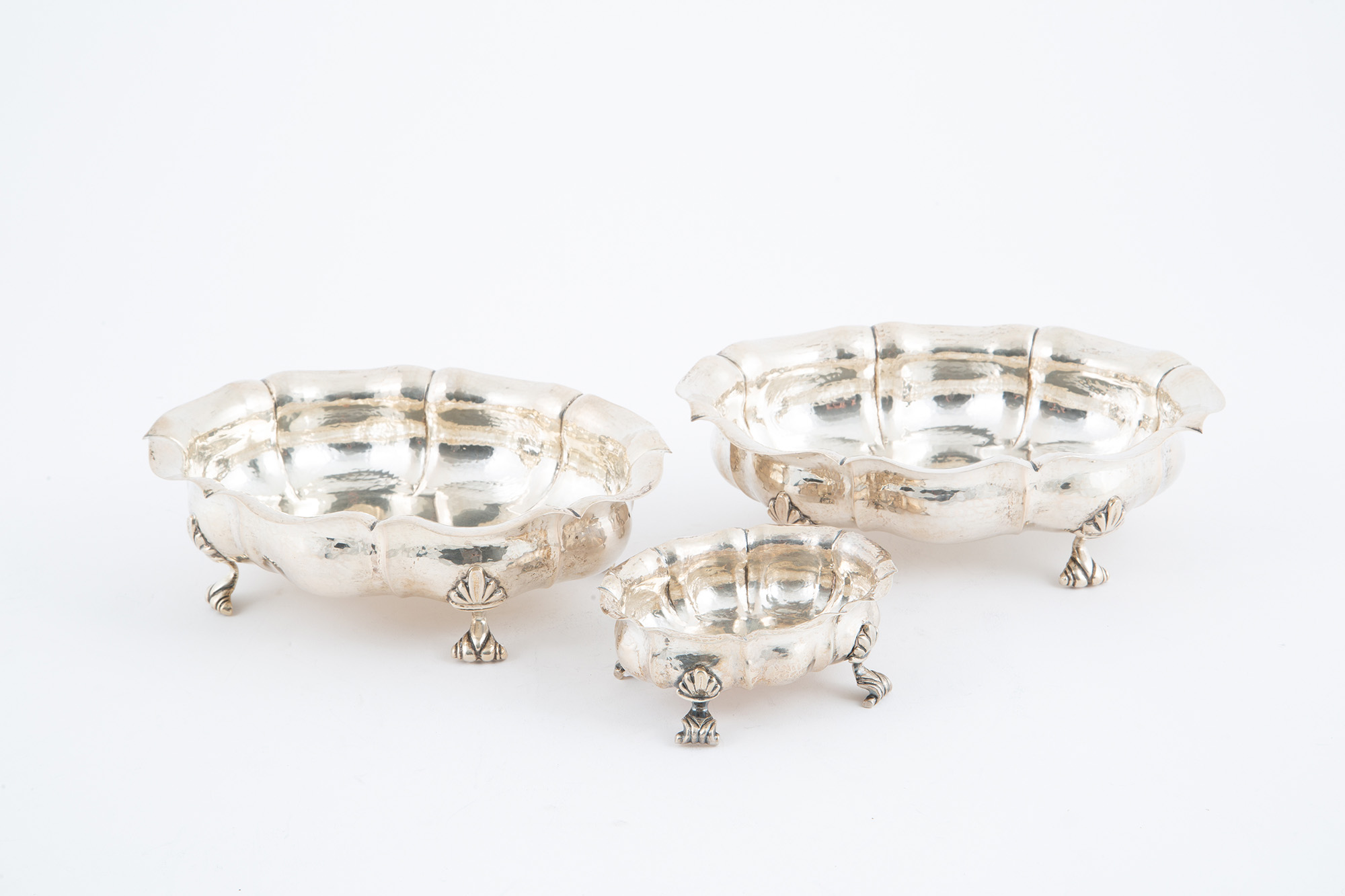 Due legumiere e una saliera in argento 800 sbalzato, gr. 770 ca. complessivi. Punzoni sul fondo. XX secolo.
