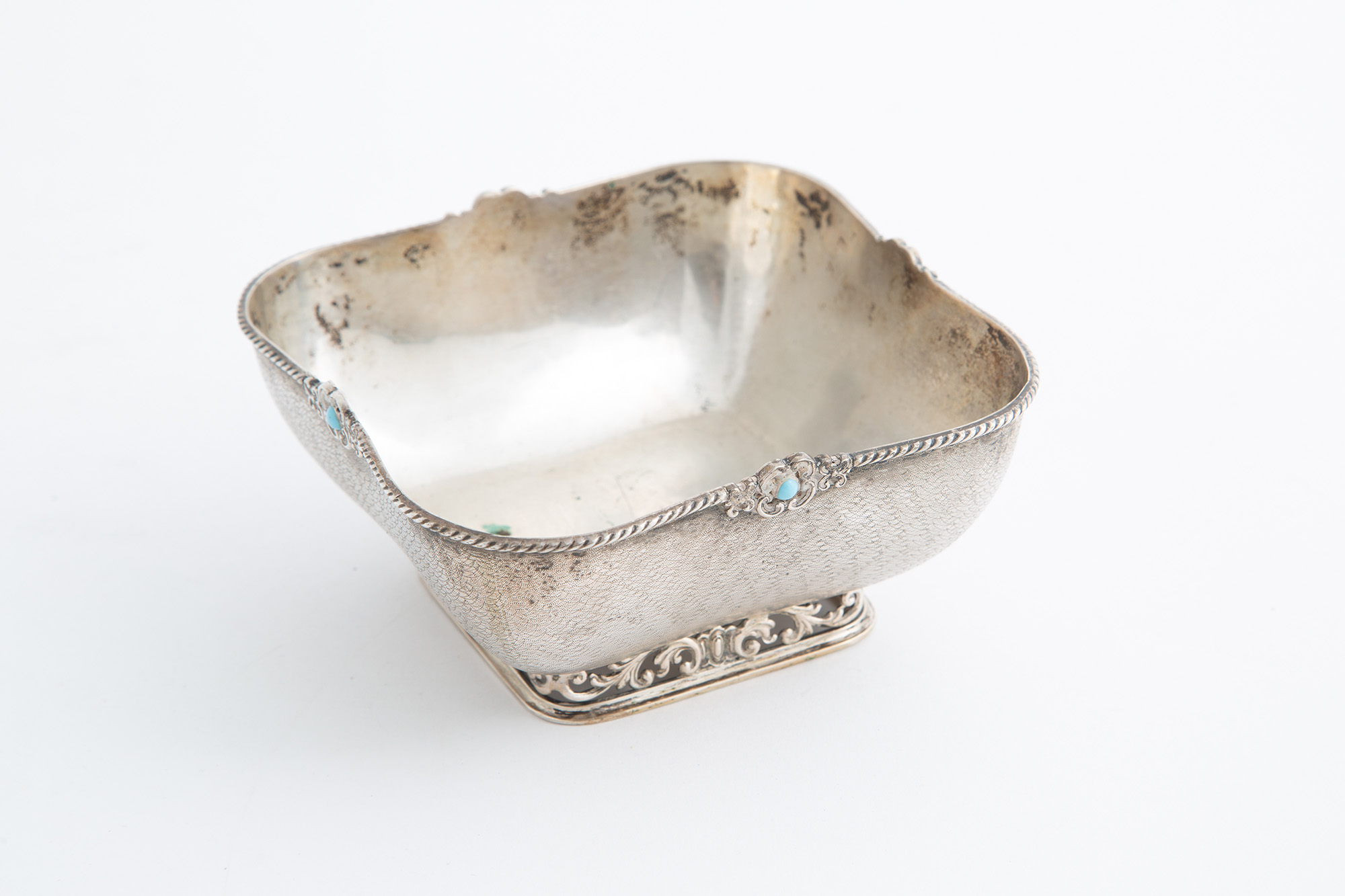 Due ciotole, un portauovo e un calamaio in argento, gr. 720 ca. complessivi. XX secolo.