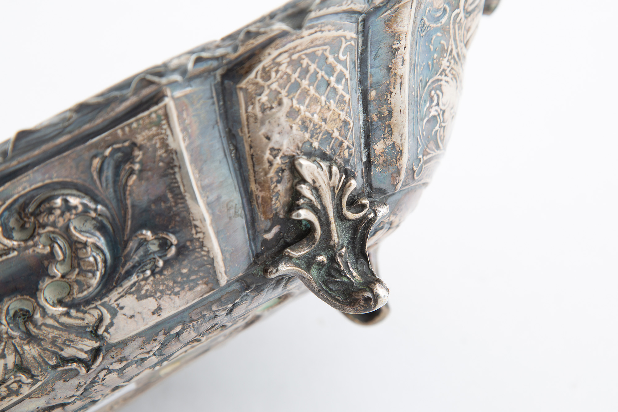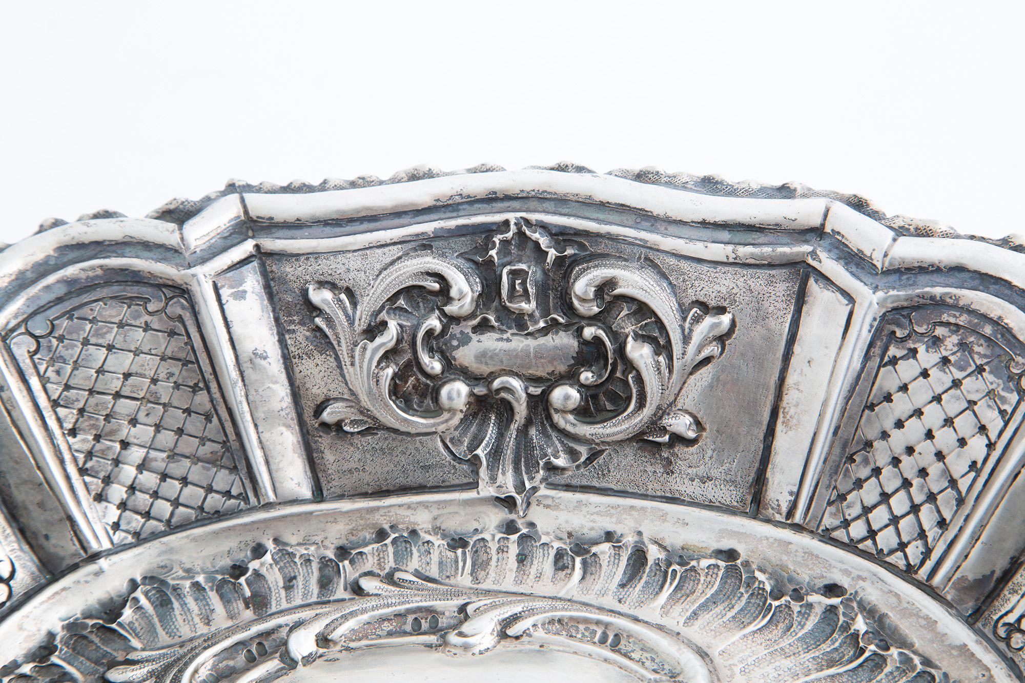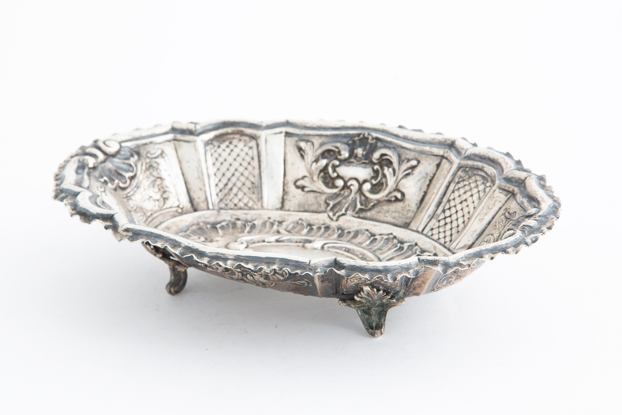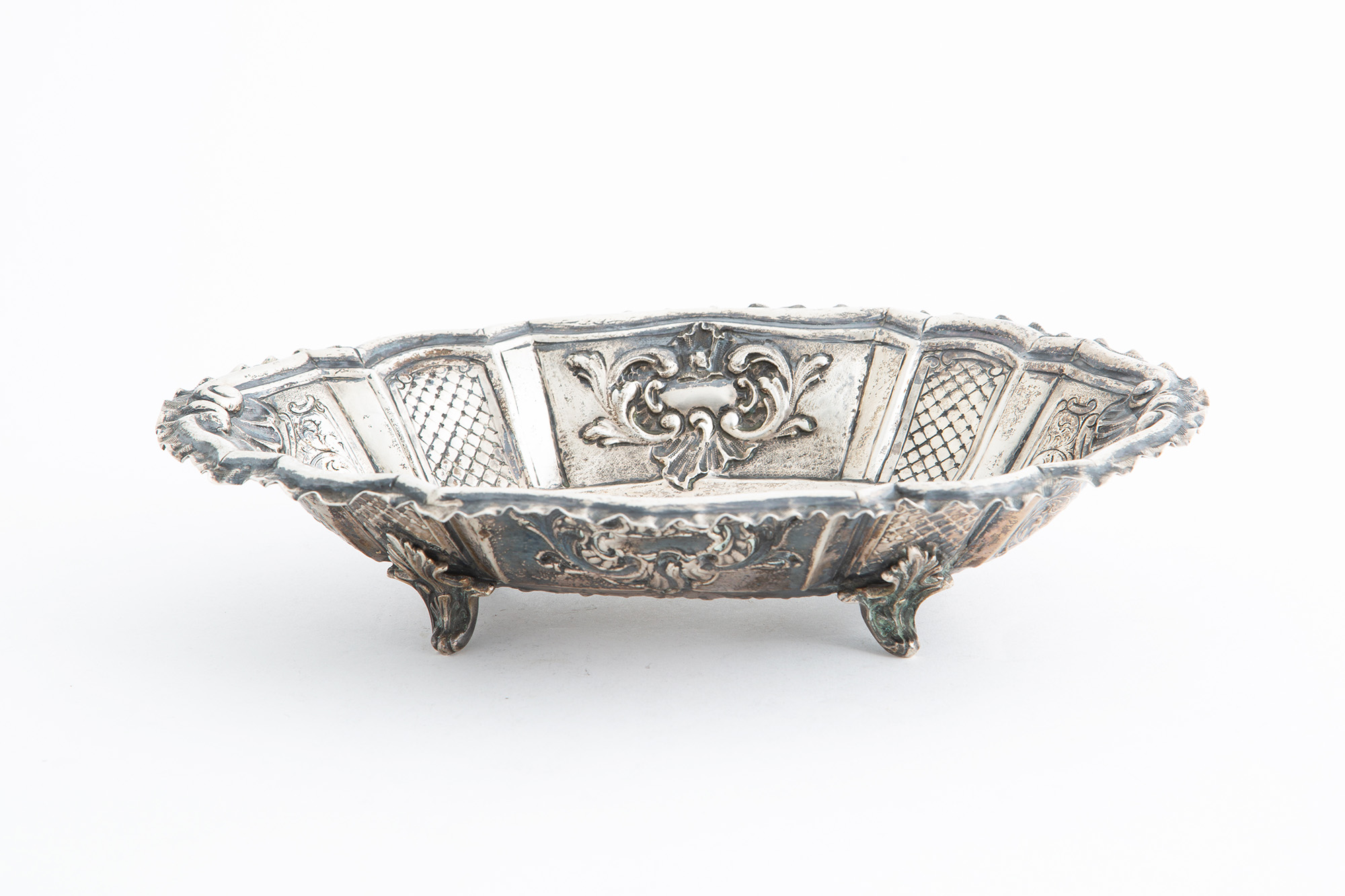 Alzatina ovale in argento sbalzato, gr. 425 ca. XX secolo. Mis. Lung. cm. 30 Alt. cm. 7 Prof. cm. 21 ca.