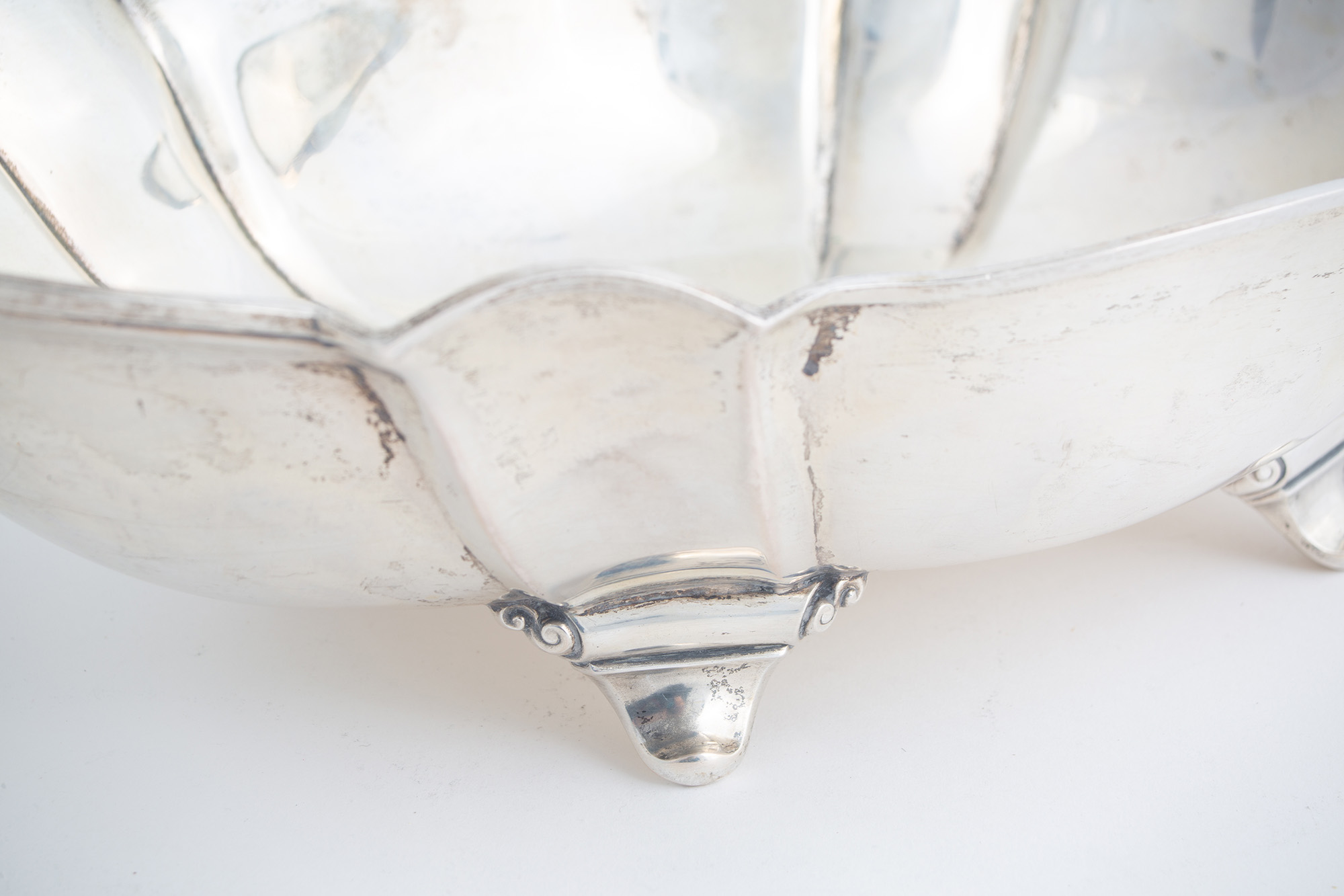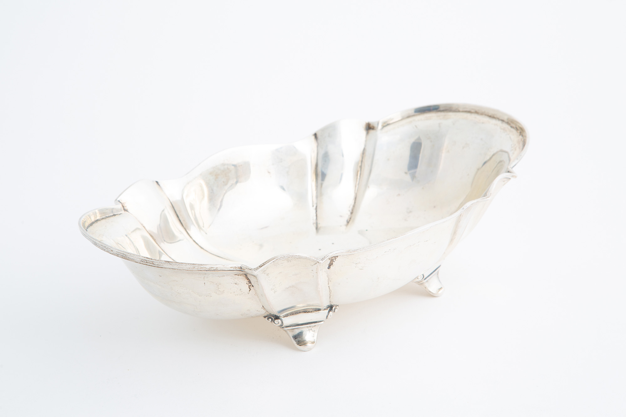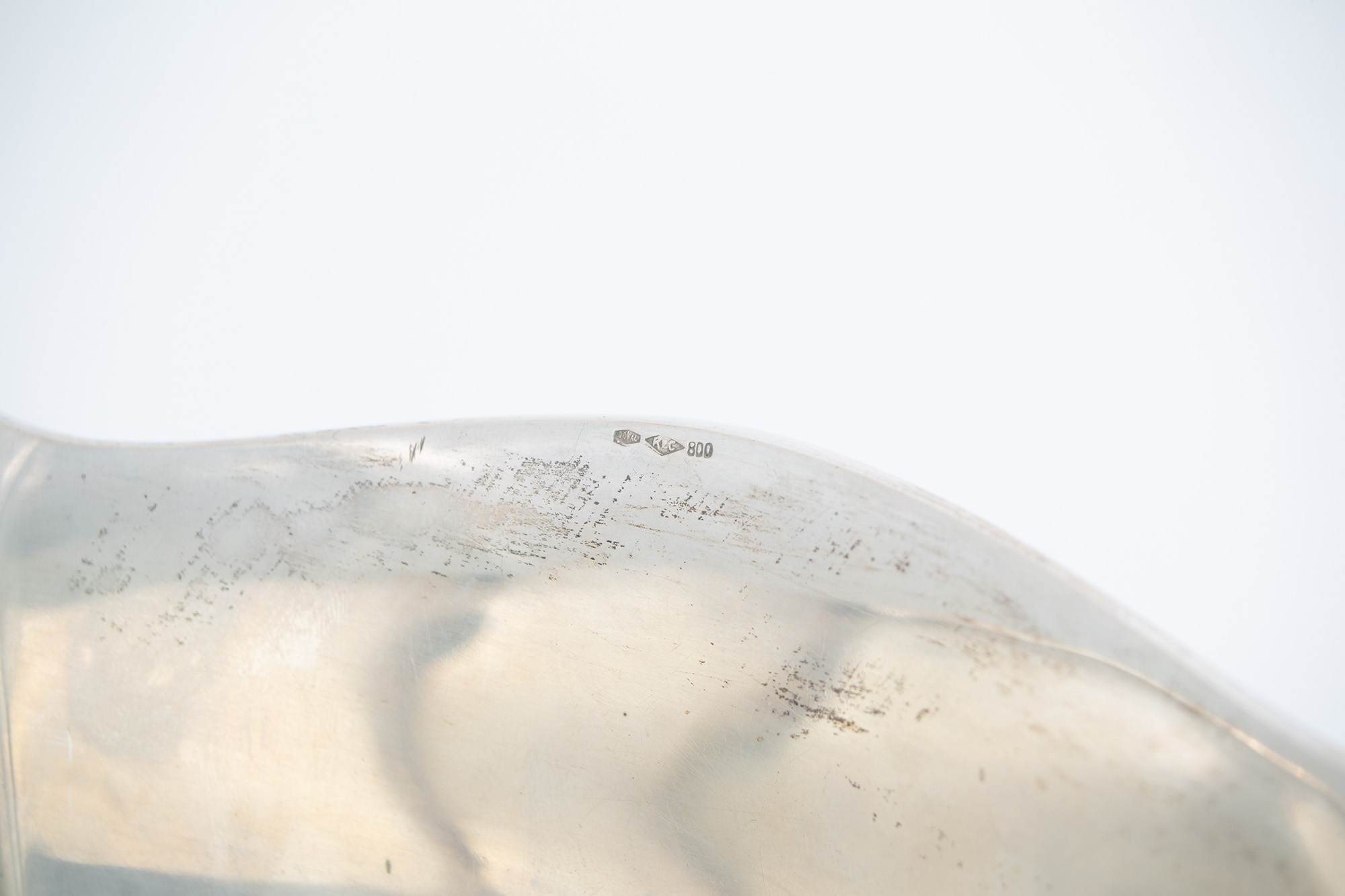 Alzatina ovale con bordo polilobato in argento 800 sbalzato, gr. 540 ca. Punzoni sotto sul bordo. XX secolo. Mis. Lung. cm. 35 Alt. cm. 9.5 Prof. cm. 20.5 ca.