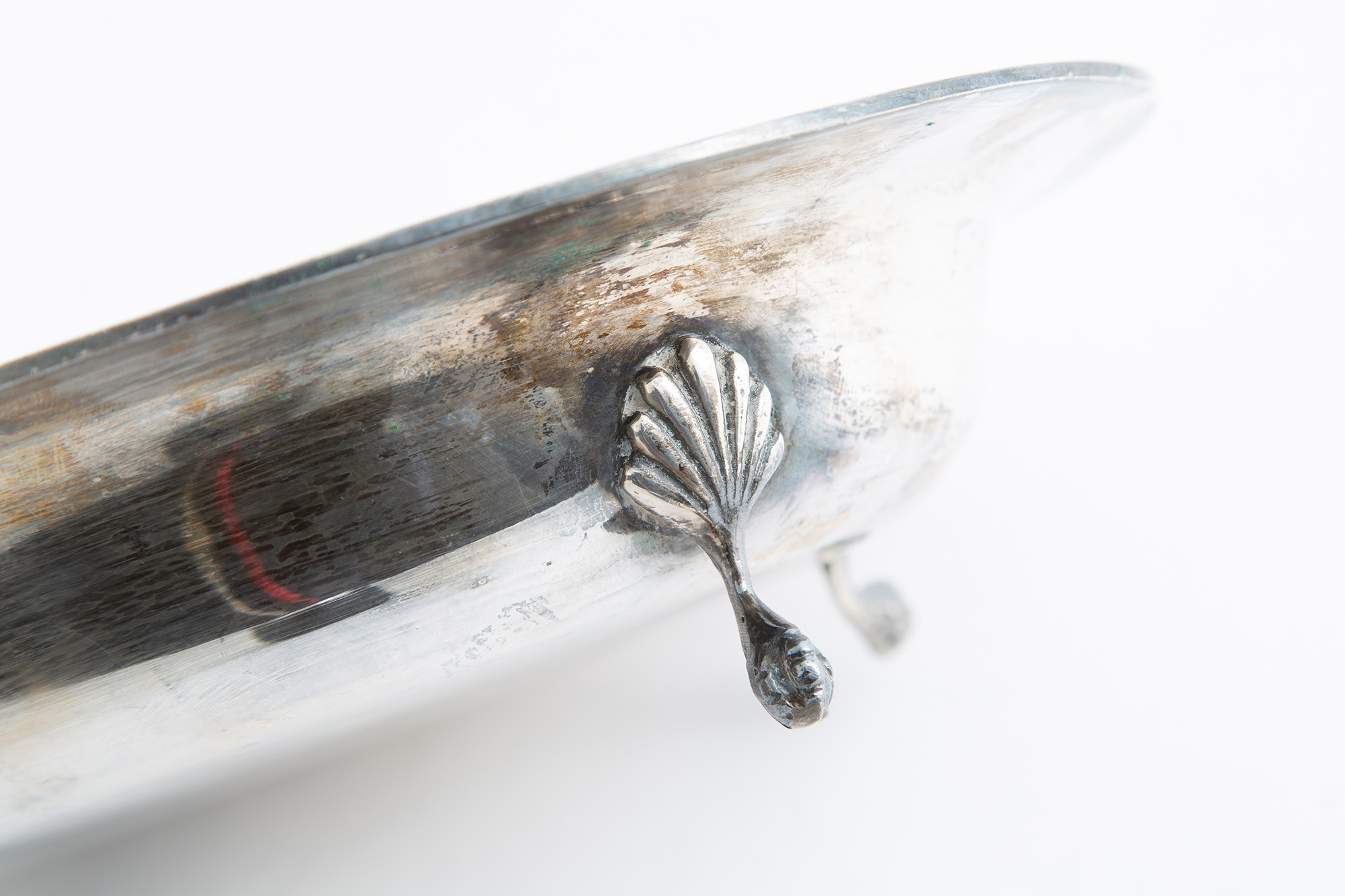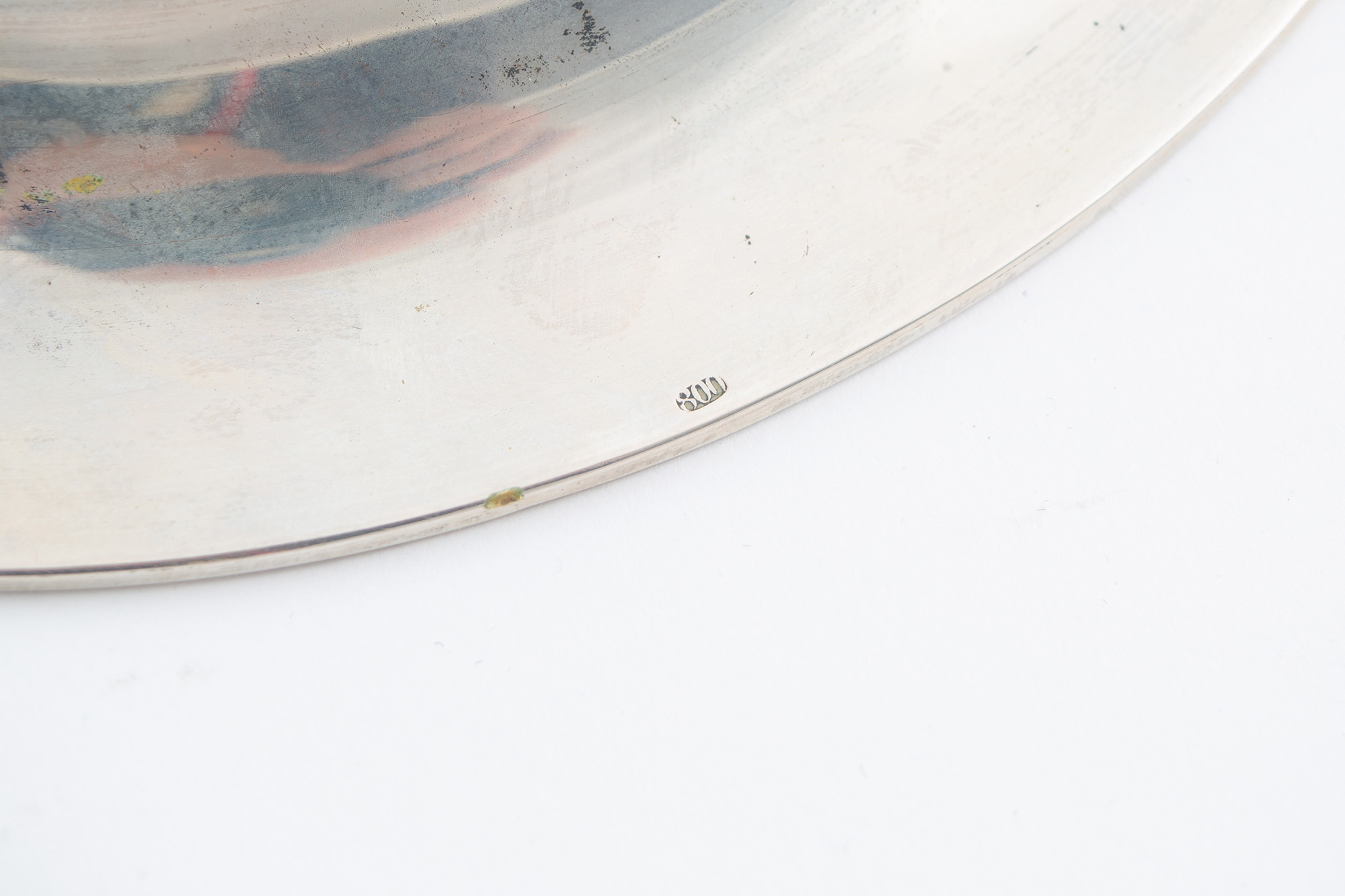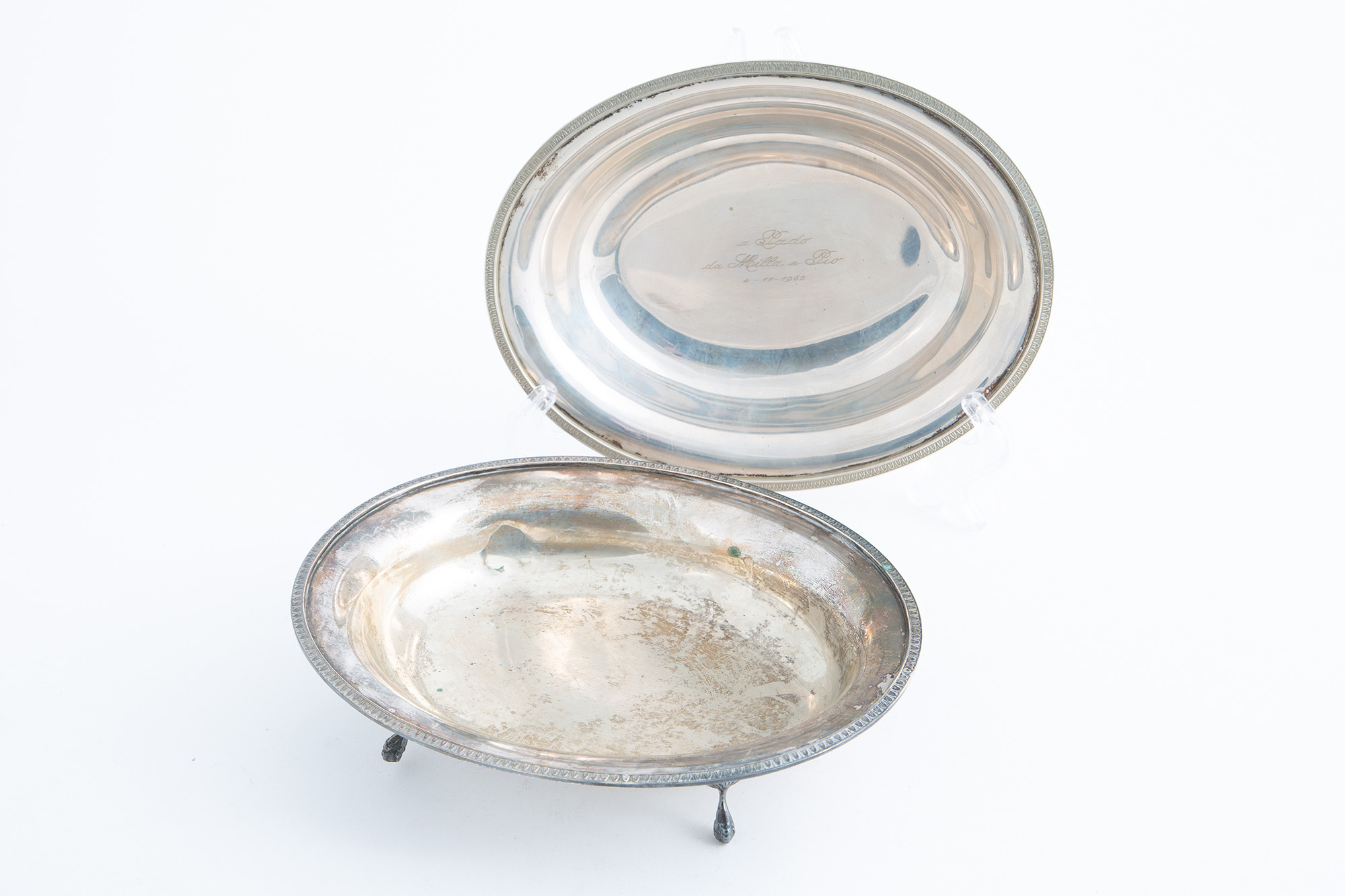 Due alzatine ovali in argento 800 cesellato, gr. 800 ca. XX secolo. Mis. Lung. cm. 26 Alt. cm. 6 Prof. cm. 21 ca.