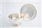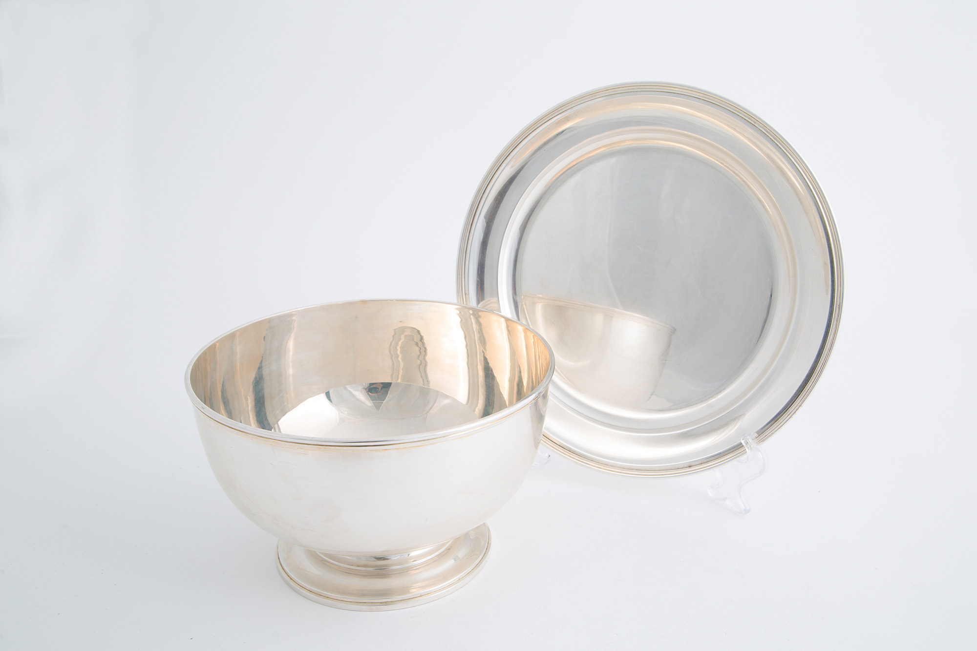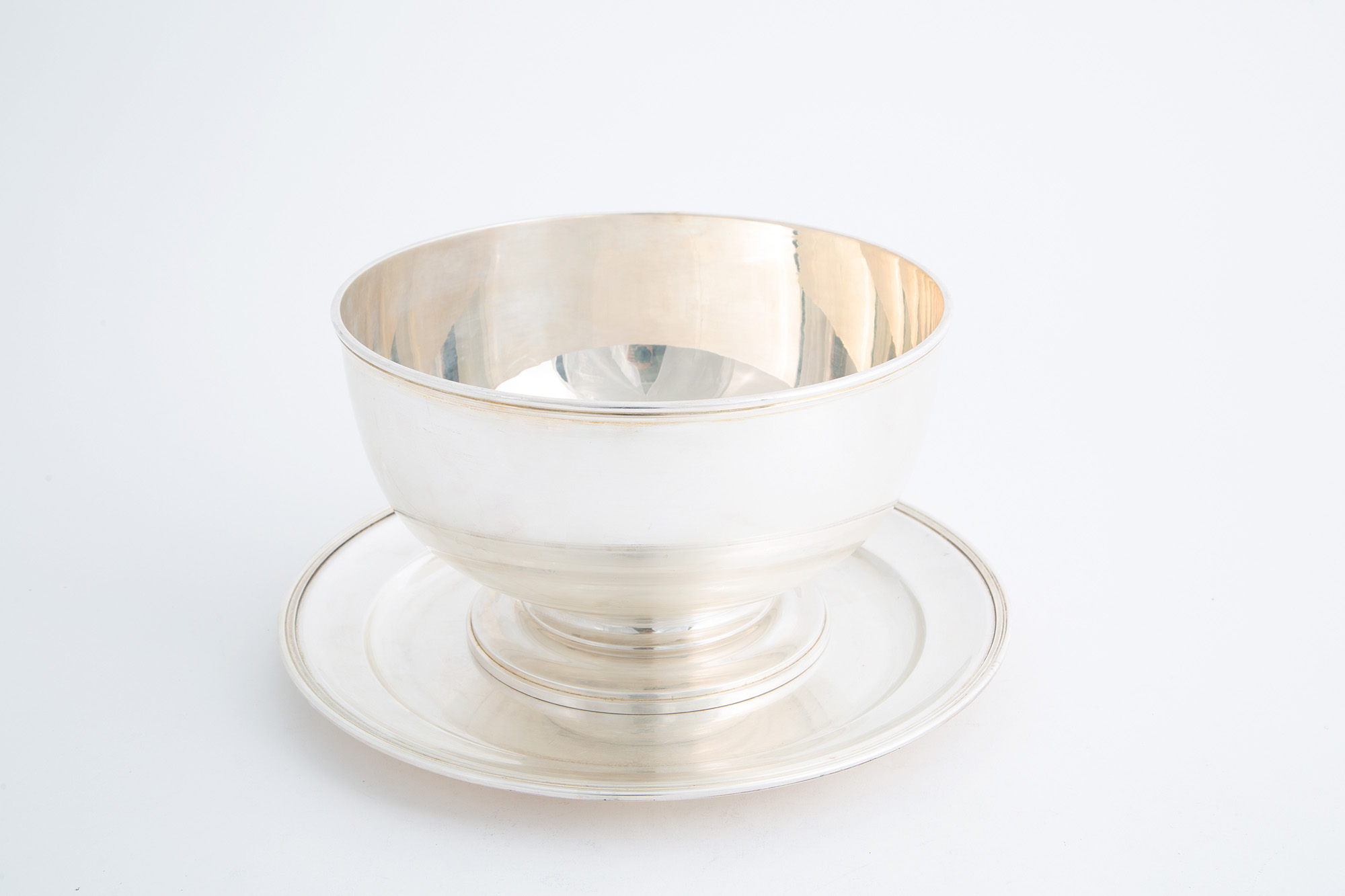 Cachepot con piatto tondo in argento 800, gr. 1980 ca. complessivi. Argentiere MIRACOLI, Milano. XX secolo. Mis. Alt. cm. 17 Diam. cm. 32.5 ca.
