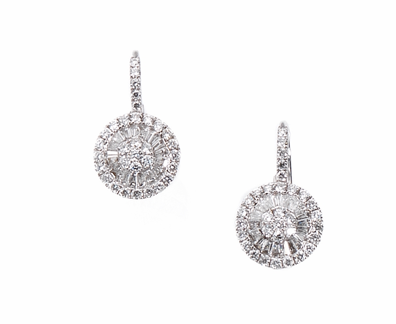 realizzati con una monachella decorata da un dischetto in diamanti baguette e brillanti sormontata da una linea di brillanti per ct 1,17