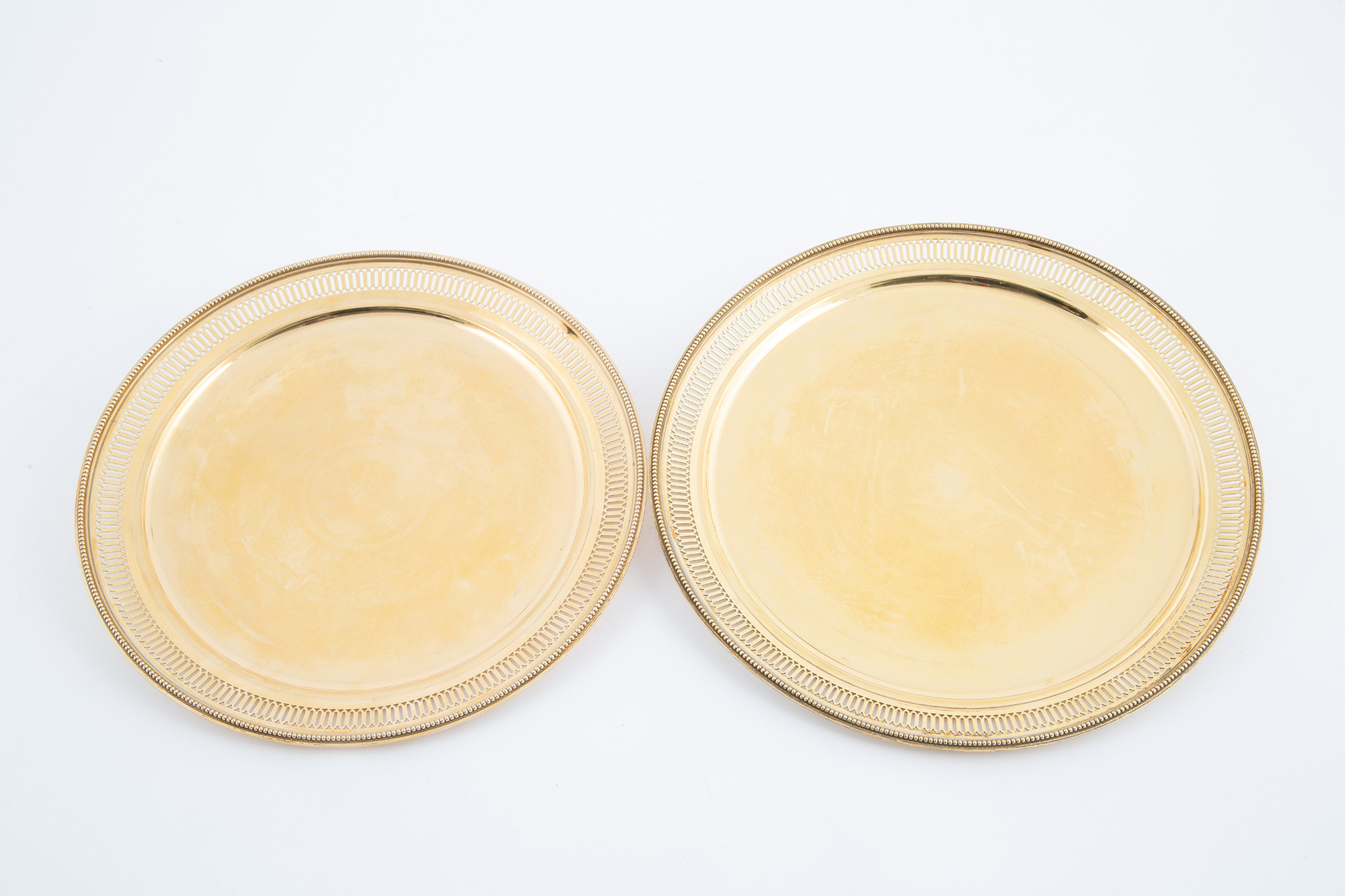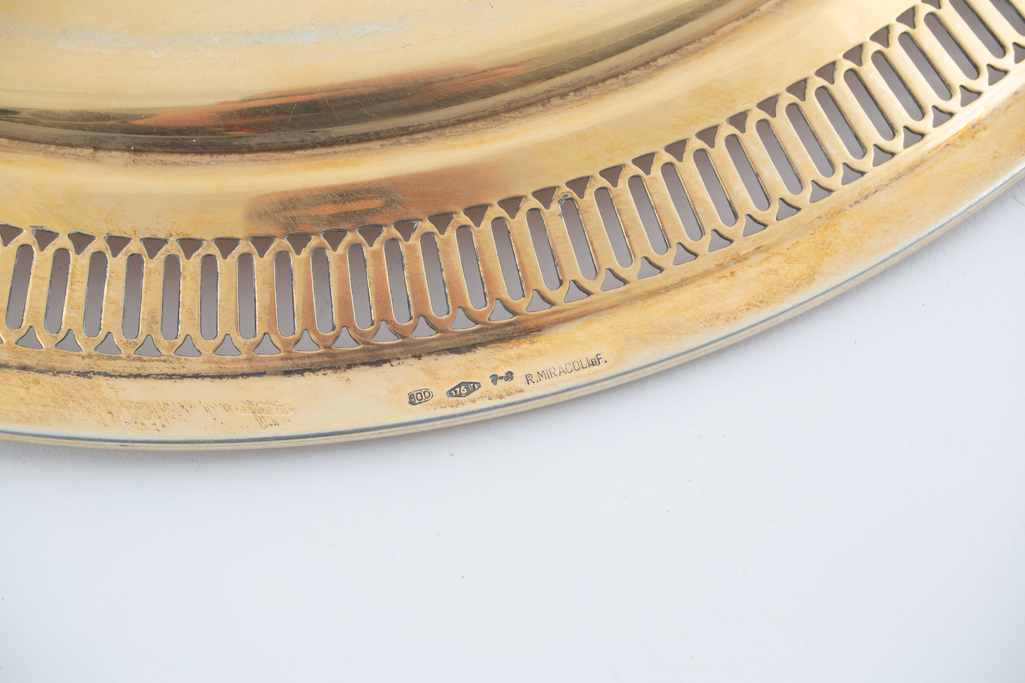 Tre piatti in argento 800 dorato e traforato, gr. 1850 ca. complessivi. Argentiere MIRACOLI, Milano. Punzoni sul bordo. Inizi XX secolo. Mis. Diam. cm. 31 ca.