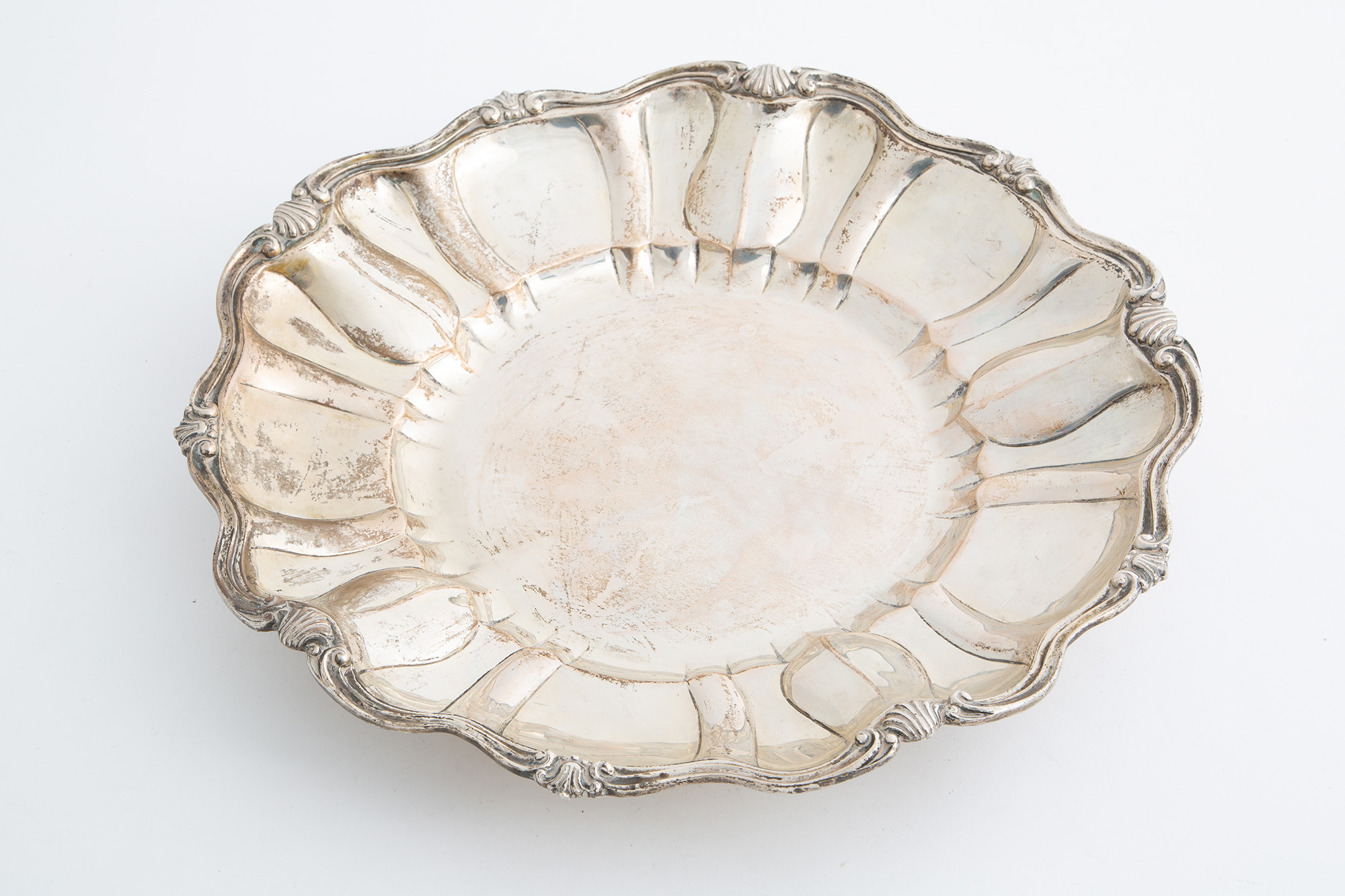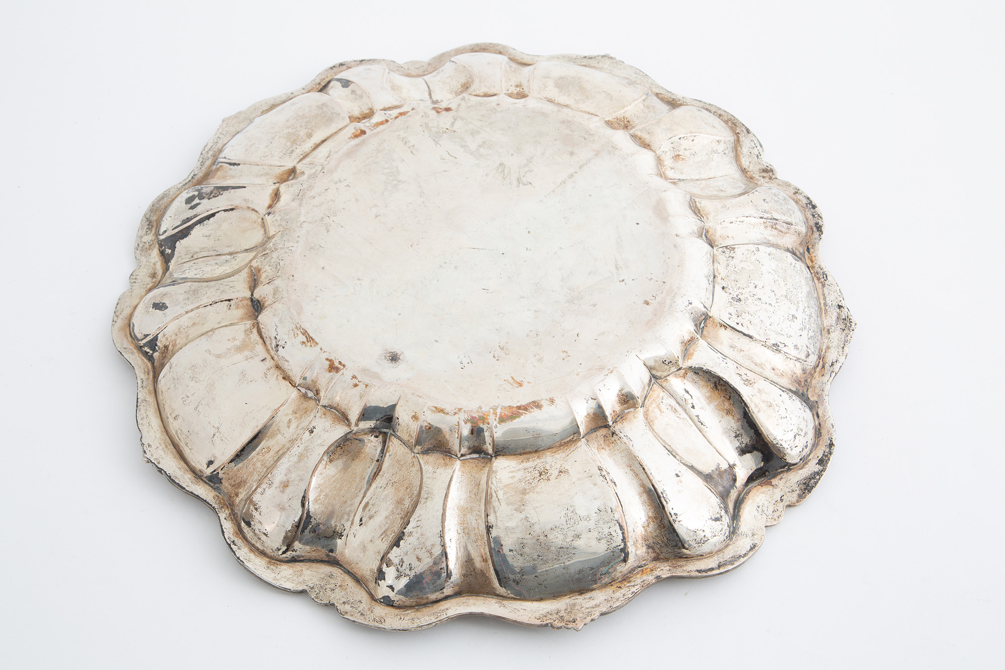 Piatto concavo da parata in argento sbalzato con bordi polilobati, gr. 2170 ca. Inizi XX secolo. Mis. Diam. cm. 46 ca.