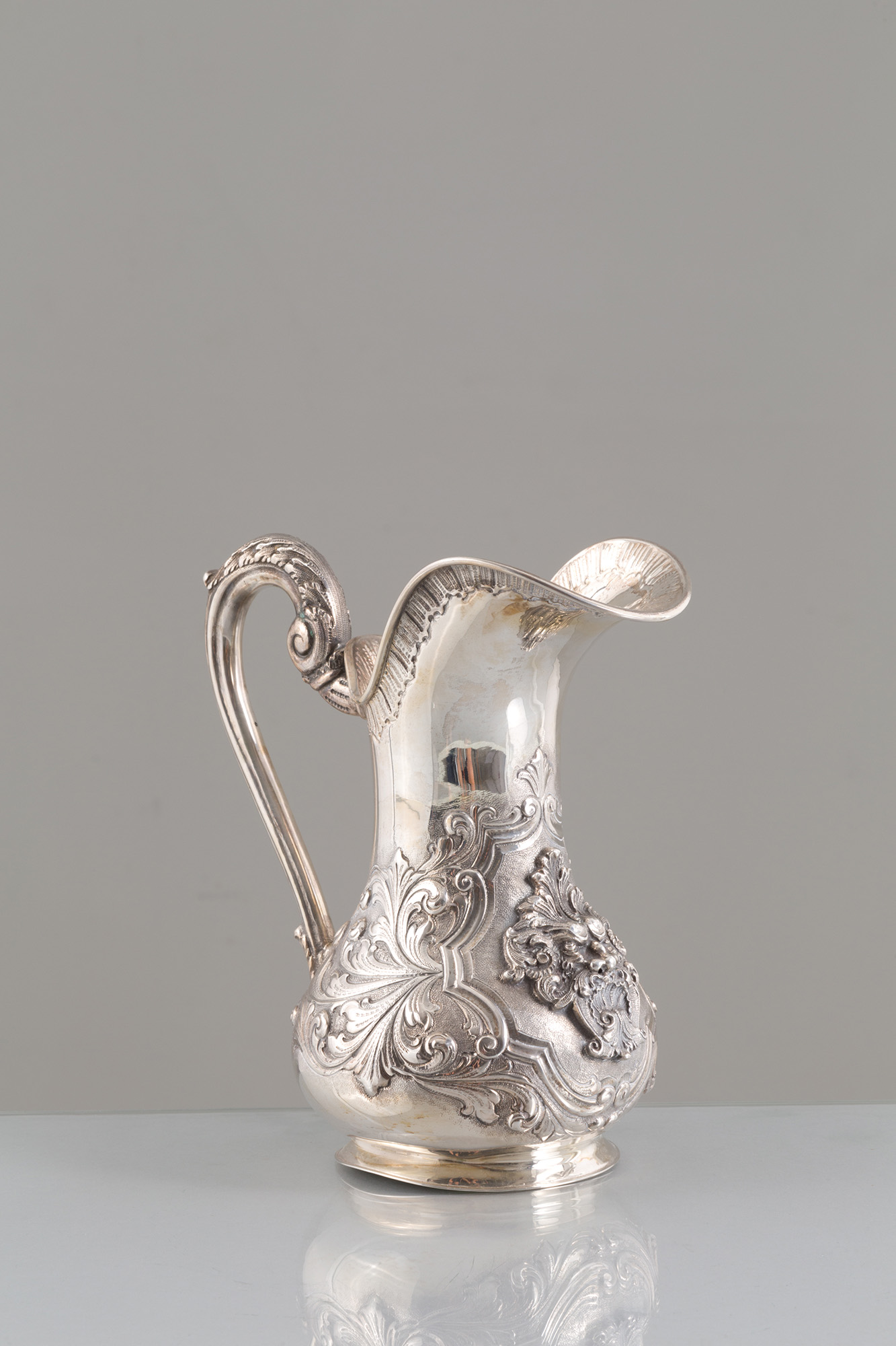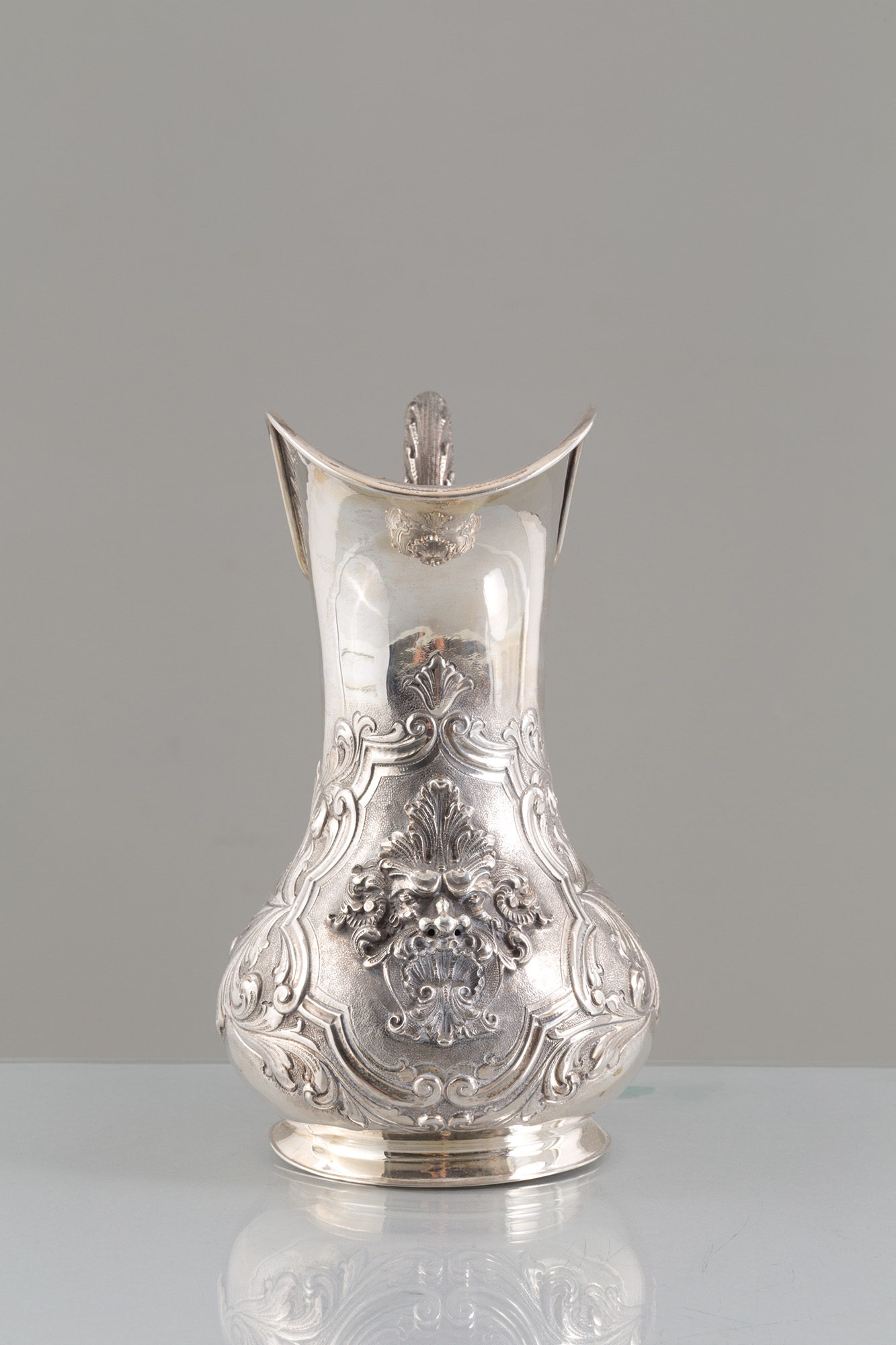 Brocca in argento 800 sbalzato e finemente cesellato, gr. 960 ca. XX secolo. Mis. Lung. cm. 23 Alt. cm. 22 ca.