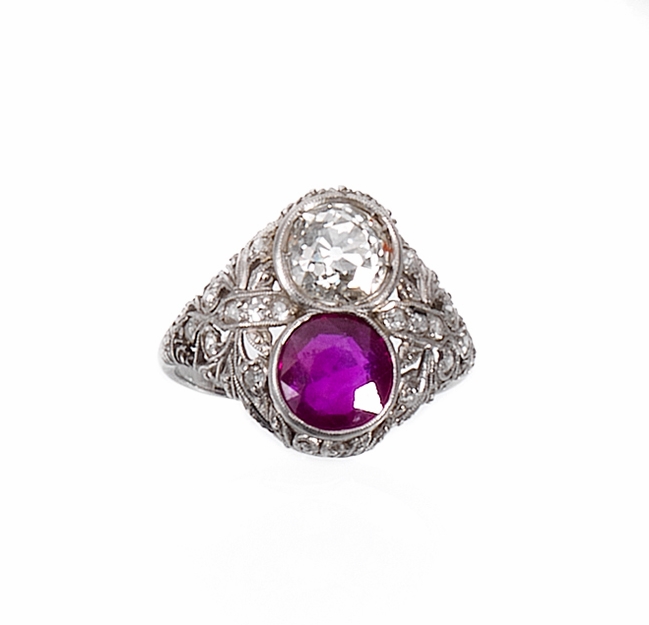 Anello, inizi sec. XX, in oro bianco, rubino e diamanti