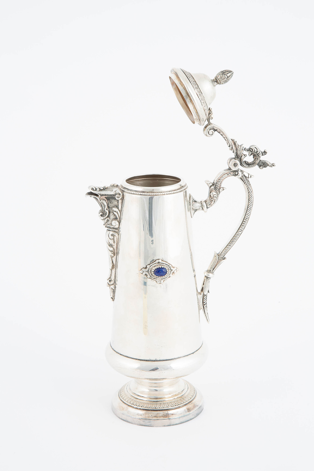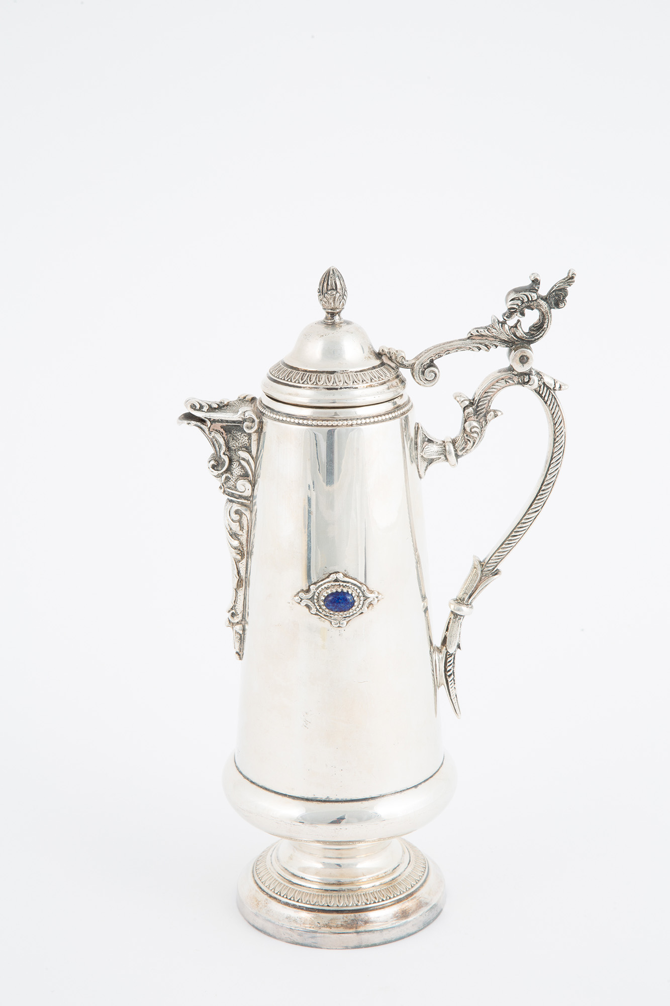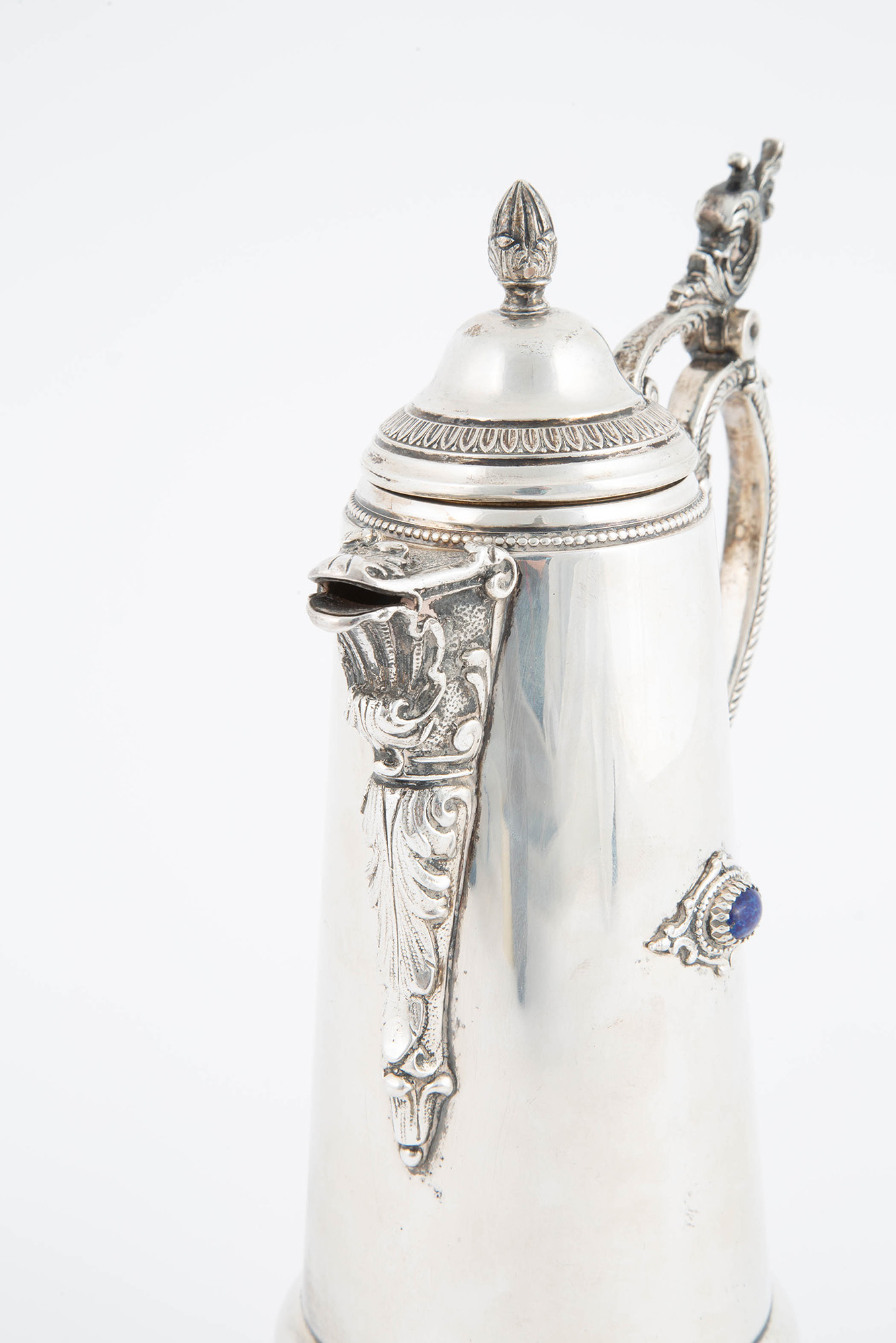 Caffettiera in argento 800 cesellato con cabochon in lapislazzulo, gr. 750 ca. Punzoni sul fondo. XX secolo.