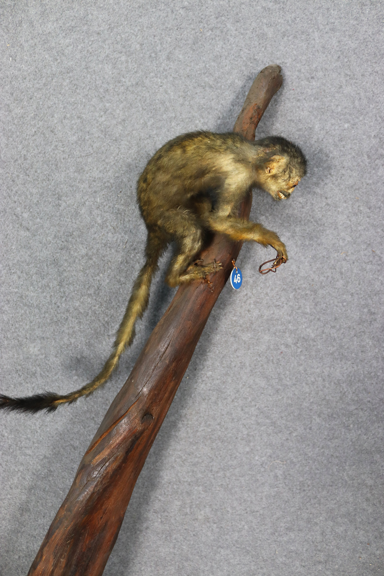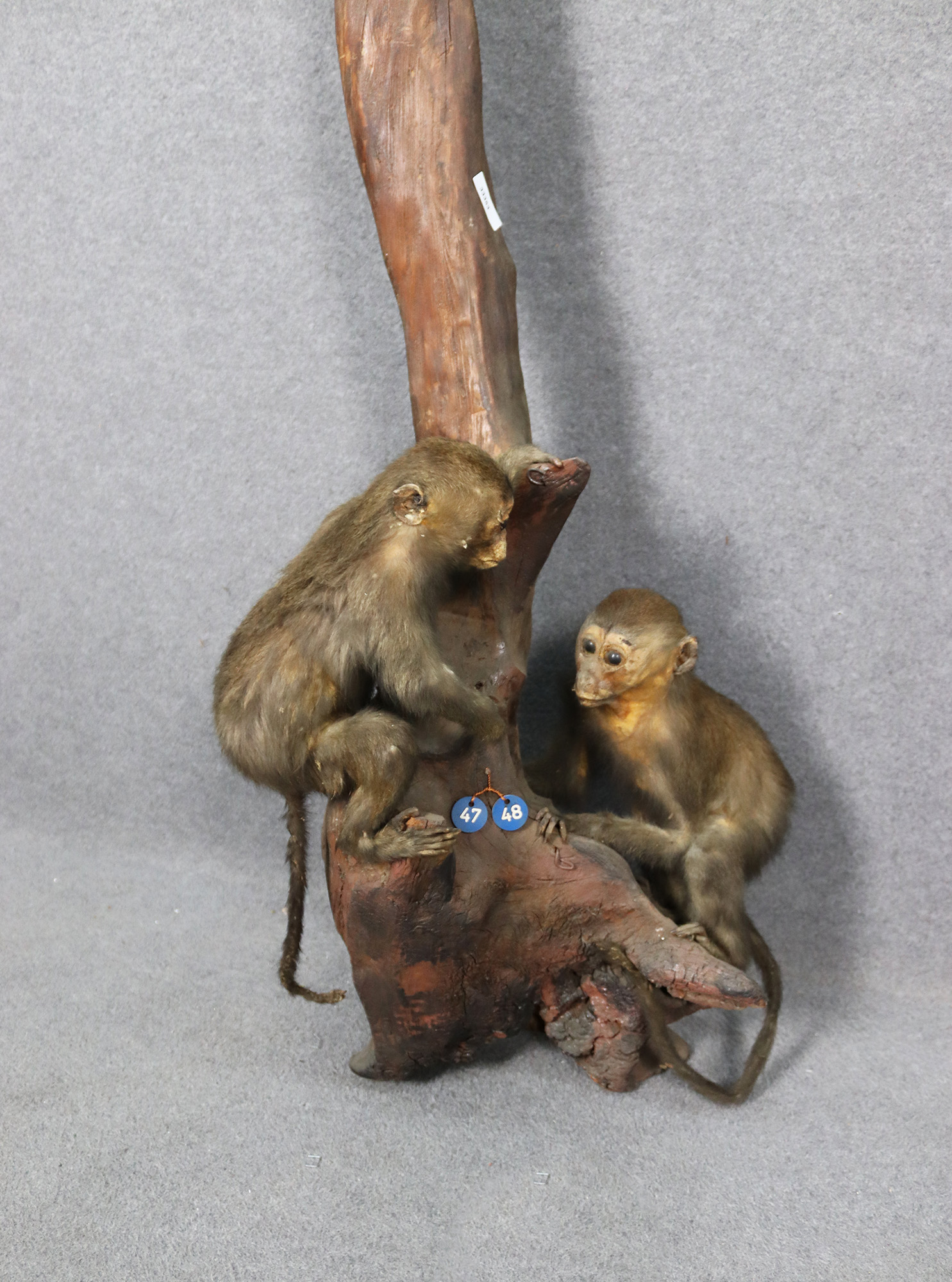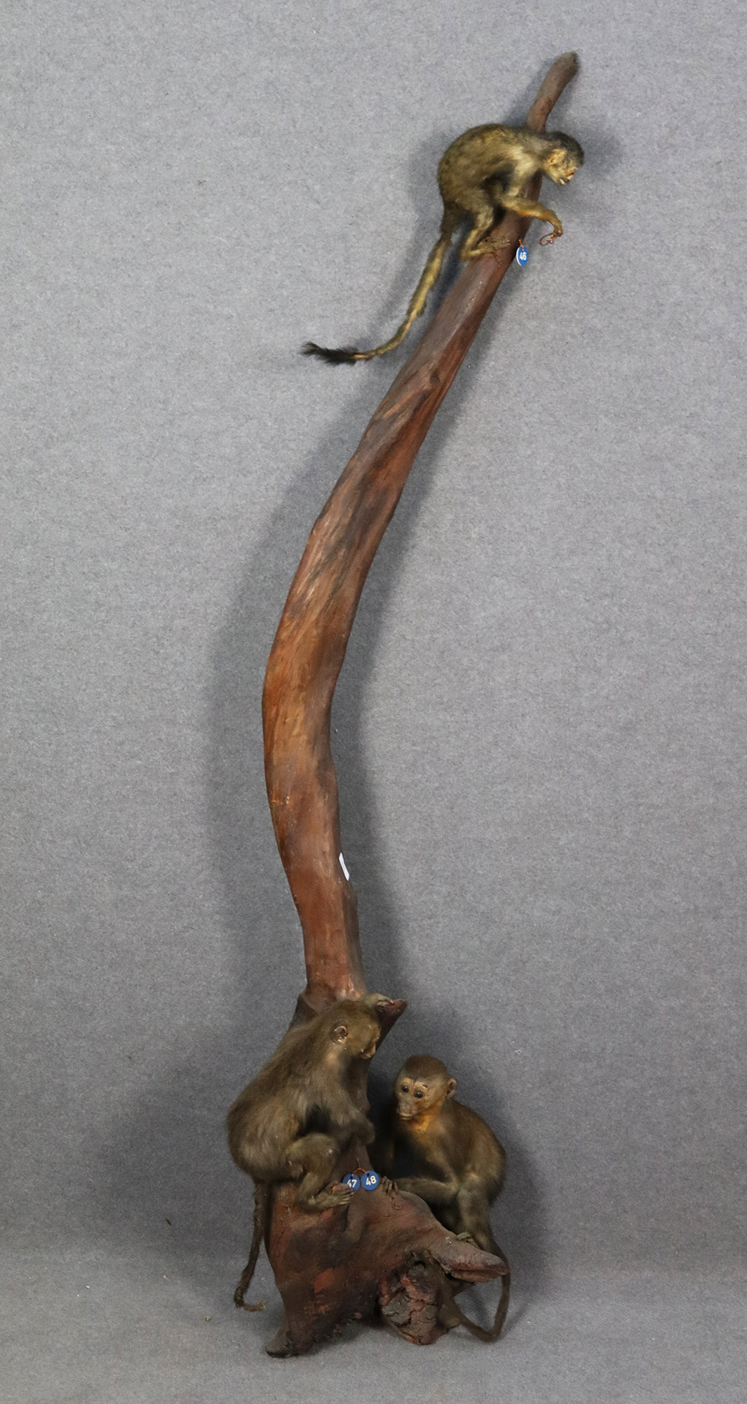 Tre macachi (Lemur macaco) tassidermizzati su ramo d'albero. Mis. Lung. cm. 41 Alt. cm. 170 Prof. cm. 36 ca.