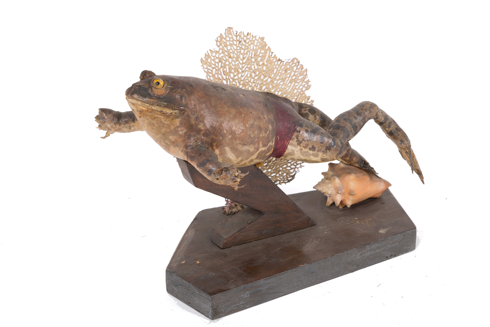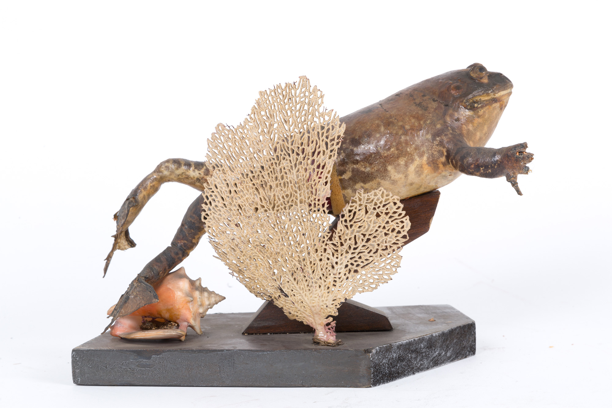 Rana toro (Lithobates catesbeianus) tassidermizzata. Mis. Lung. cm. 30 Alt. cm. 18 Prof. cm. 18 ca.