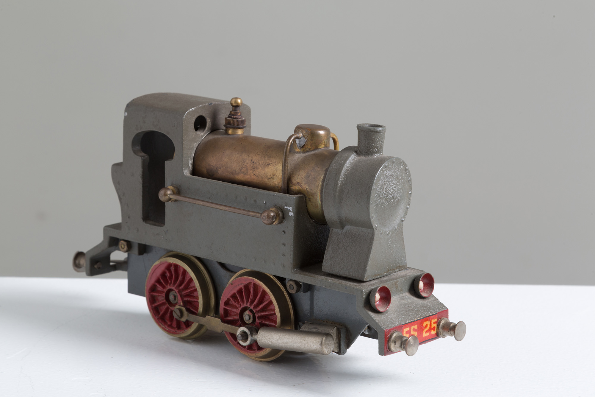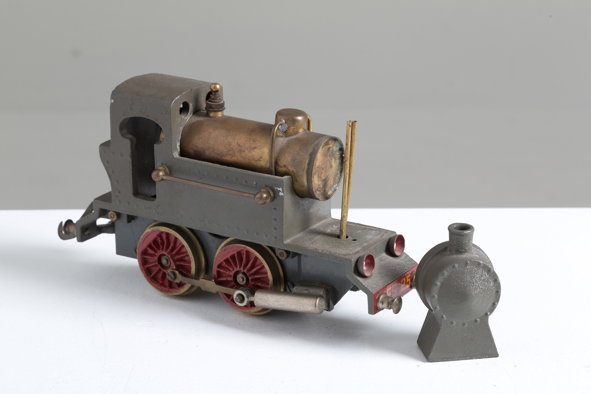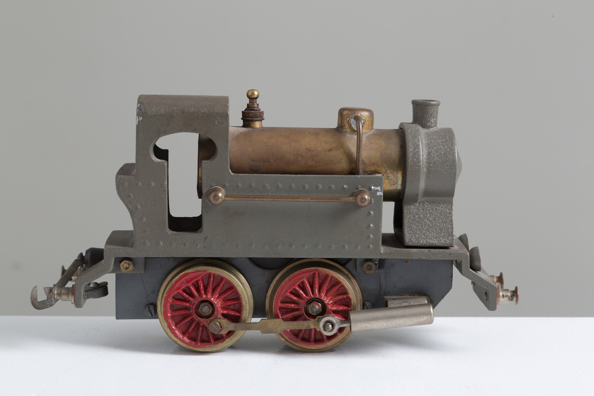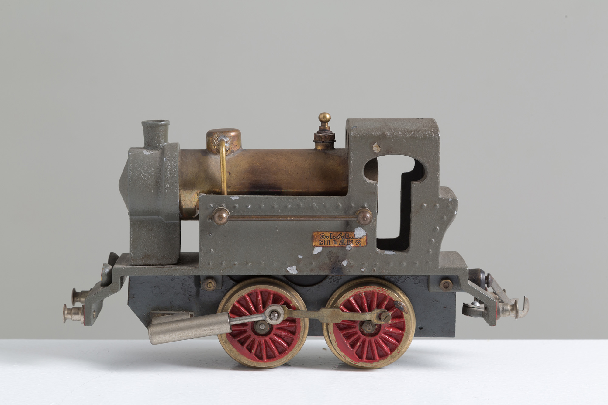 Locomotiva a vapore in ferro e ottone. Marcata G.I.S.E.A. MILANO. XX secolo. Mis. Lung. cm. 21 Alt. cm. 11 Prof. cm. 6 ca.