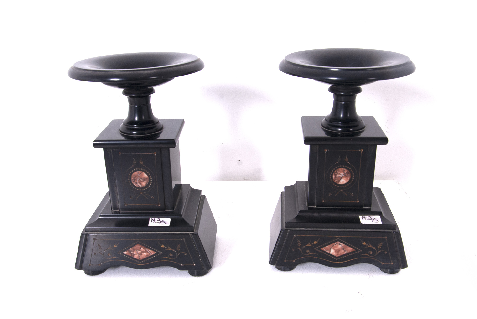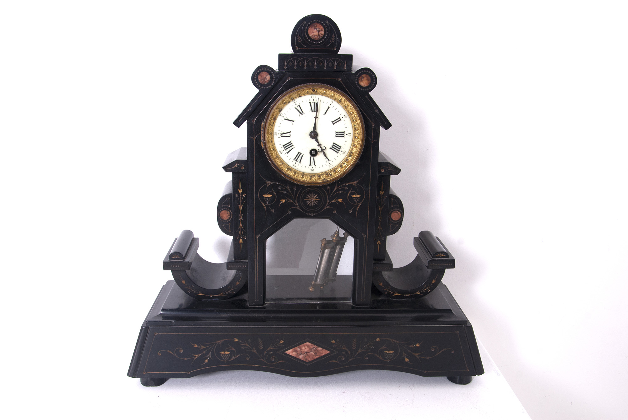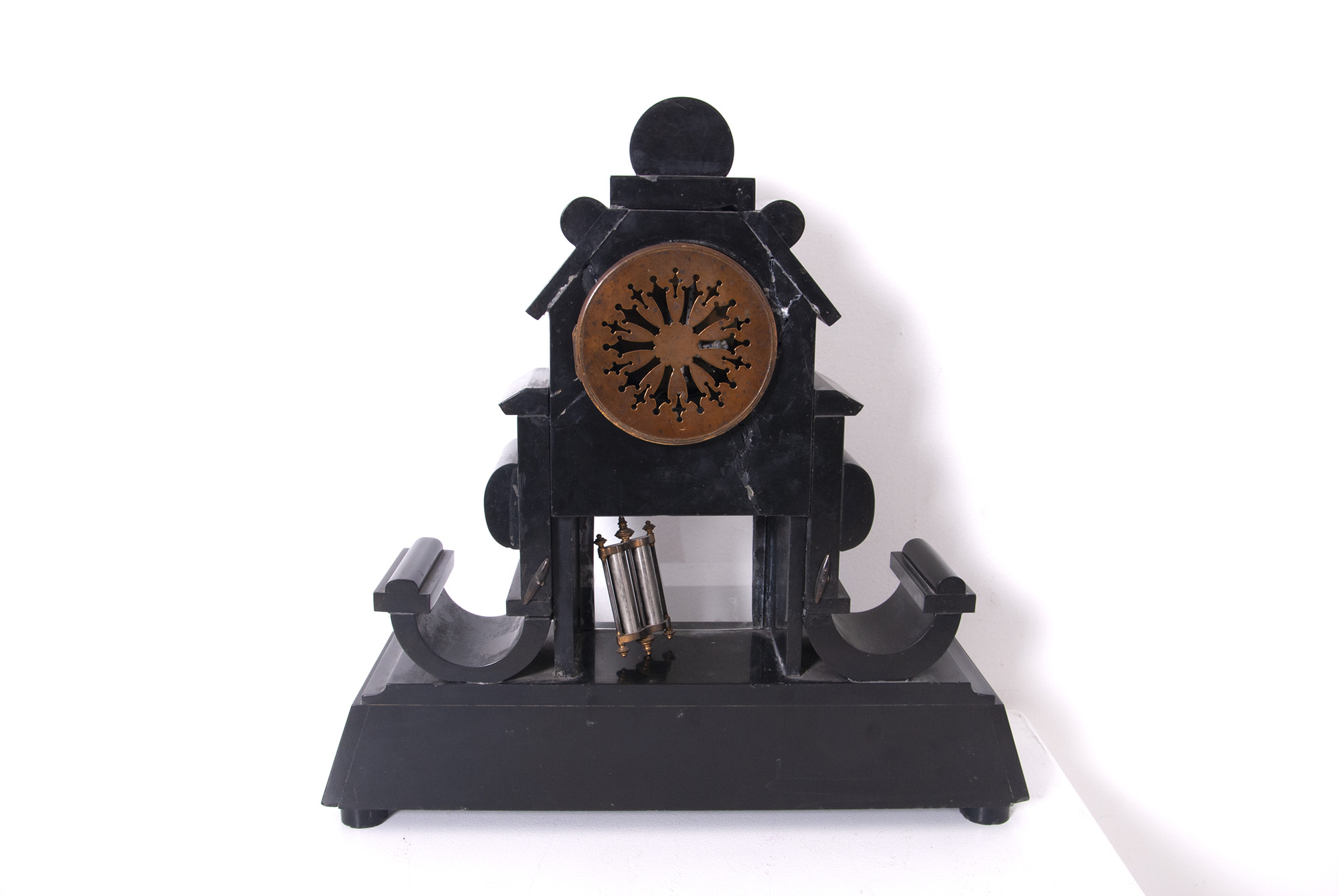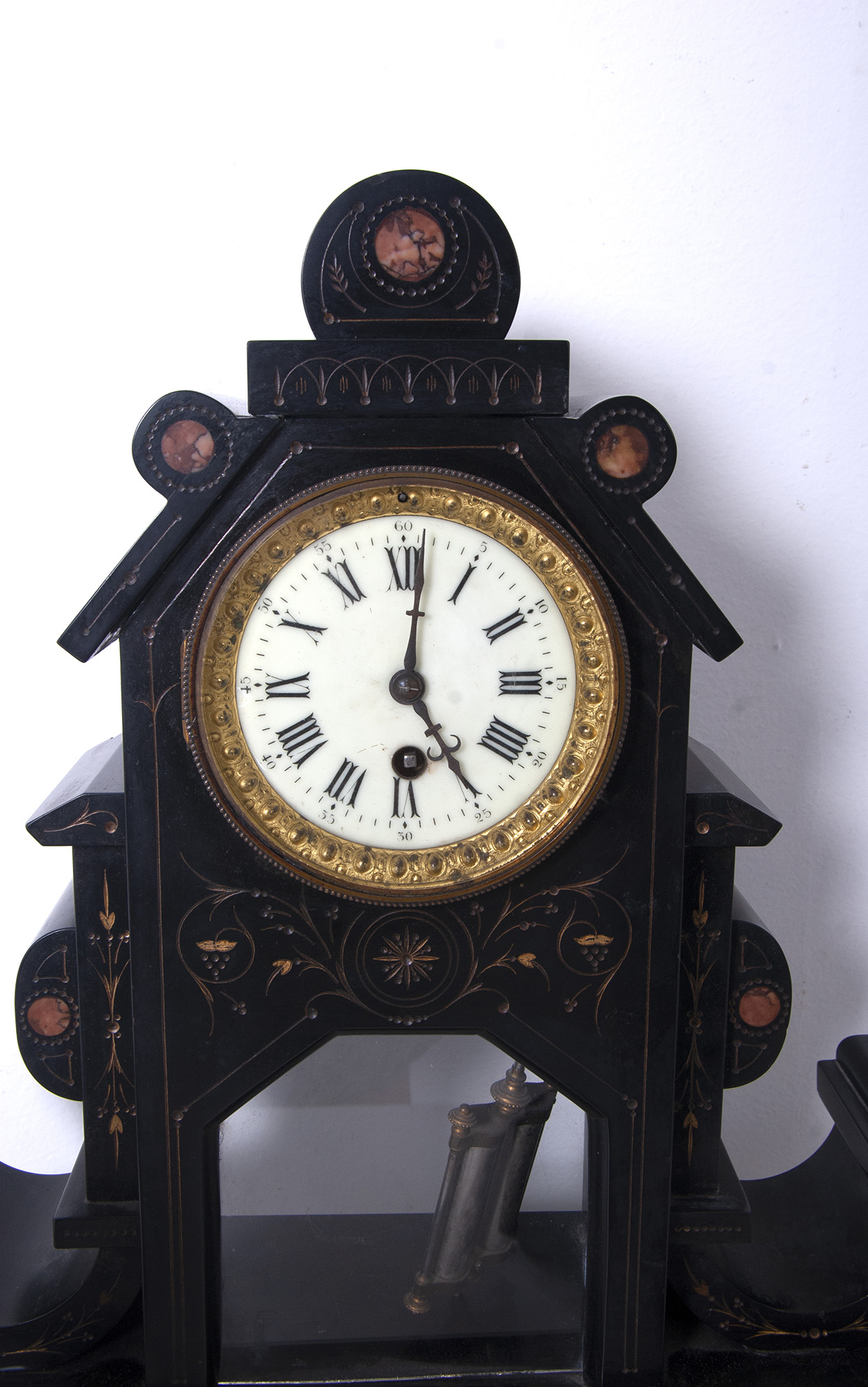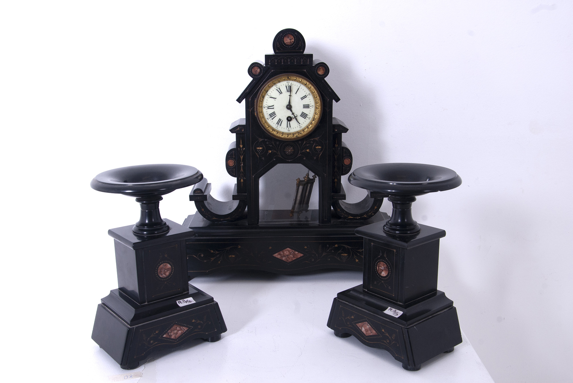 Trittico composto da orologio (Mis. Alt. cm. 47 ca.) e due alzate (Mis. Alt. 27 cm ca.) in marmo nero con decorazioni incise e dorate, inserti in marmo rosa e finiture in bronzo. XIX secolo. Lievi difetti.