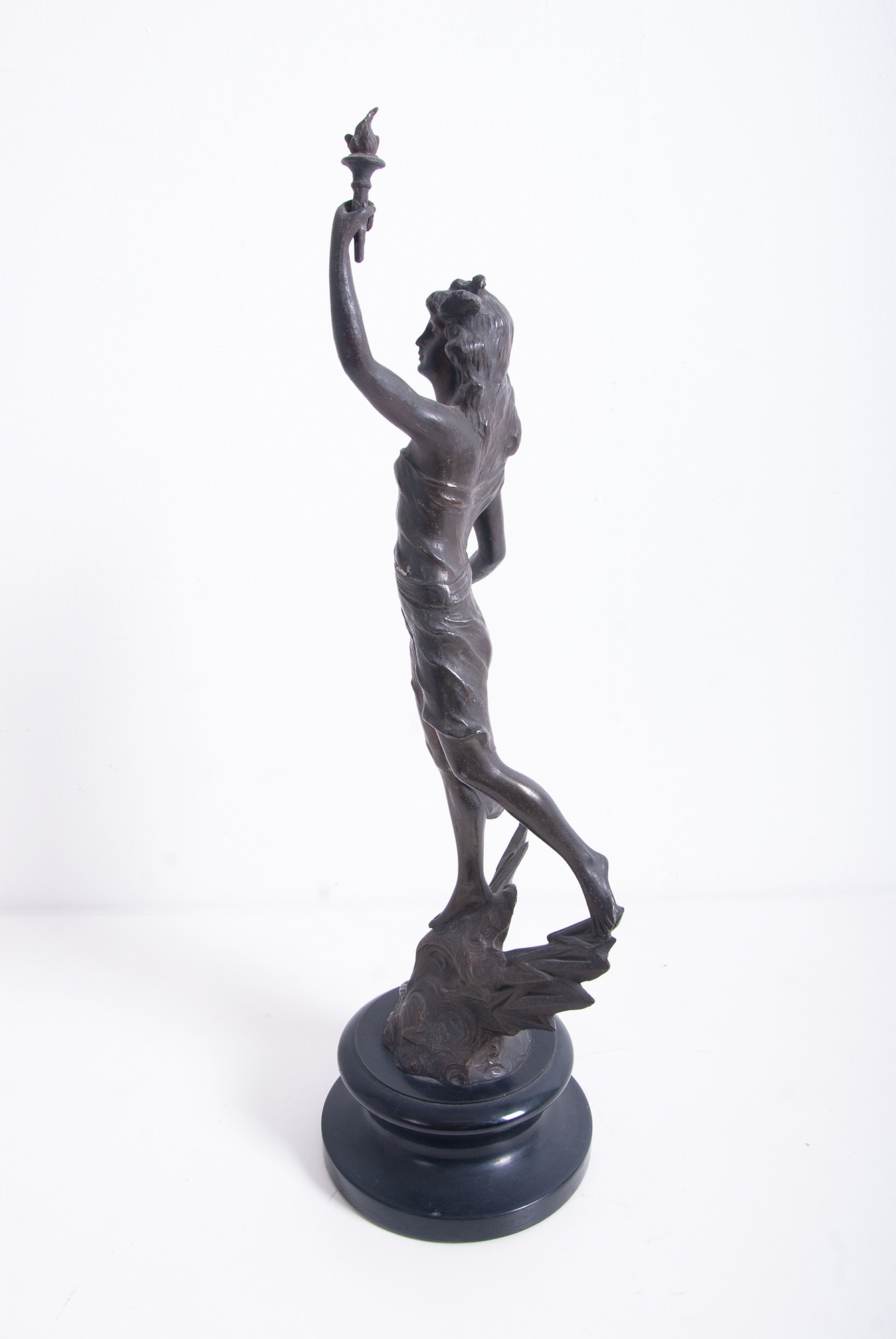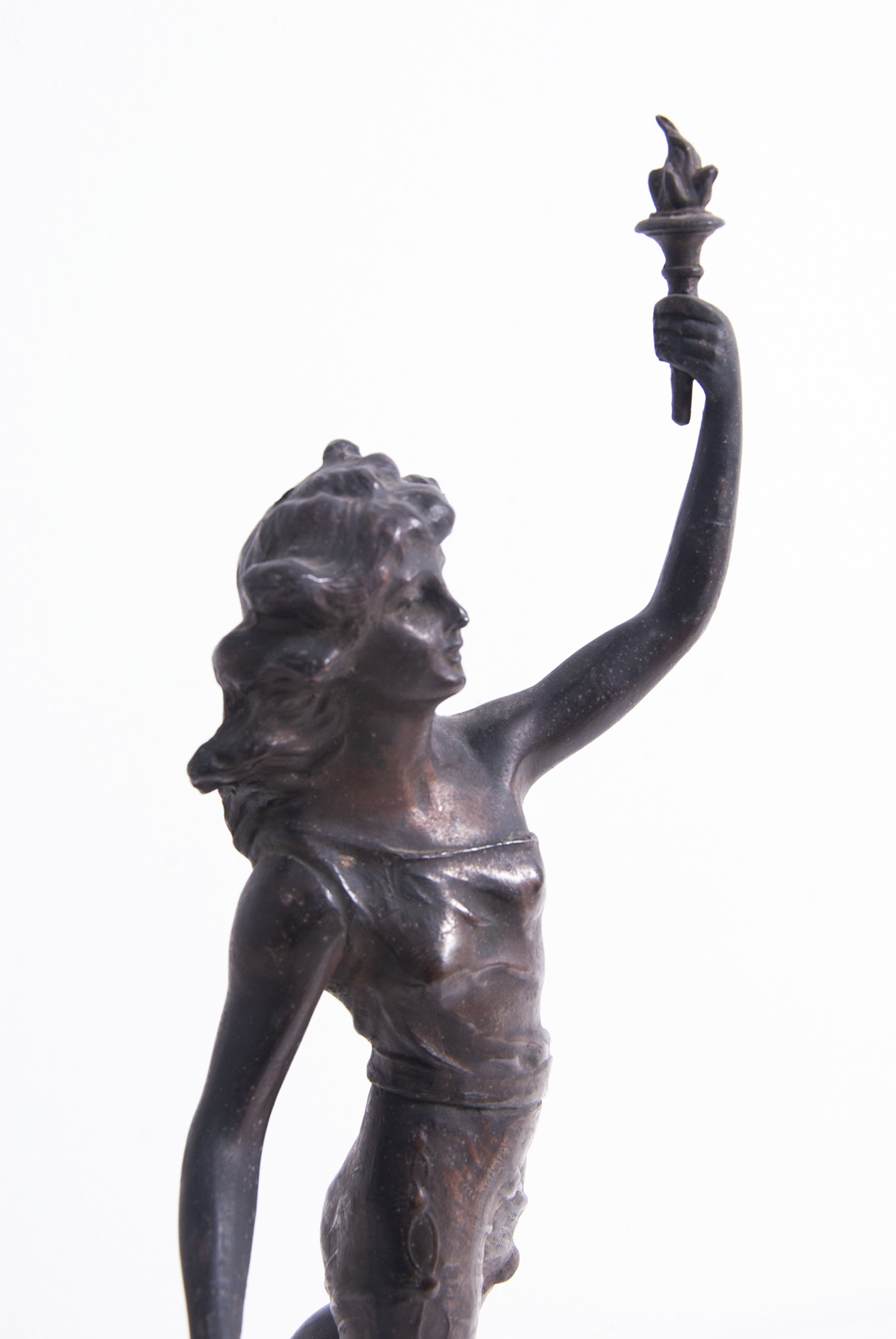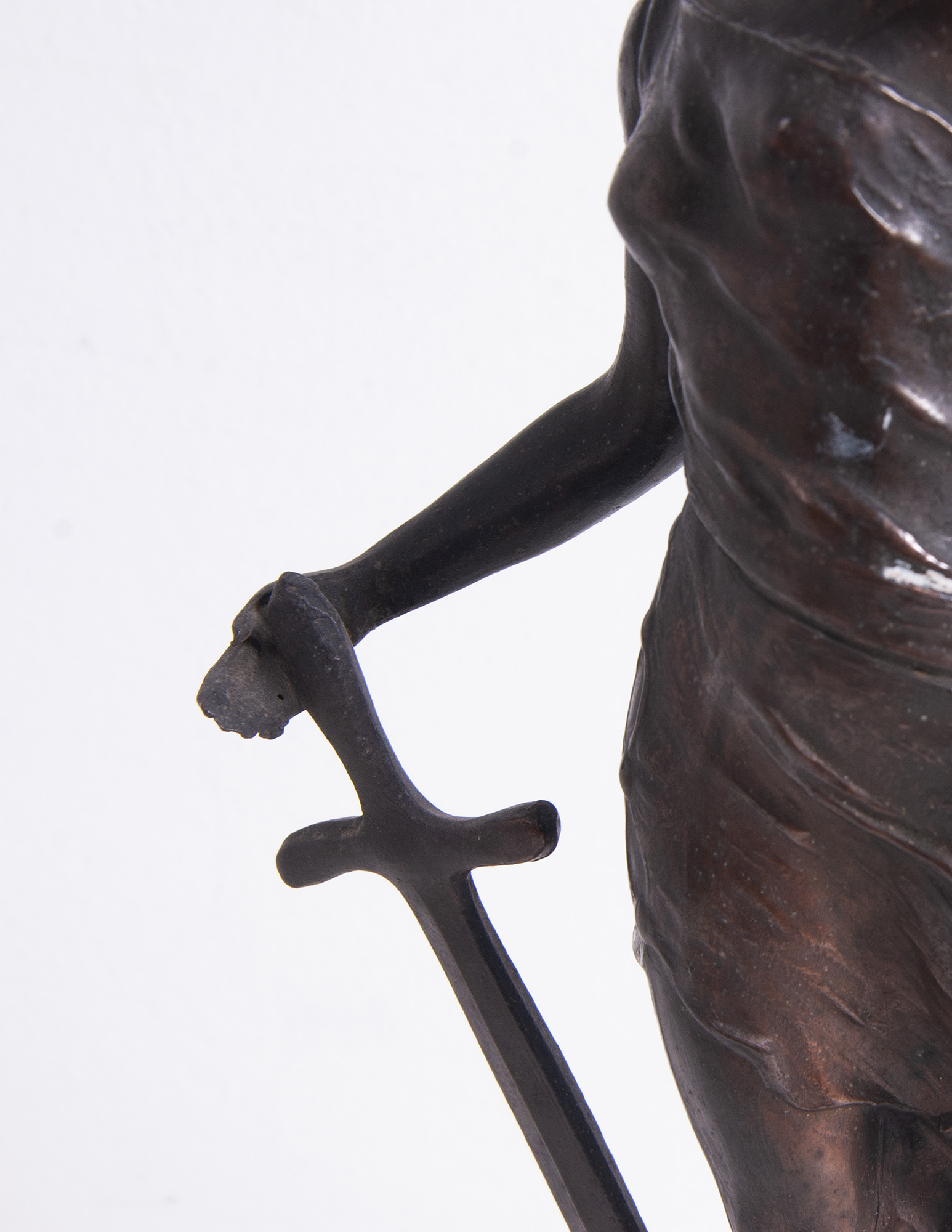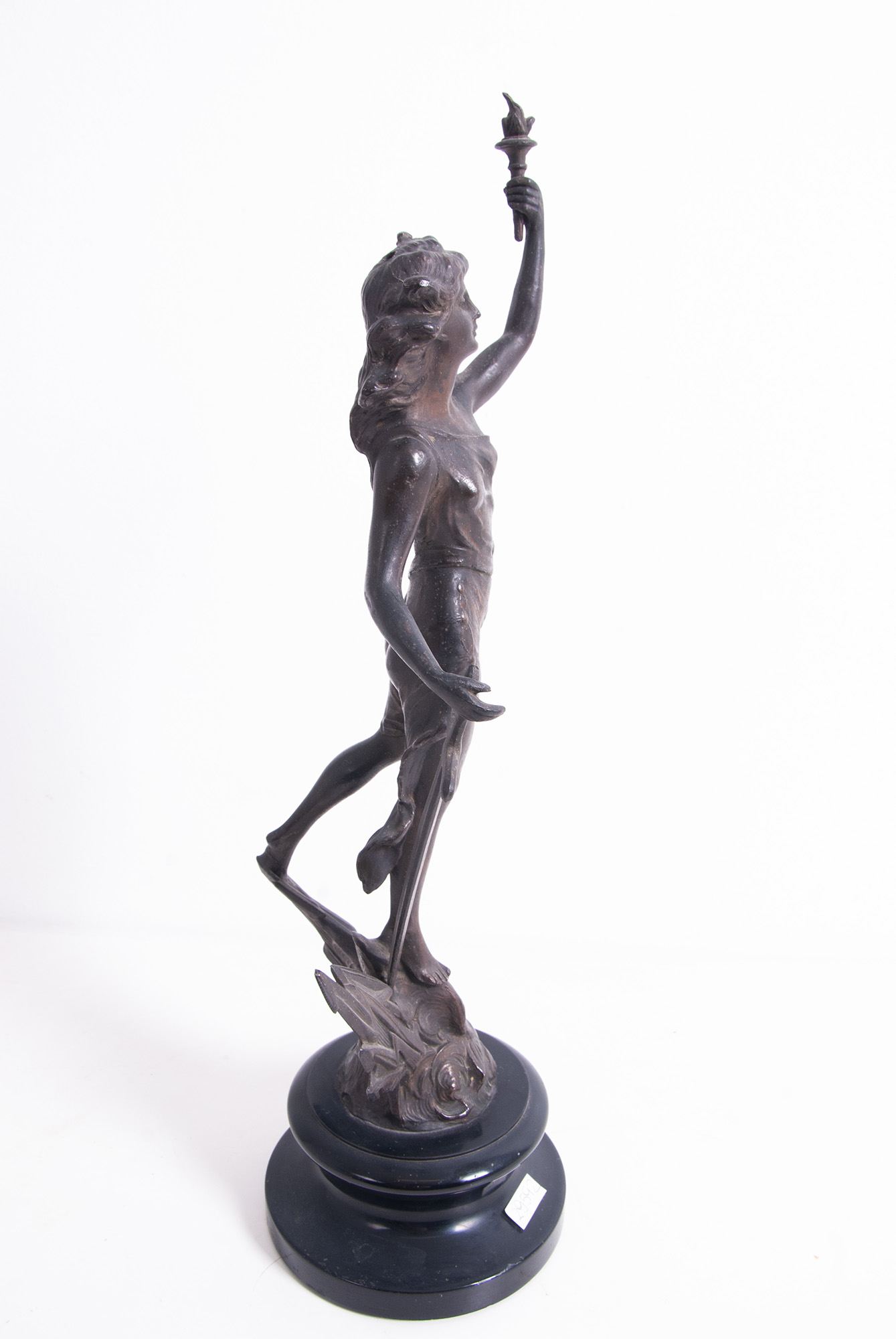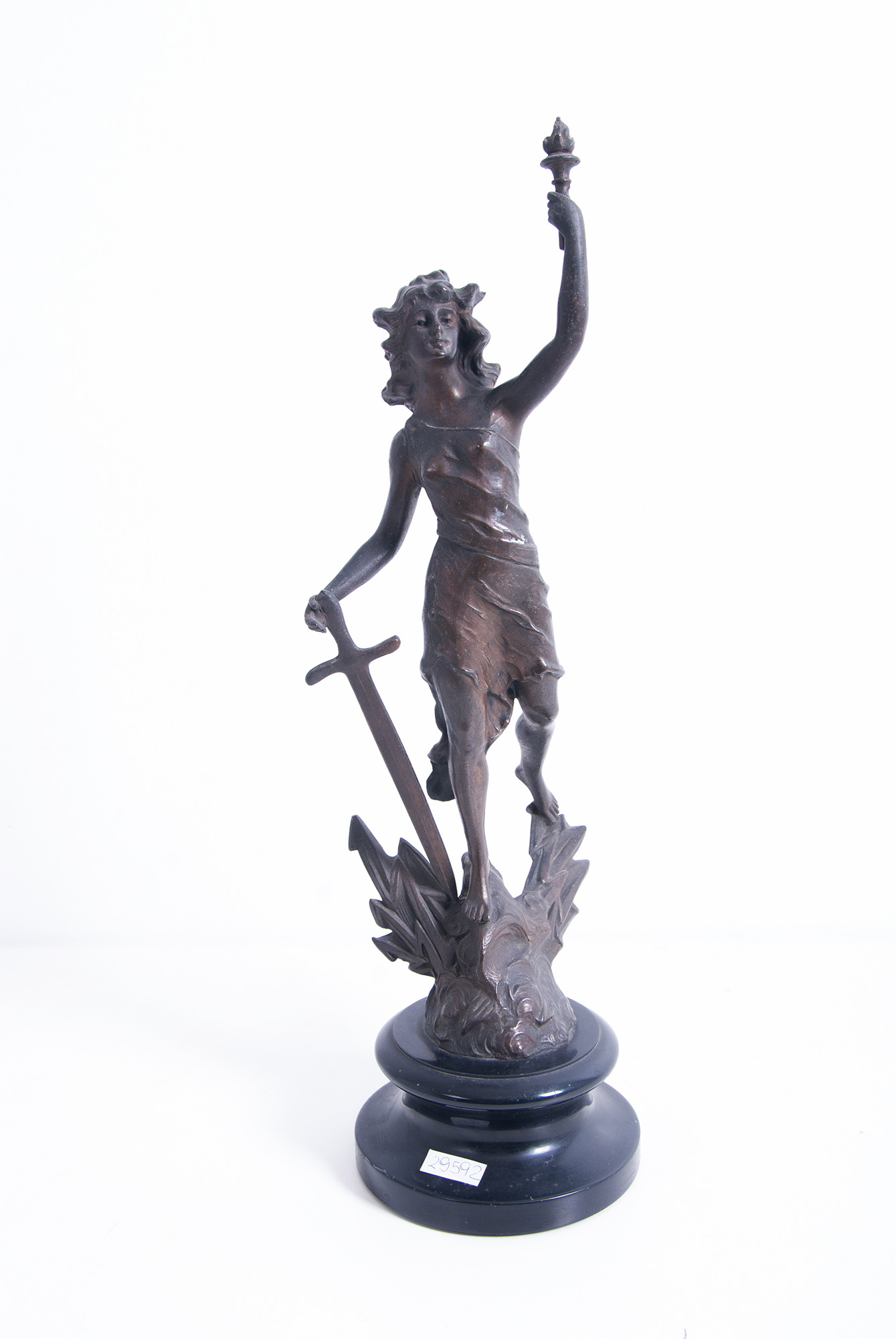 Scultura in bronzo raff. ''FIGURA FEMMINILE CON FIACCOLA E SPADA''. Base in marmo nero. Inizi XX secolo. Mis. Alt. cm. 41 ca.