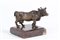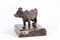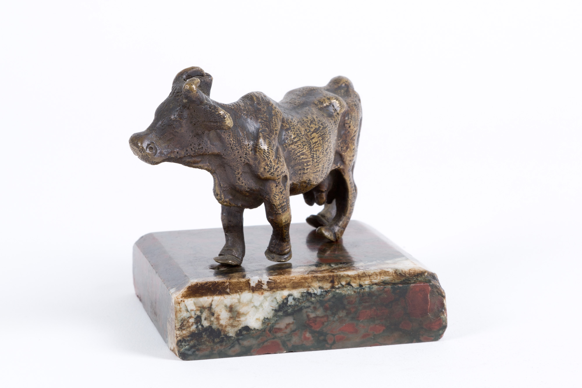 Scultura in bronzo patinato raff. ''MUCCA''. Base in diaspro. Inizi XX secolo. Mis. Lung. cm. 9 Alt. cm. 5.5 ca.
