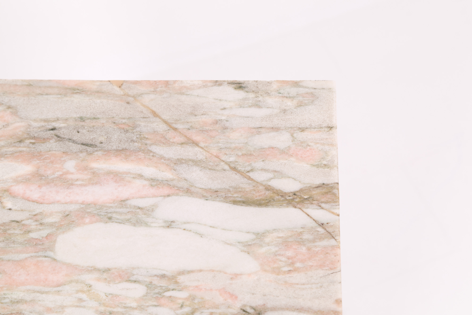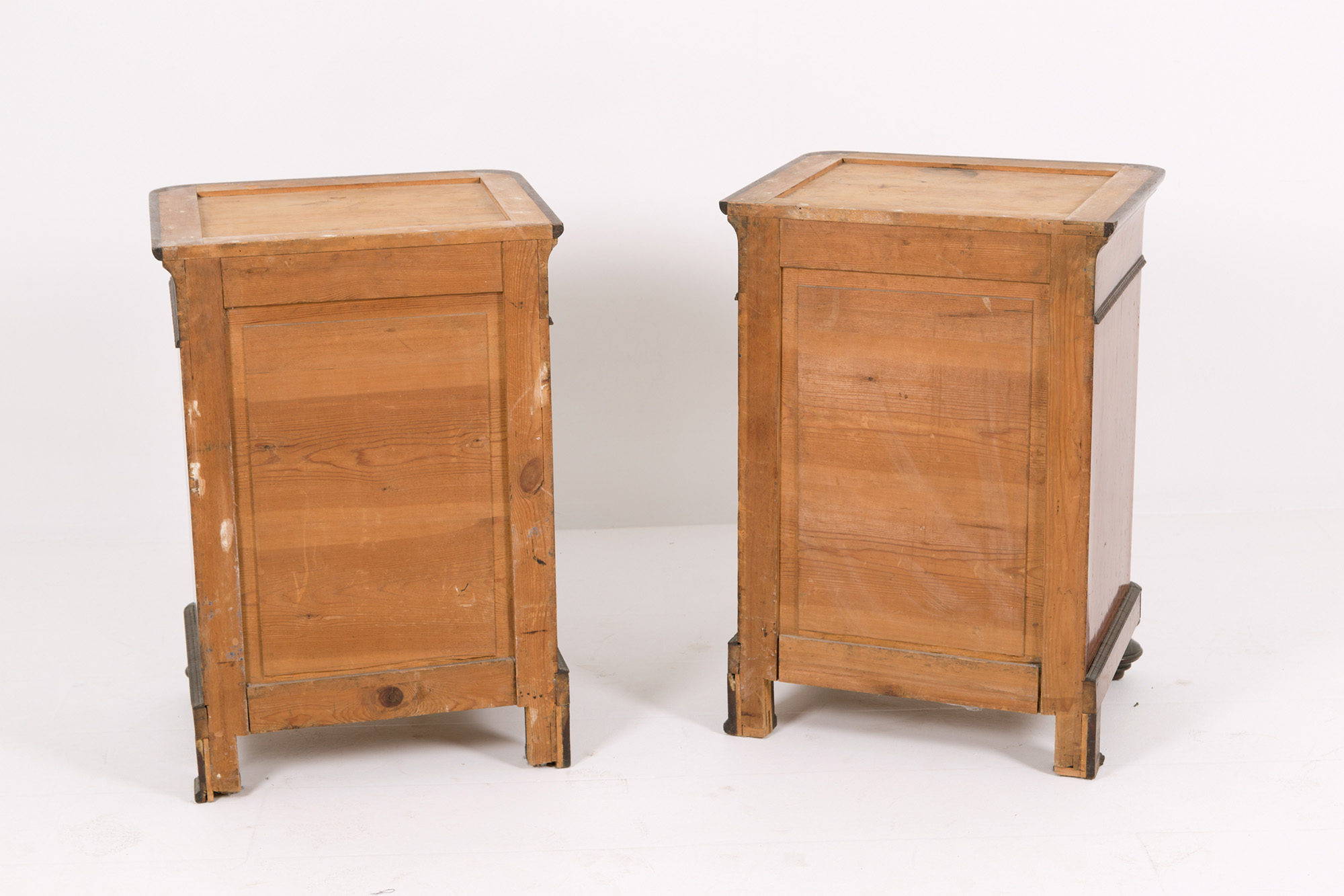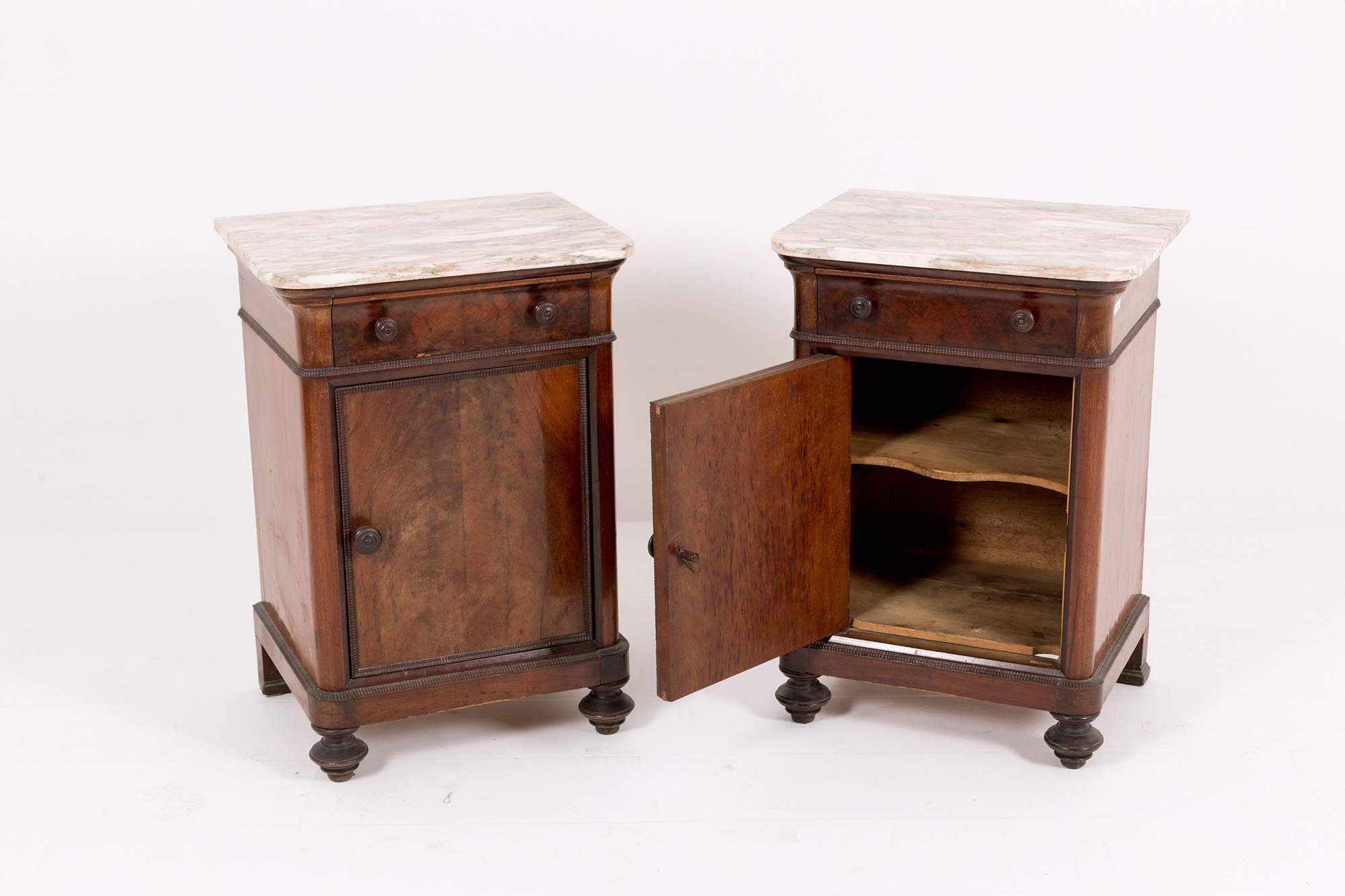 Coppia di comodini in legno con piano in marmo rosa, cassetto sottopiano e anta. Inizi XIX secolo. Piccolo difetto. Mis. Lung. cm. 50 Alt. cm. 72 Prof. cm. 40 ca.
