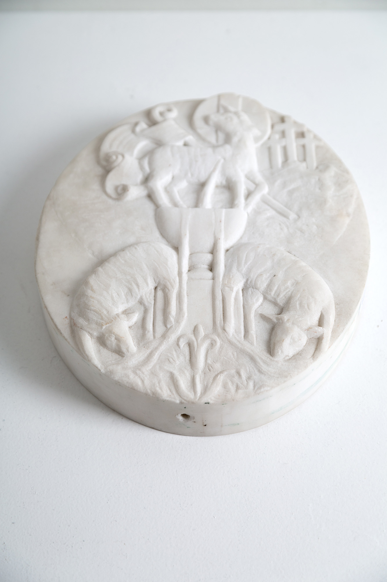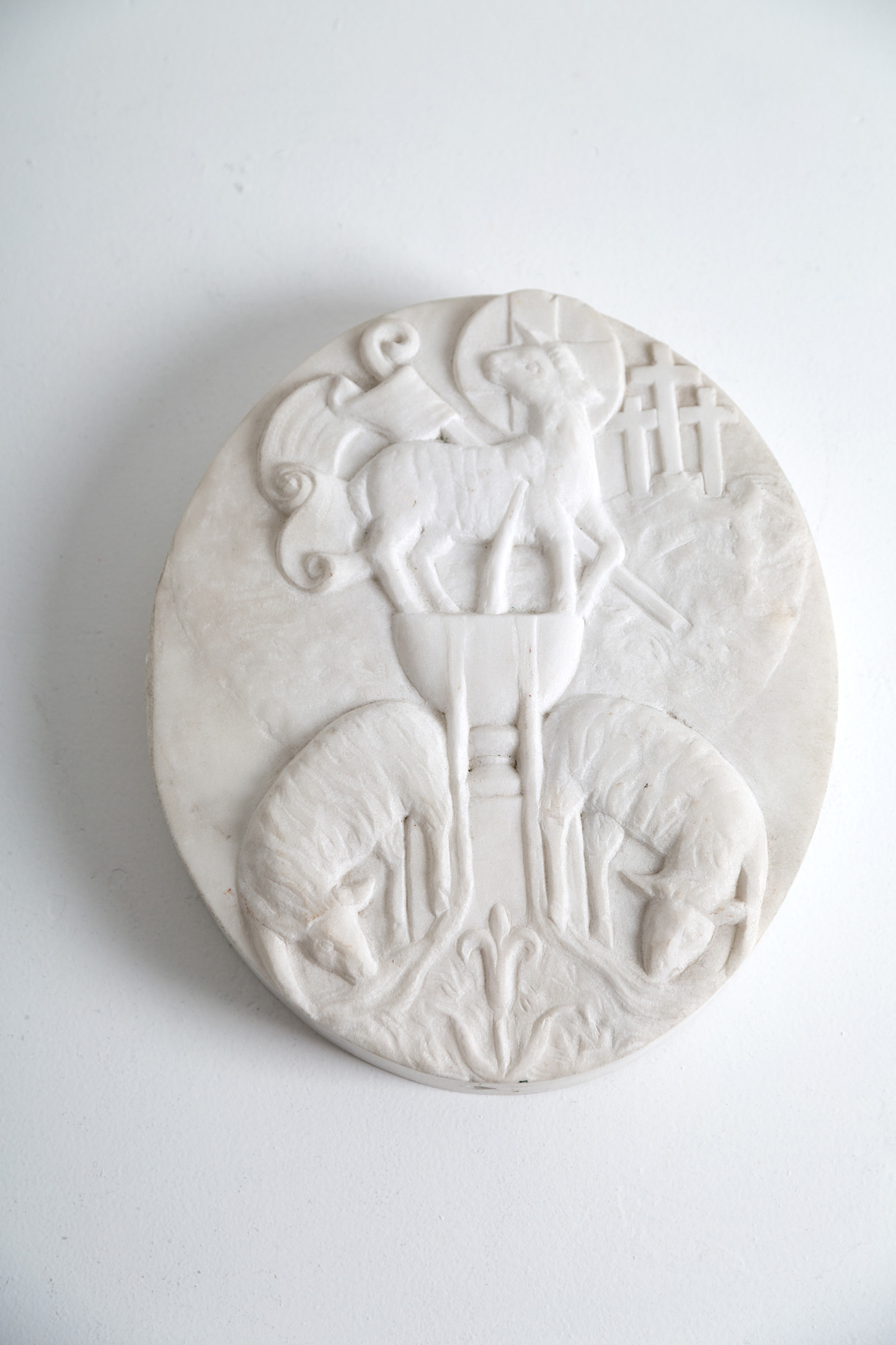 Medaglione in marmo bianco di Carrara scoplito raff. ''AGNUS DEI''. XVII secolo. Mis. Lung. cm. 23.5 Alt. cm. 27.5 Prof. cm. 5 ca.