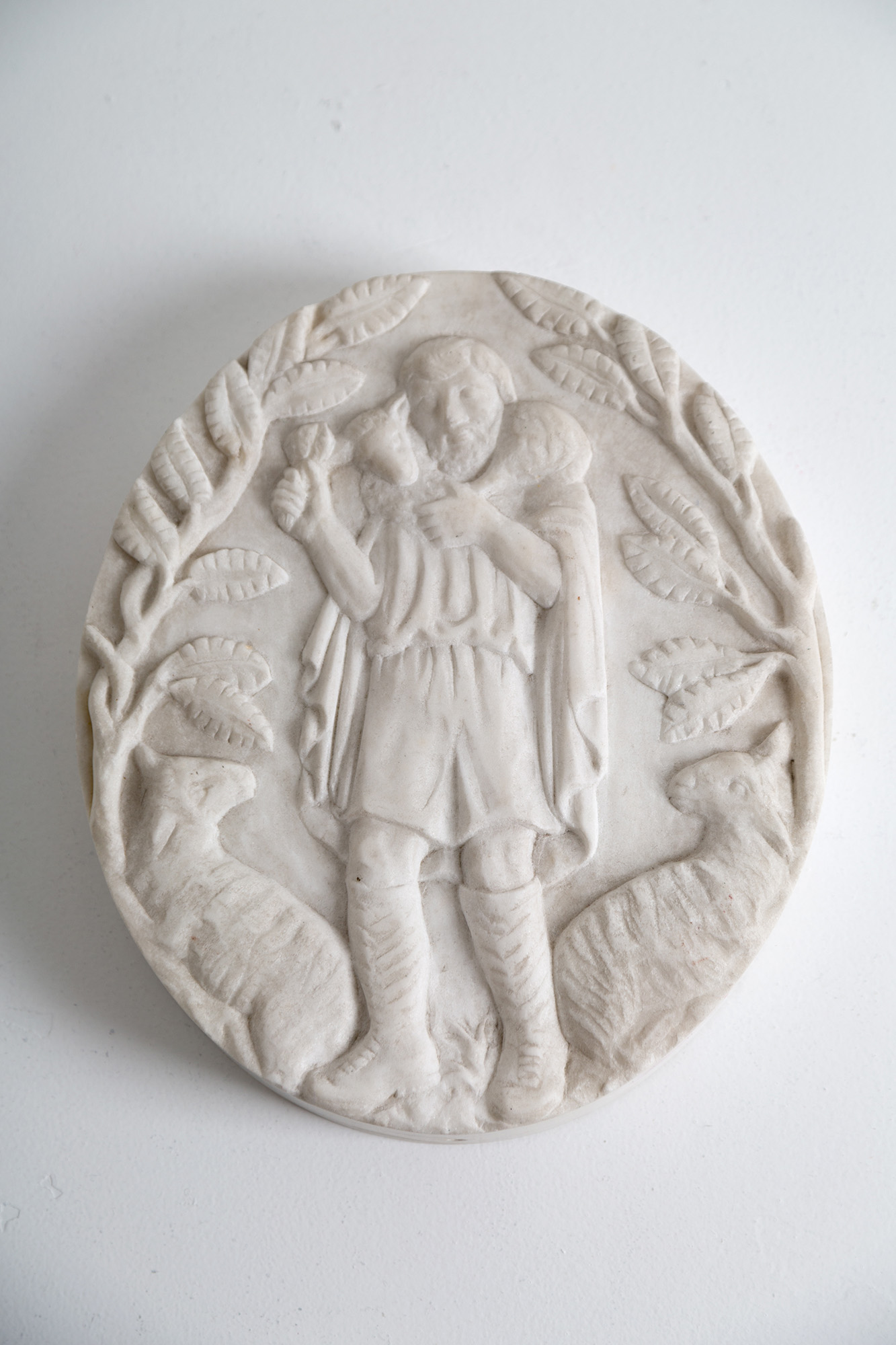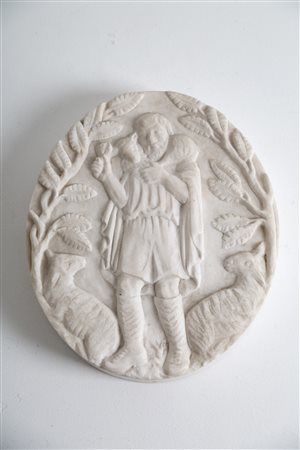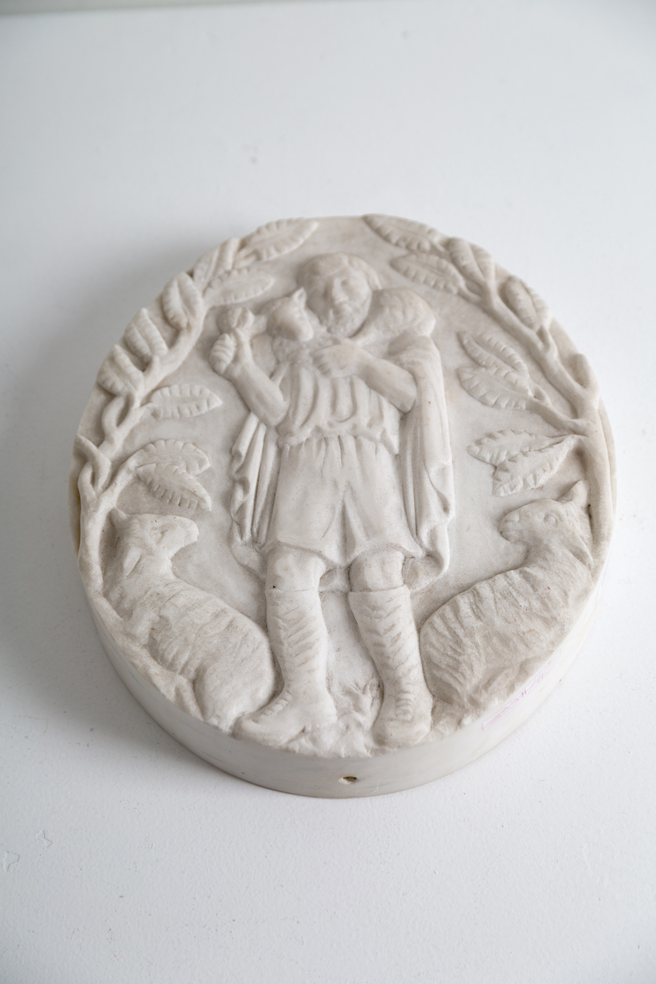 Medaglione in marmo bianco di Carrara scolpito raff. ''BUON PASTORE''. XVII secolo. Mis. Lung. cm. 23.5 Alt. cm. 27.5 Prof. cm. 5 ca.