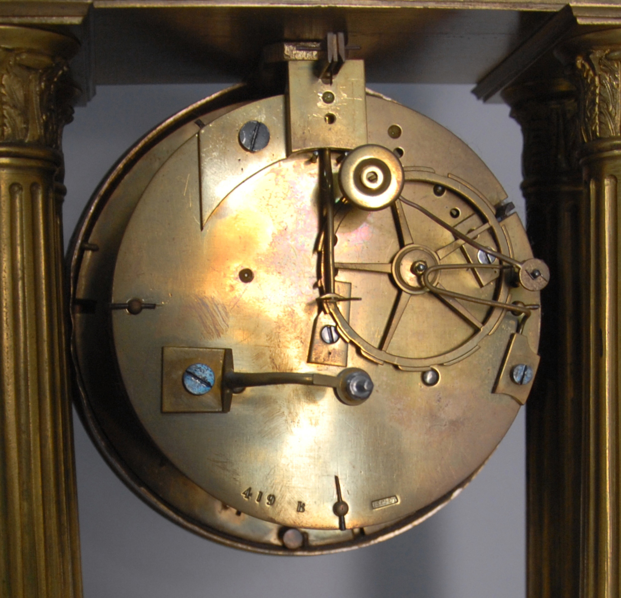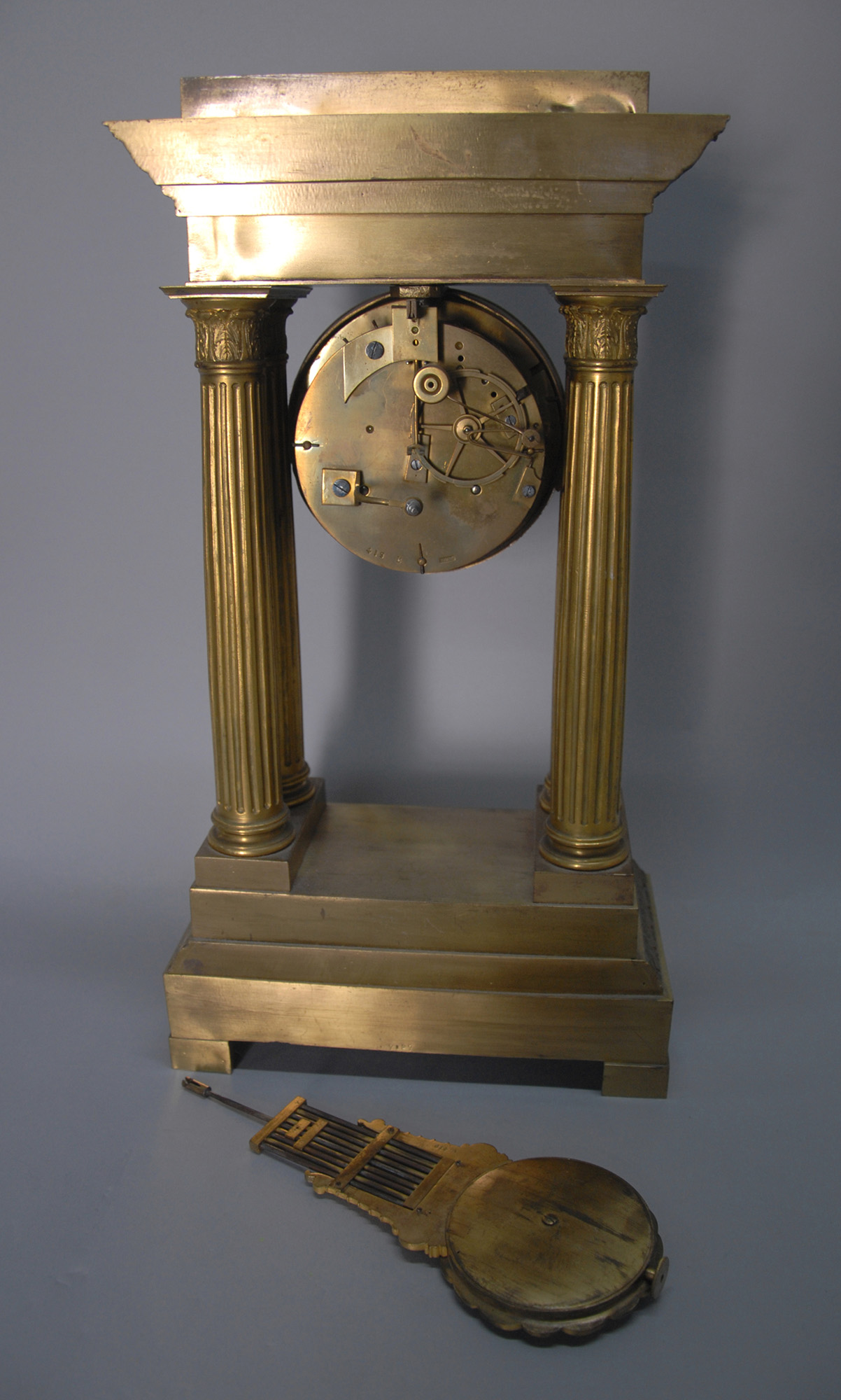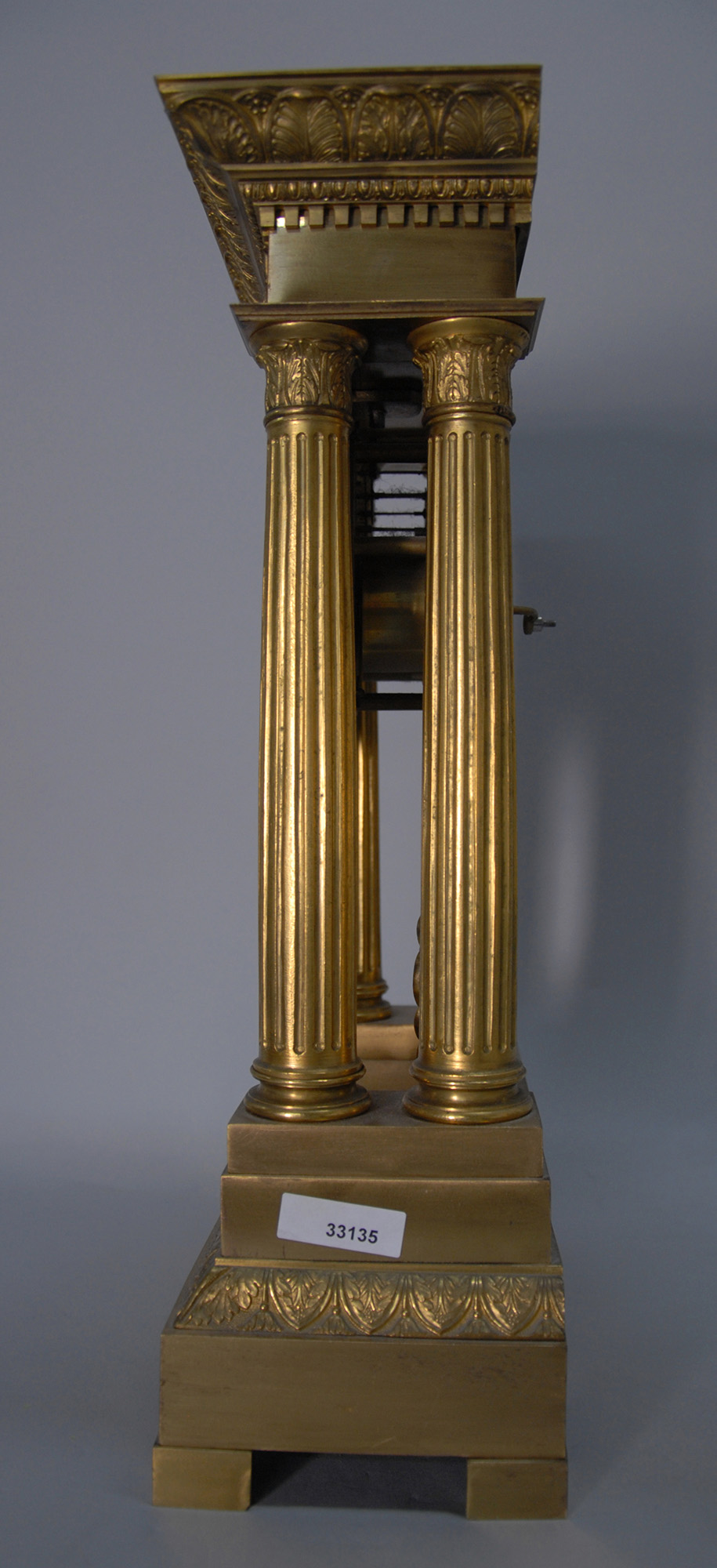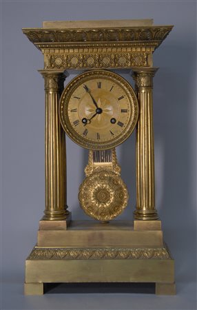 Orologio in bronzo finemente cesellato, supportato da quattro colonne. XIX secolo. Mancante di campanella. Mis. Lung. cm. 24 Alt. cm. 43.5 Prof. cm. 12 ca.