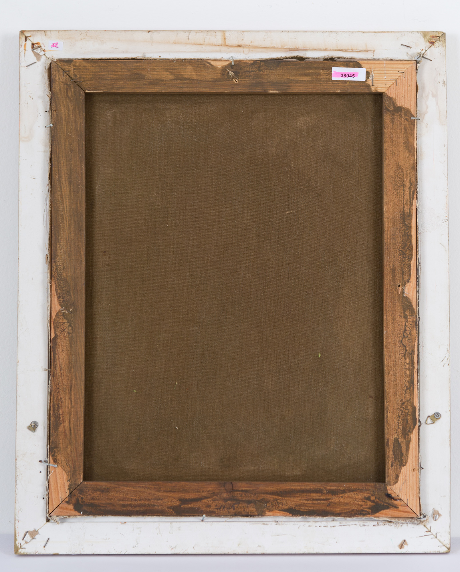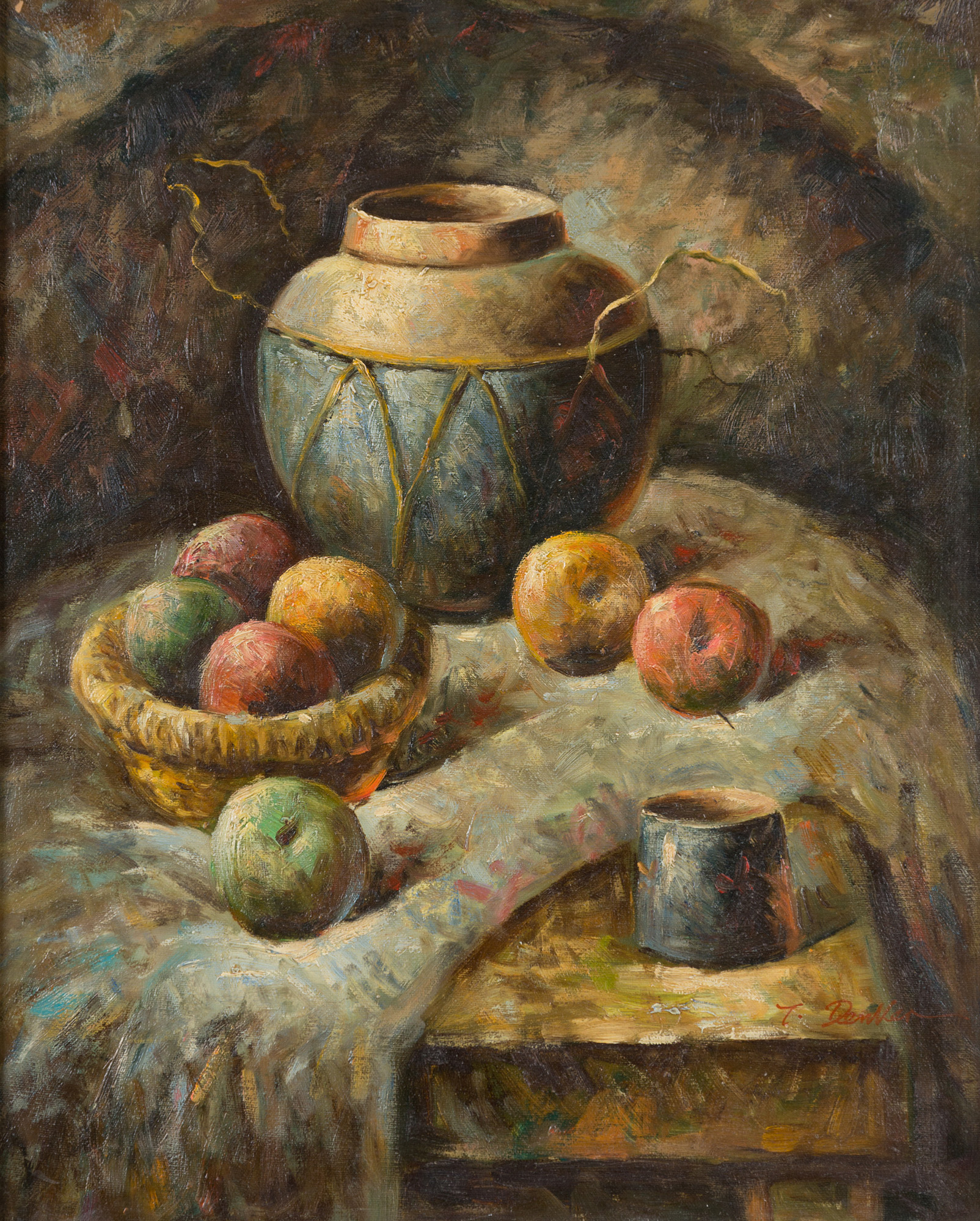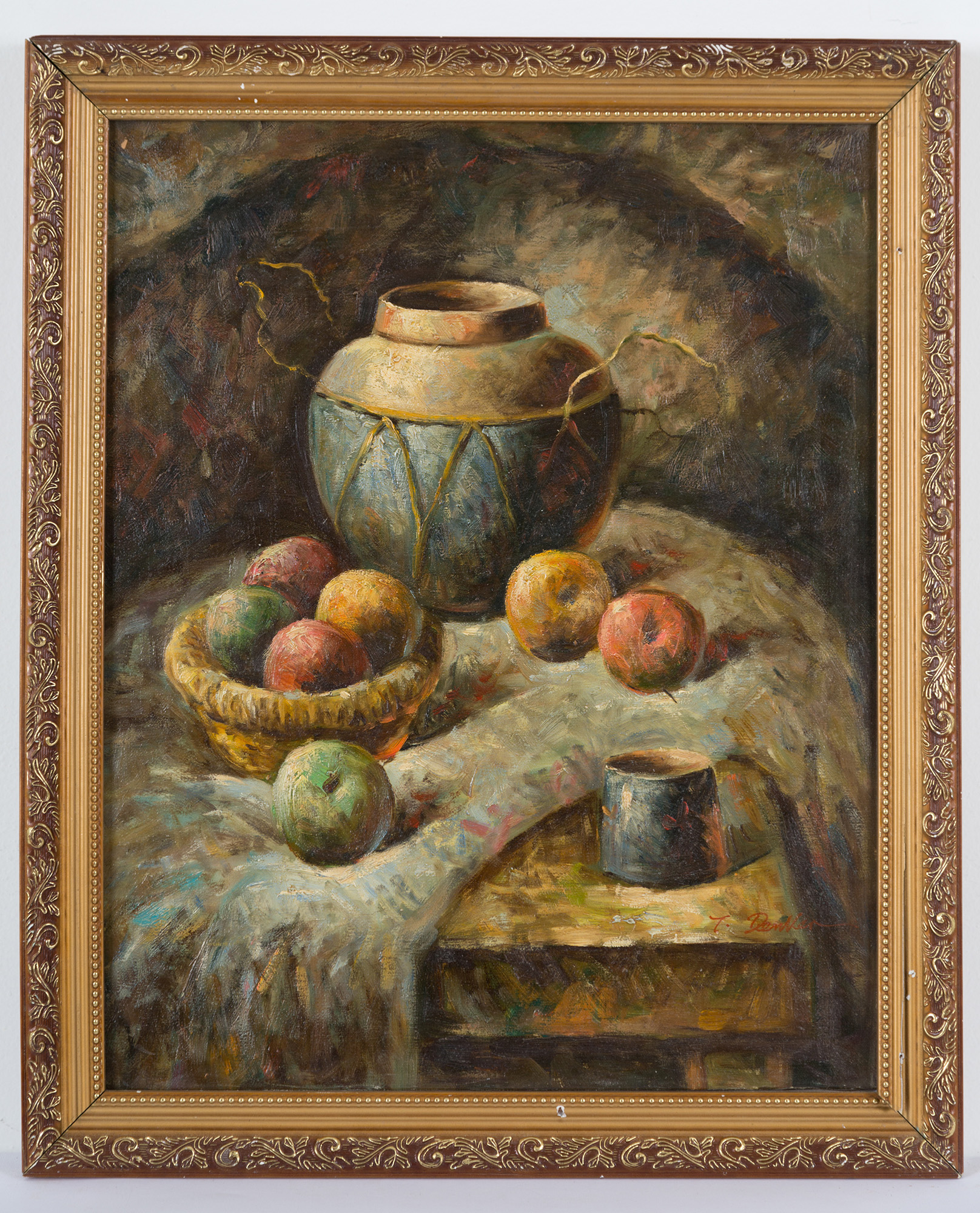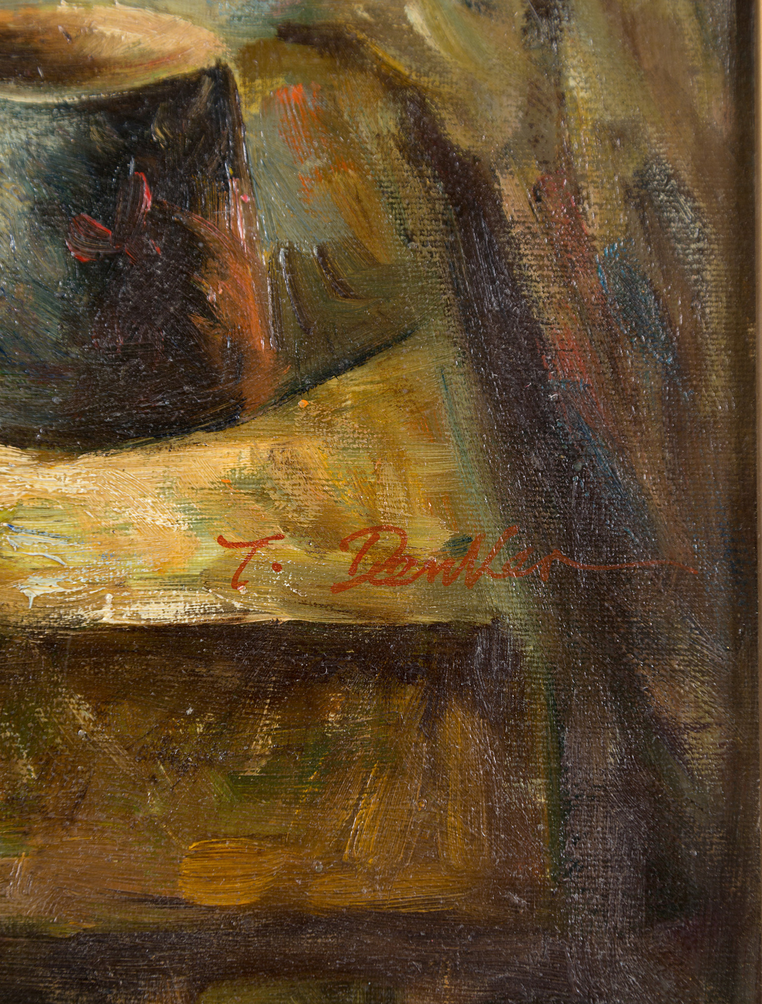 Dipinto olio su tela raff. ''NATURA MORTA CON VASO E FRUTTA''. Firmato T. DENKER a destra. XX secolo. In cornice. Mis. Lung. cm. 40 Alt. cm. 50 ca.