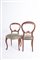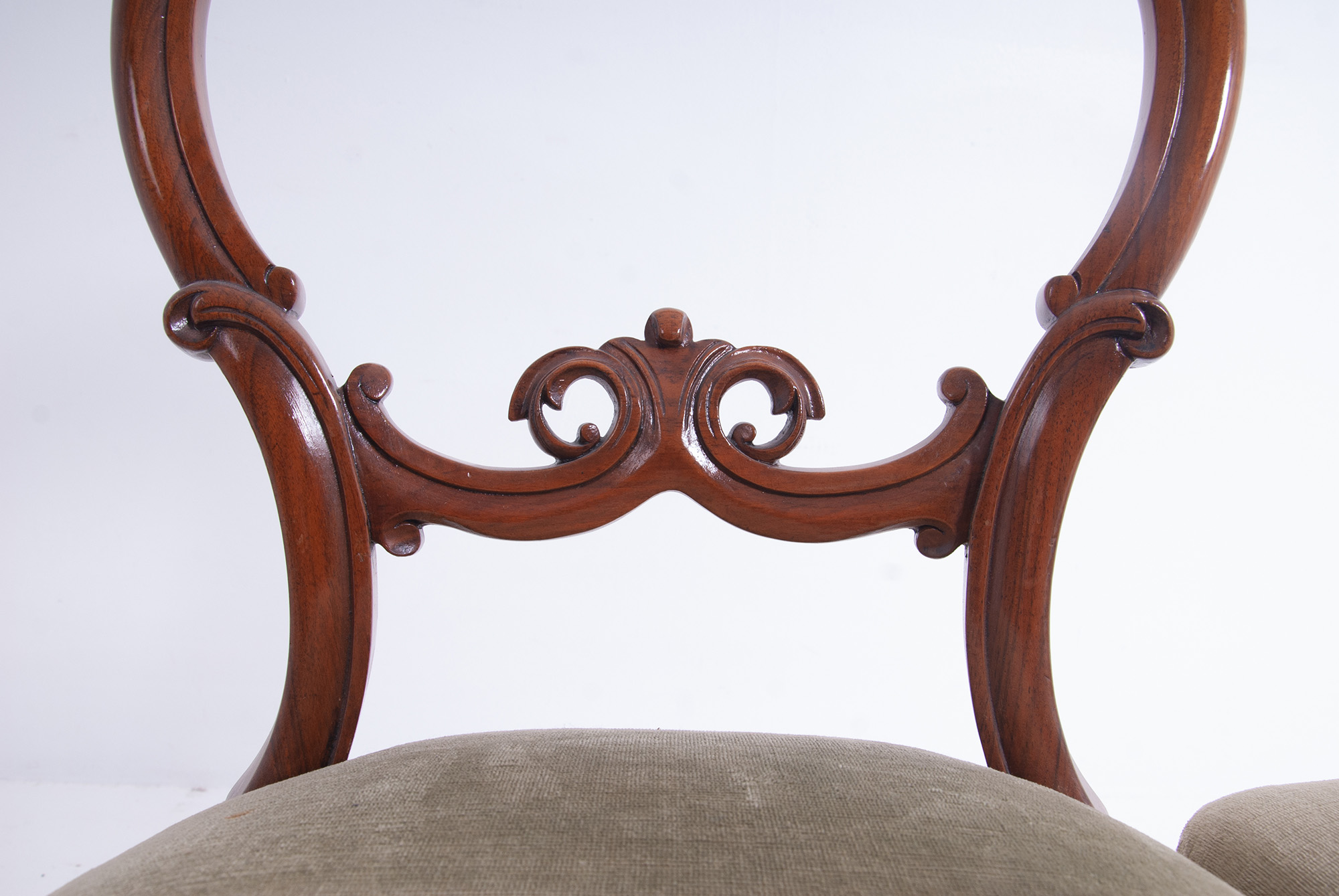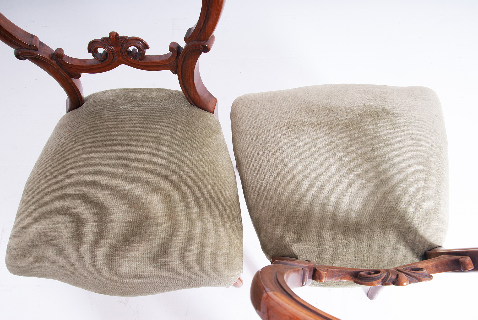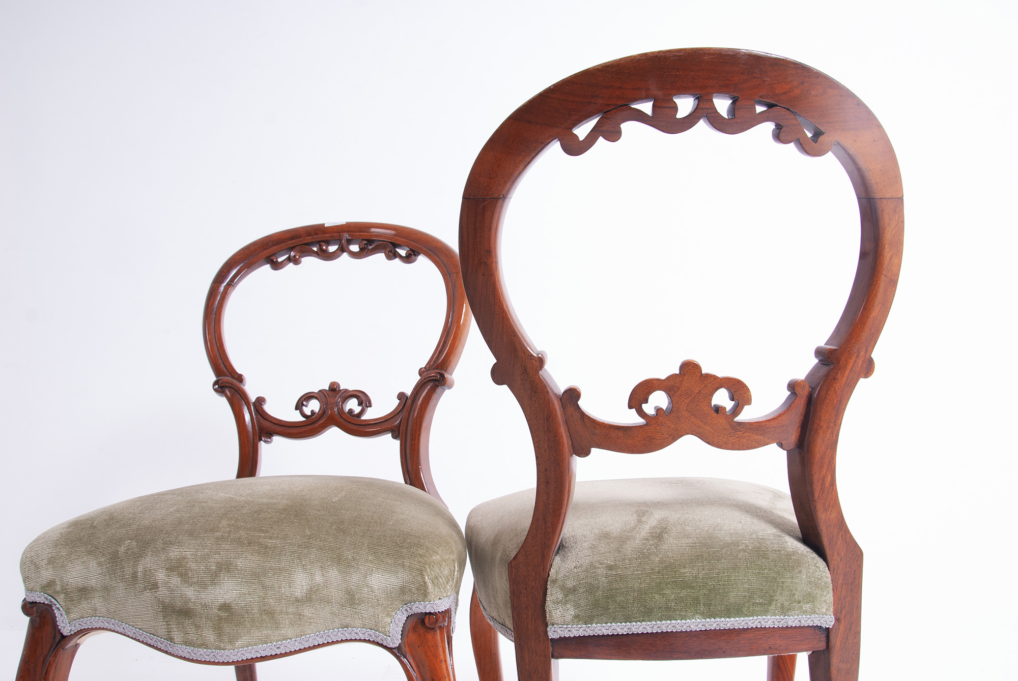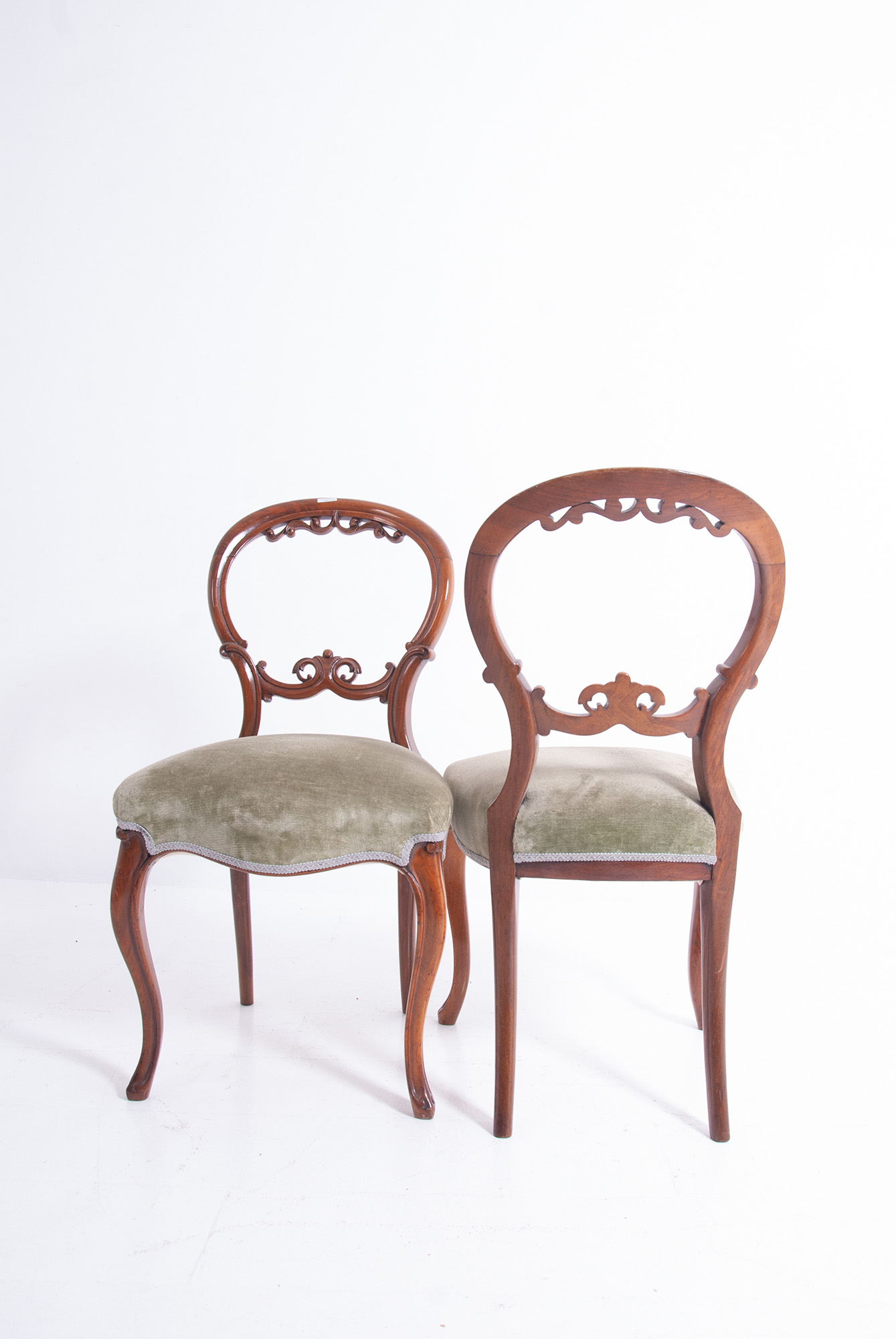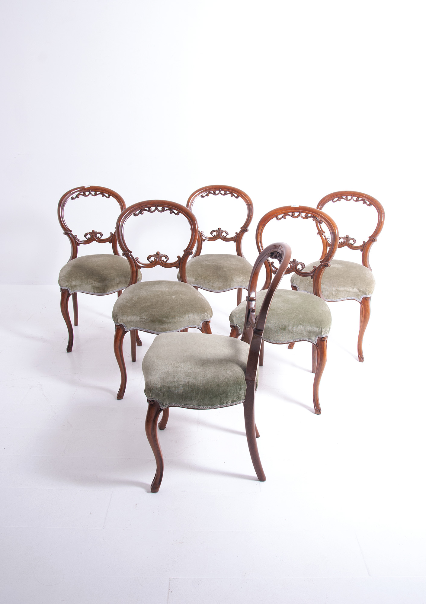 Sei sedie in noce con schienale arrotondato, seduta imbottita e gambe cabriole. Inghilterra. XIX secolo.