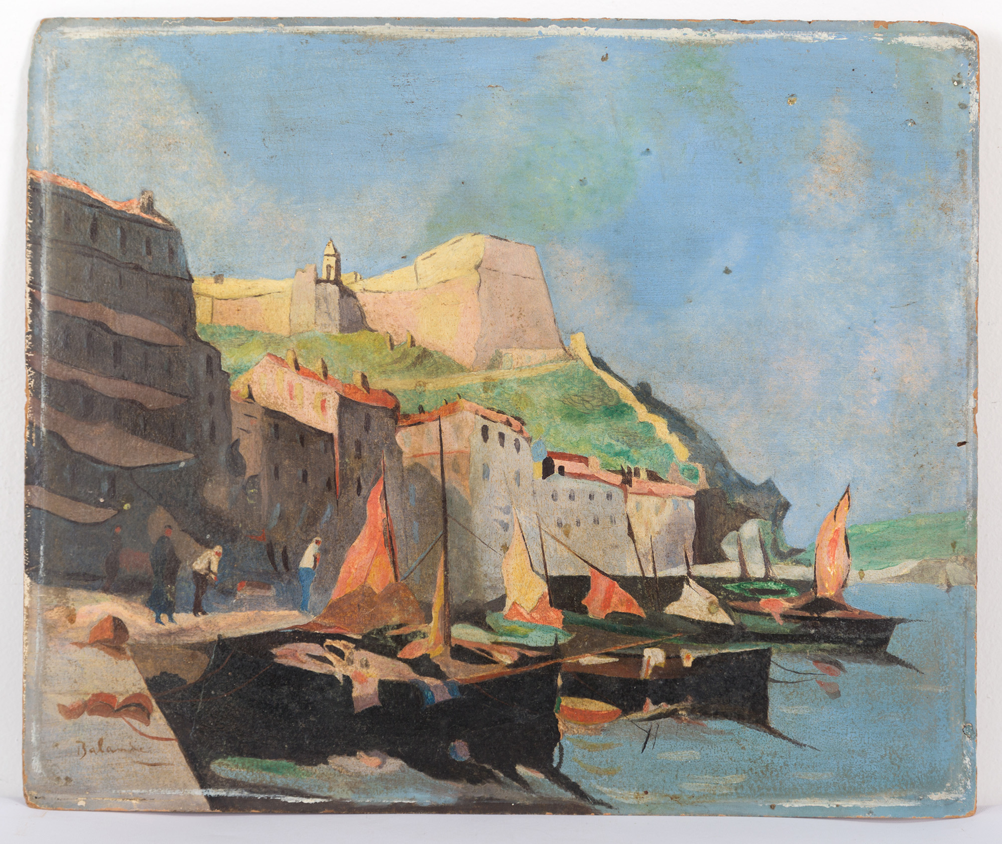 GASTON BALANDE (Madrid, 1880 - Parigi, 1971). Dipinto olio su cartone raff. ''BARCHE IN PORTO''. Firmato in basso a sinistra. Mis. Lung. cm. 46 Alt. cm. 38 ca.
