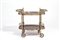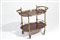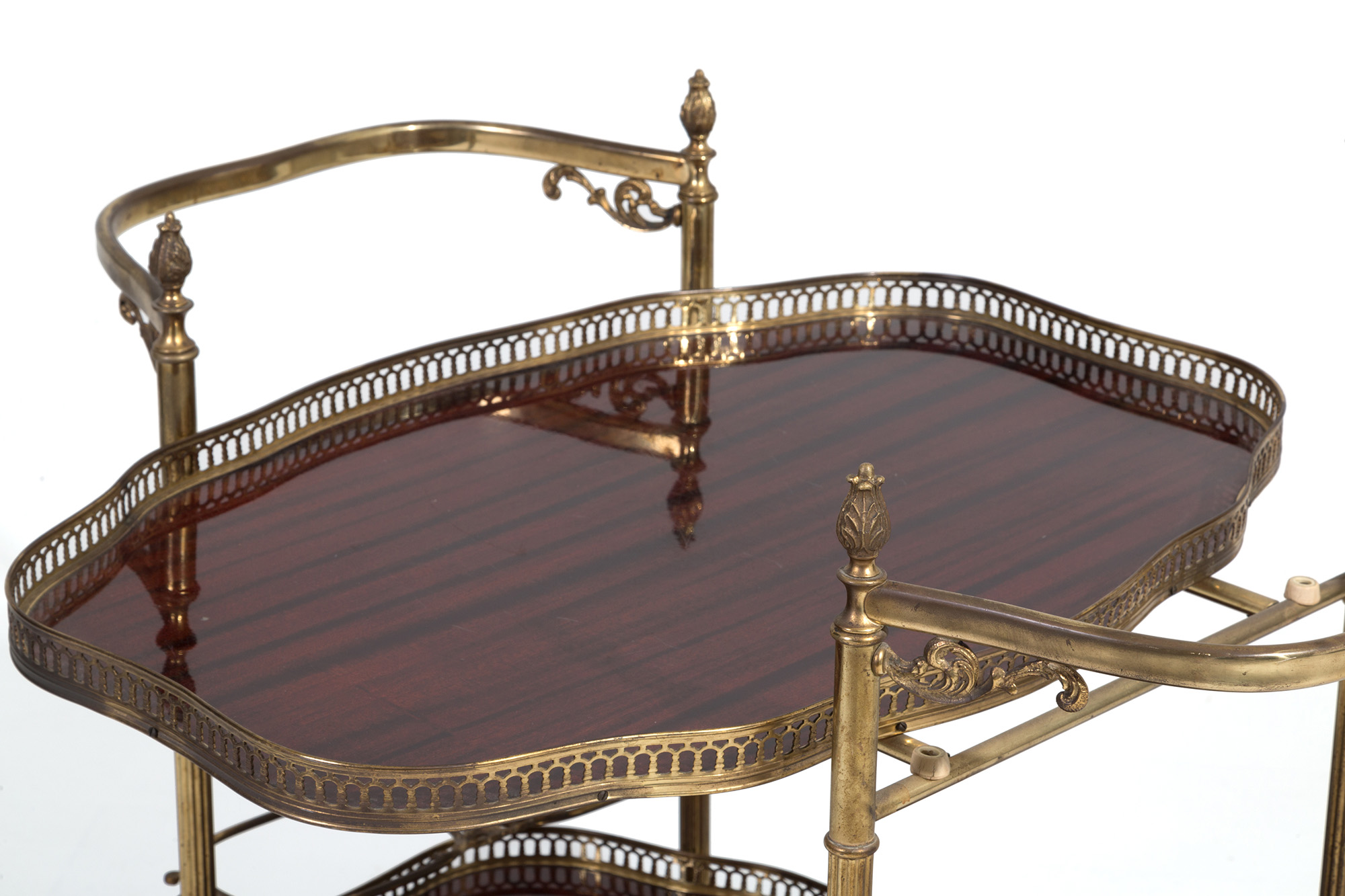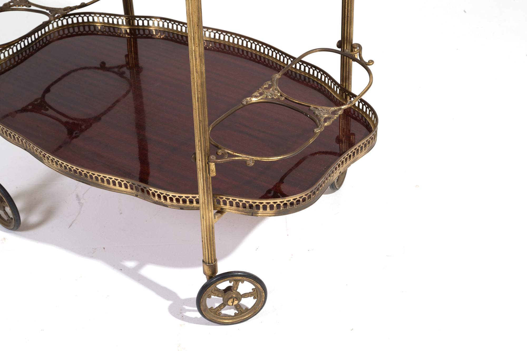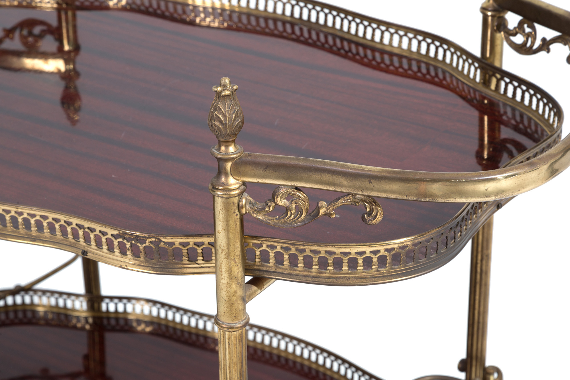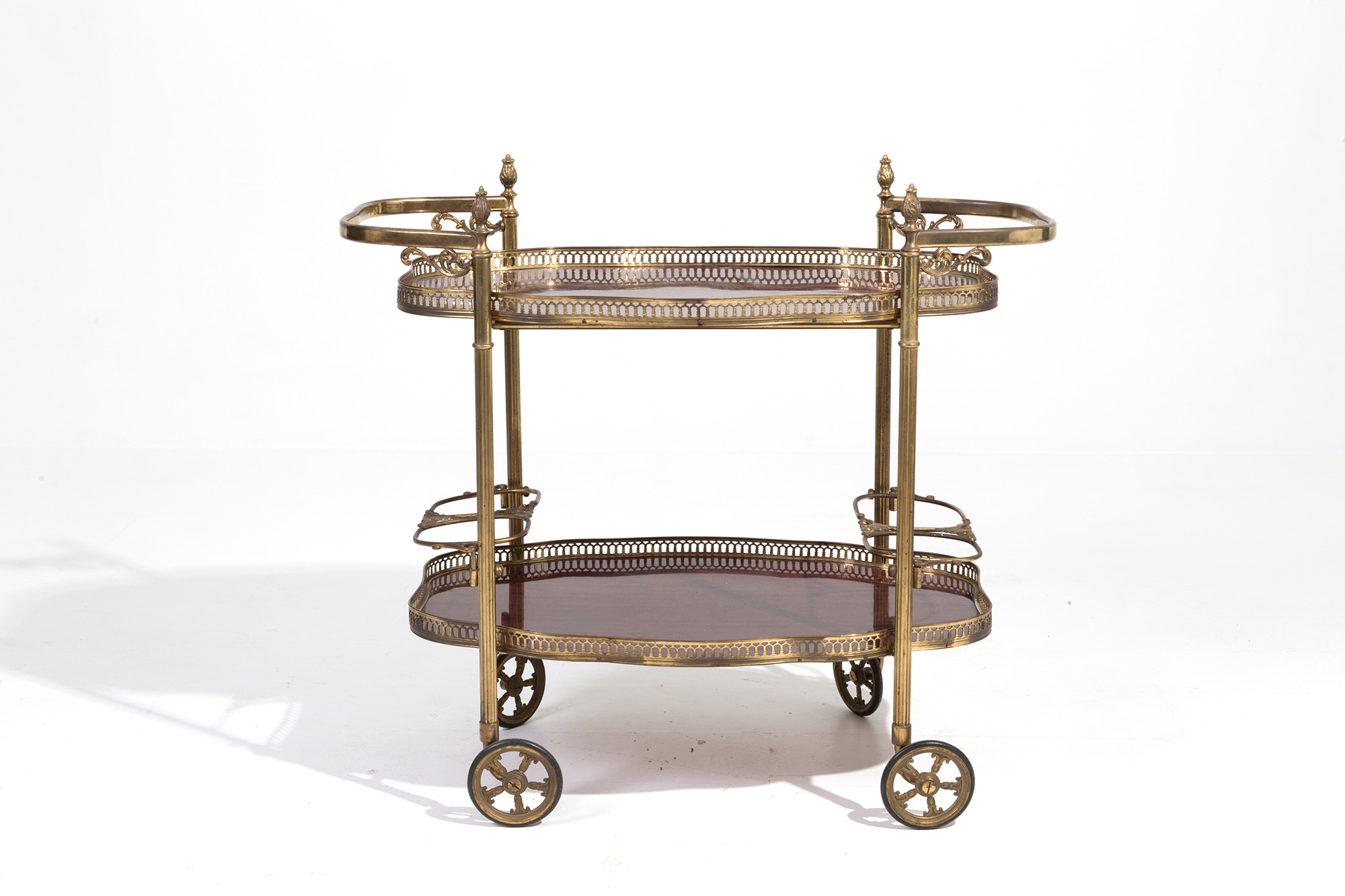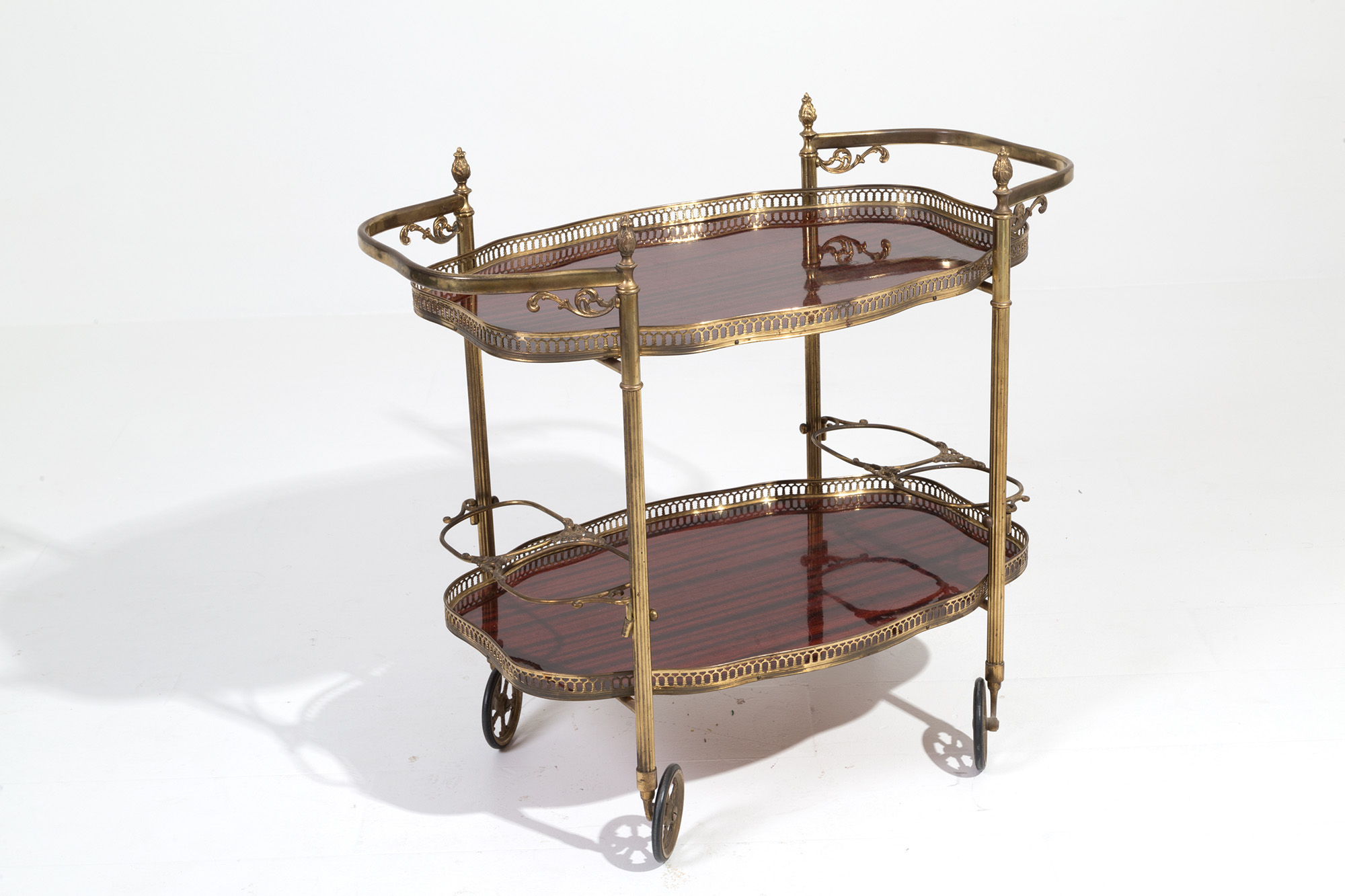 Carrello portavivande in ottone sagomato e traforato con vassoi in legno. Inizi XX secolo. Mis. Lung. cm. 83 Alt. cm. 70 Prof. cm. 48 ca.