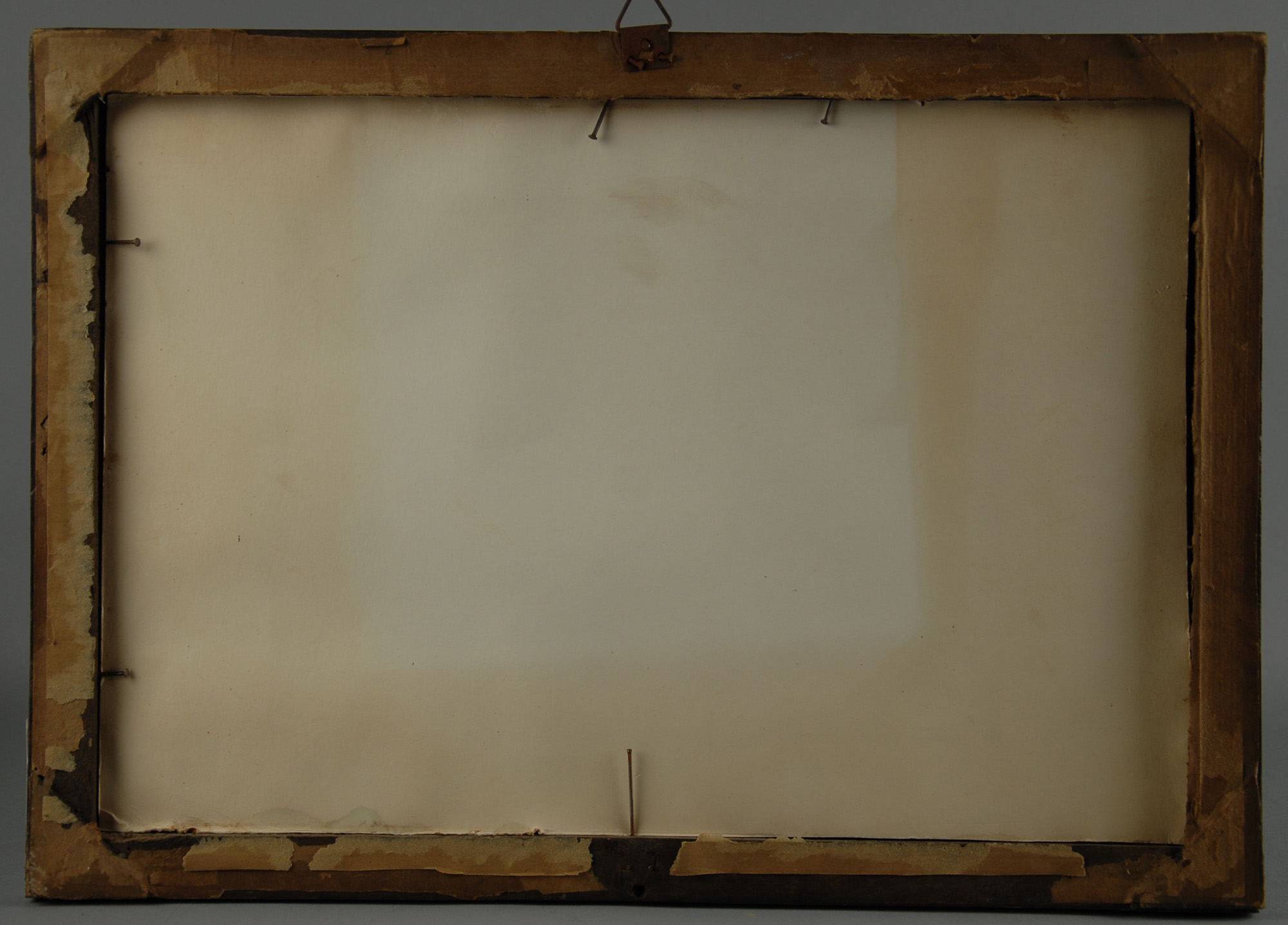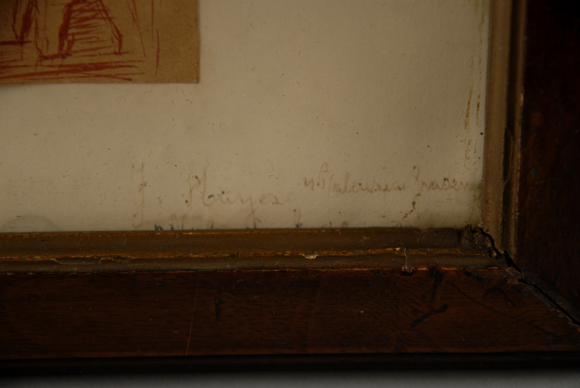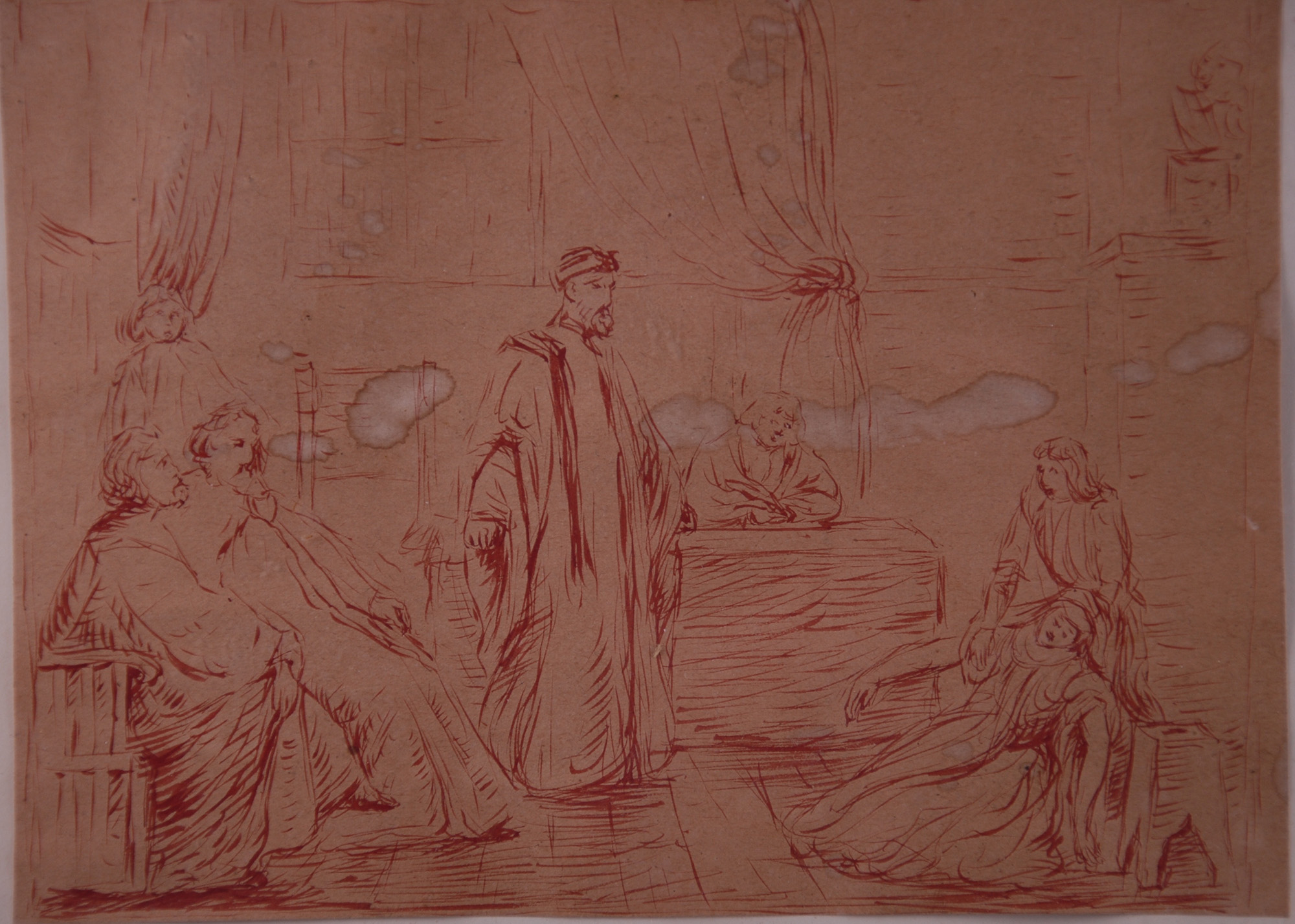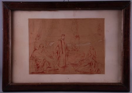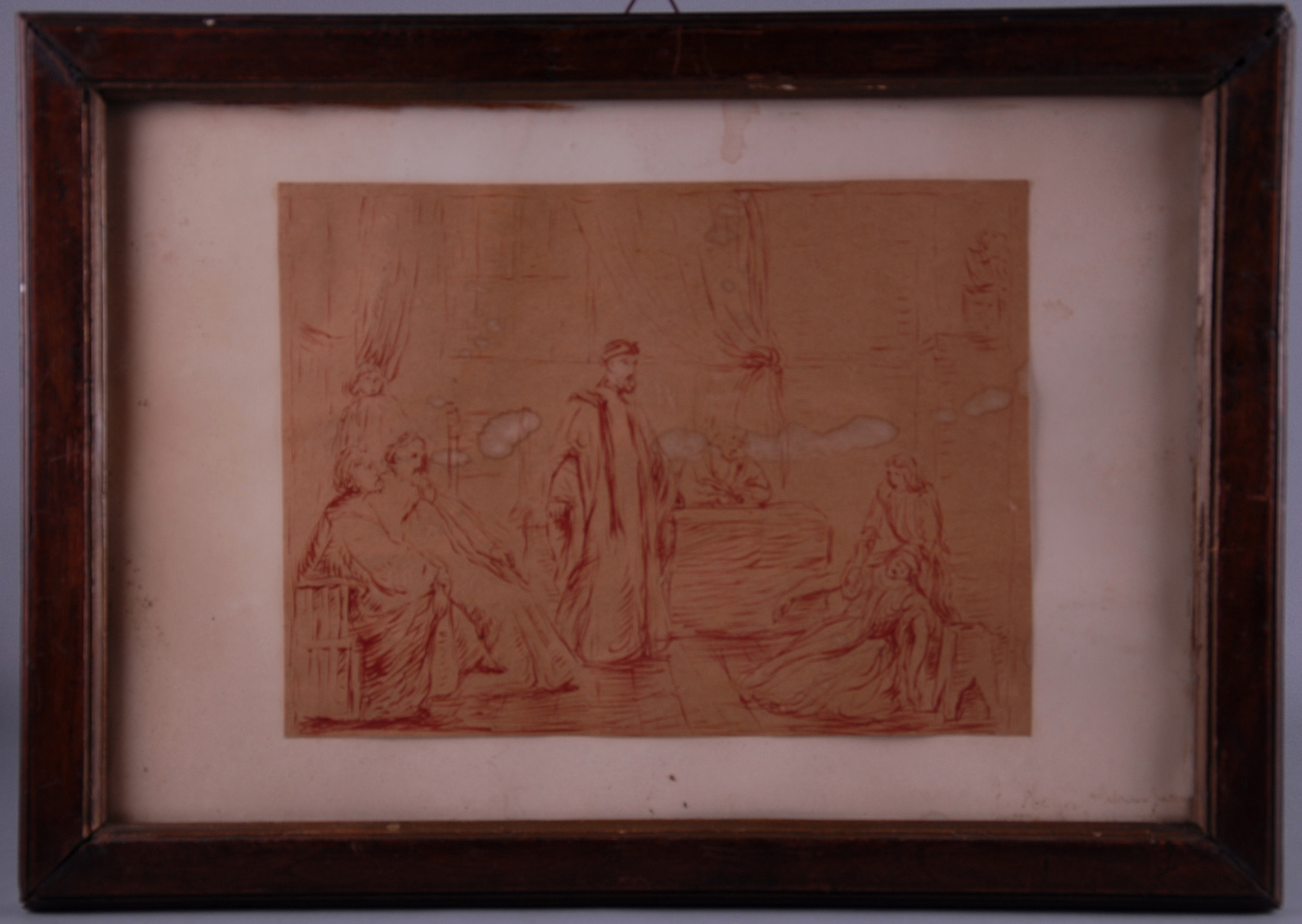 Disegno a china rossa su cartoncino raff. ''SCENA CON PERSONAGGI''. In cornice. Difetti. Mis. Lung. cm. 25.5 Alt. cm. 18.5 ca.