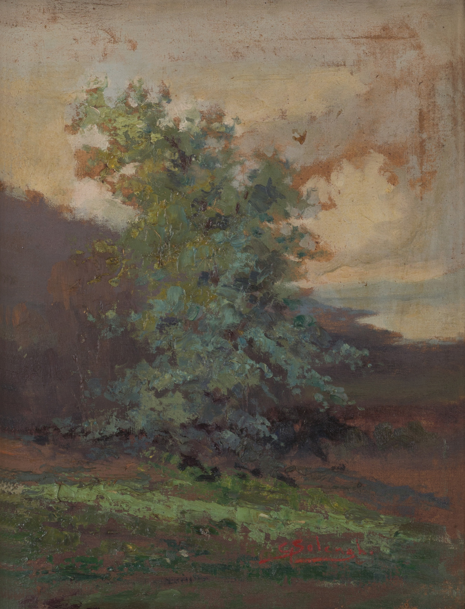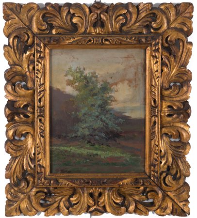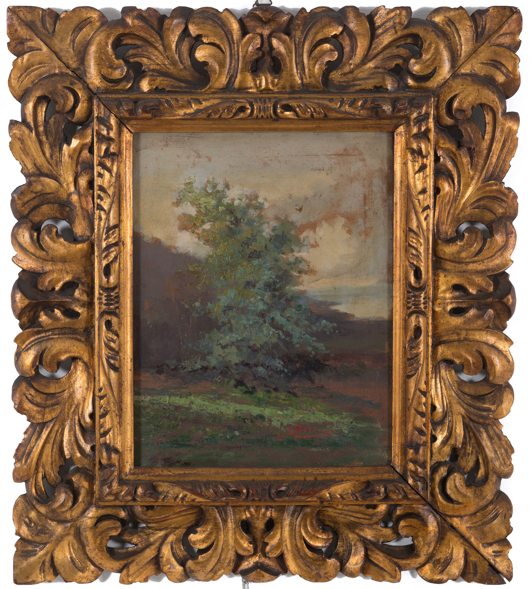 GIUSEPPE SOLENGHI (Milano, 1879 - Cernobbio, 1944). Dipinto olio su tela raff. ''ALBERO''. Firmato in basso. In cornice intagliata e dorata. Mis. Lung. cm. 35 Alt. cm. 42 ca.