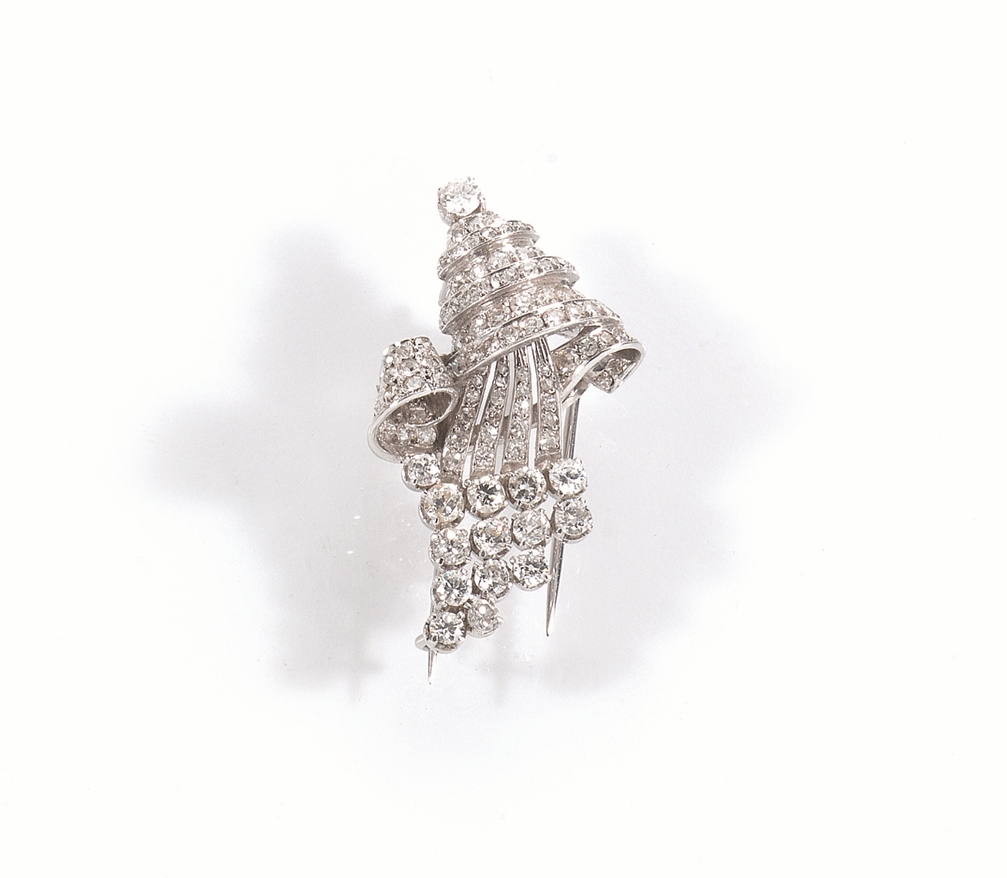 Lotto 300 | Spilla in platino e diamantiin forma di cornucopia interamente tempestata in...