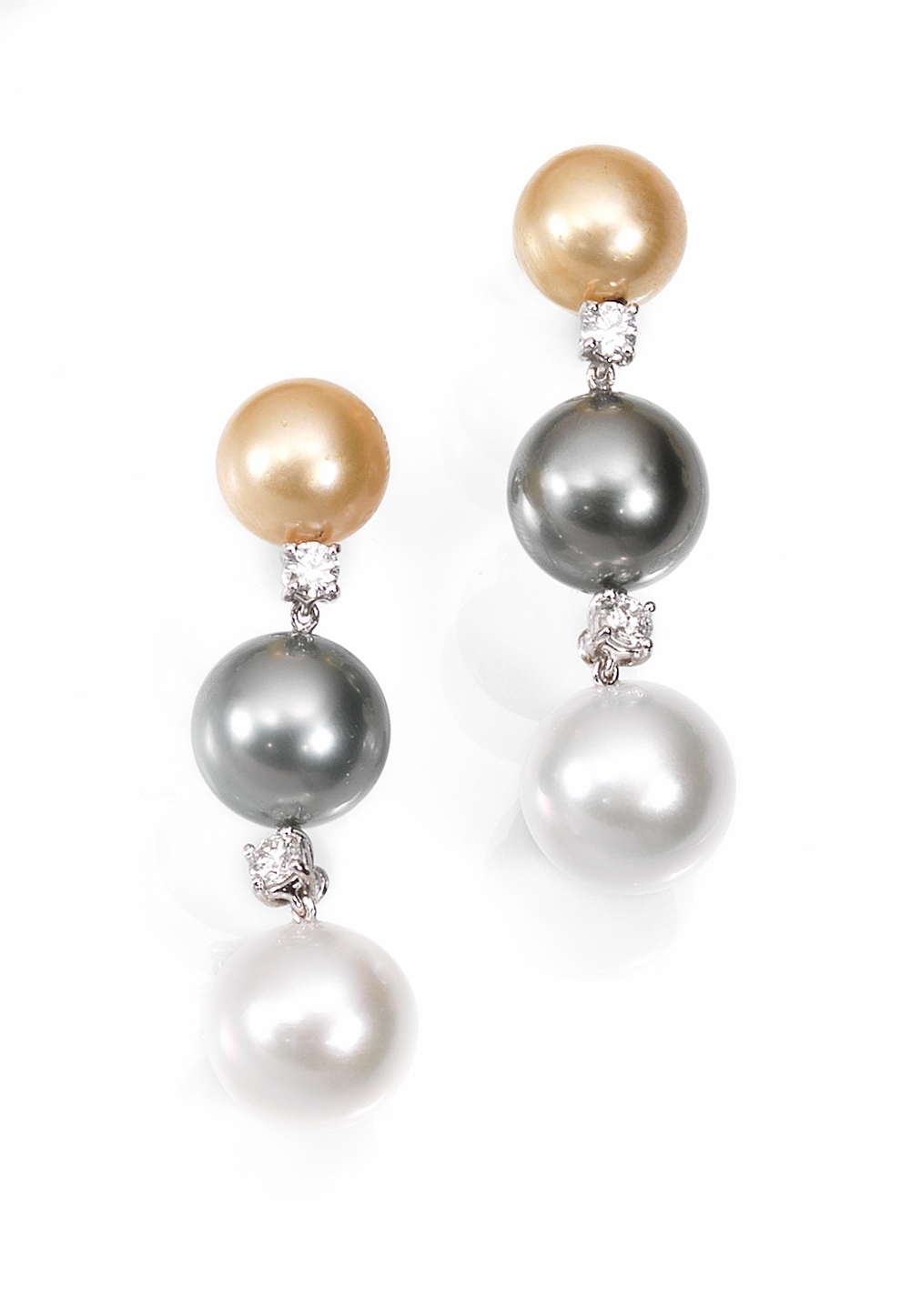 Paio di orecchini pendenti in oro bianco, perle South Sea e Tahiti e diamanti