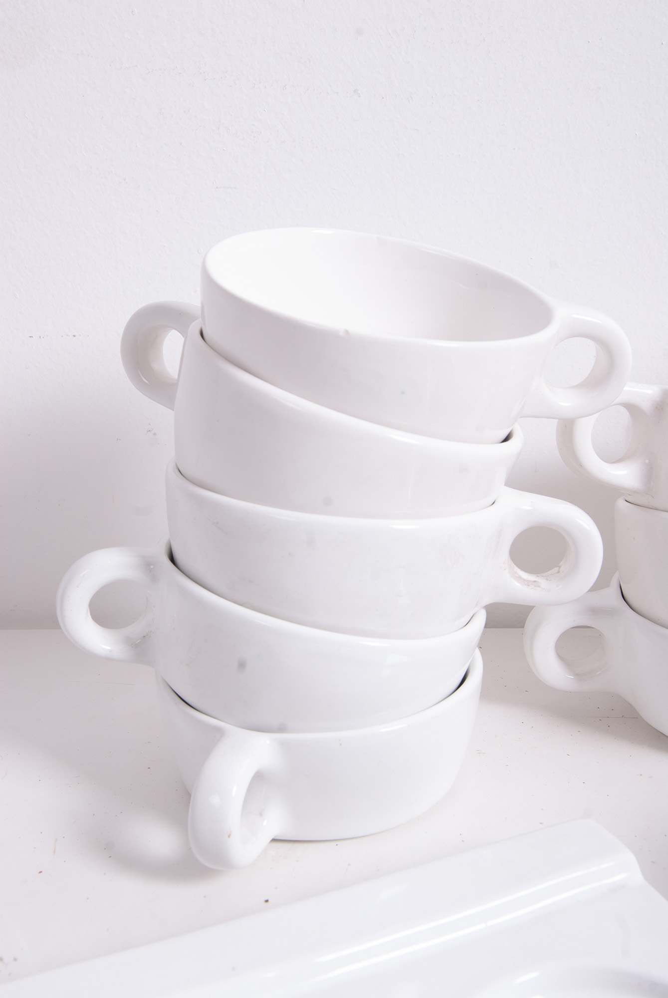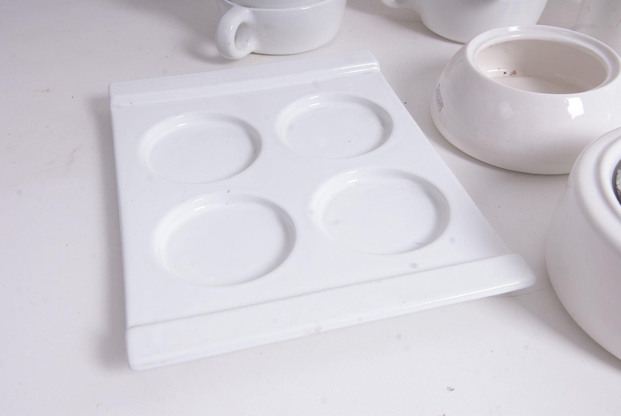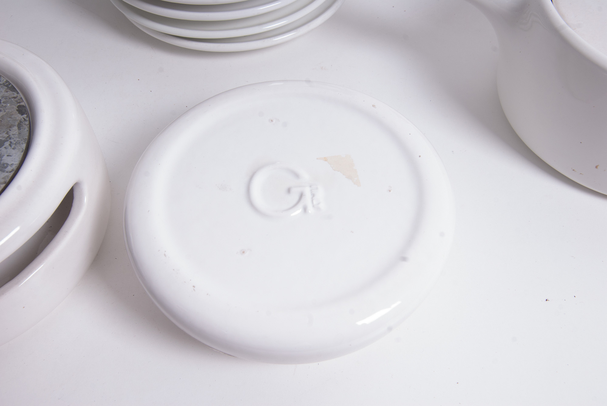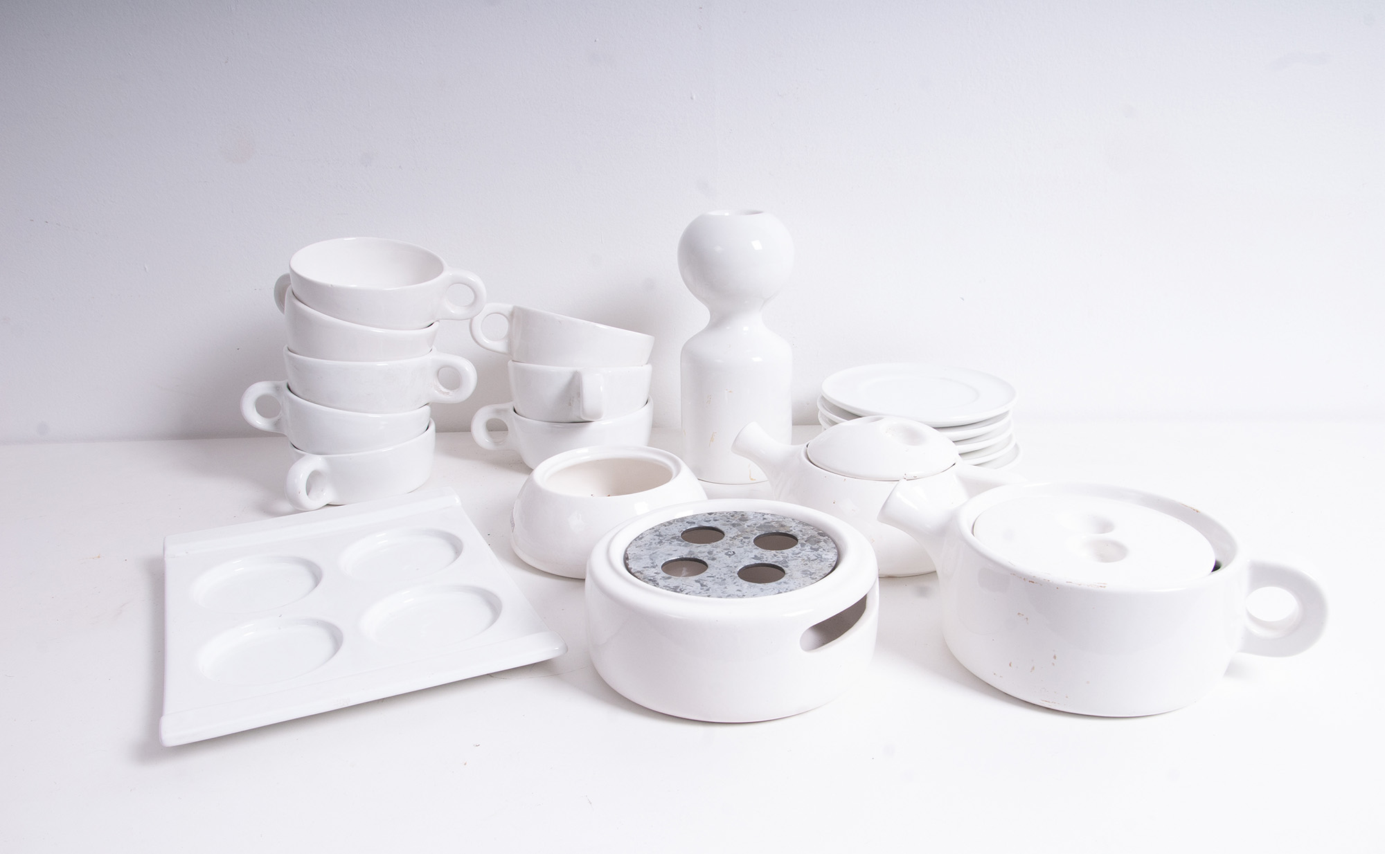 LIISI BECKMANN (Kirvu, 1924 - Orimattila, 2004). Servizio in porcellana composto da teiera, caffettiera, zuccheriera, scaldino, quattro tazze, quattro piatti, un vassoio e un candeliere. Manifattura GABBIANELLI. Anni '70.