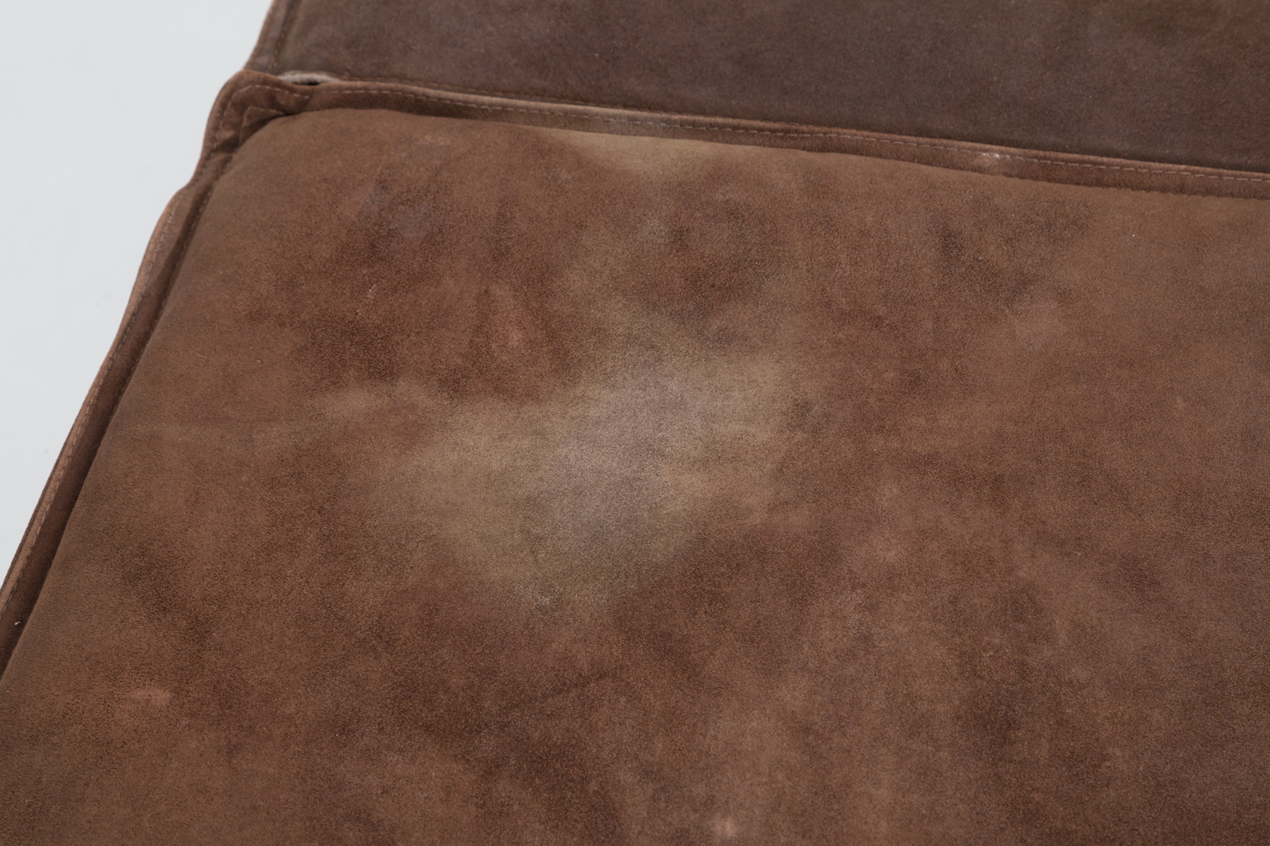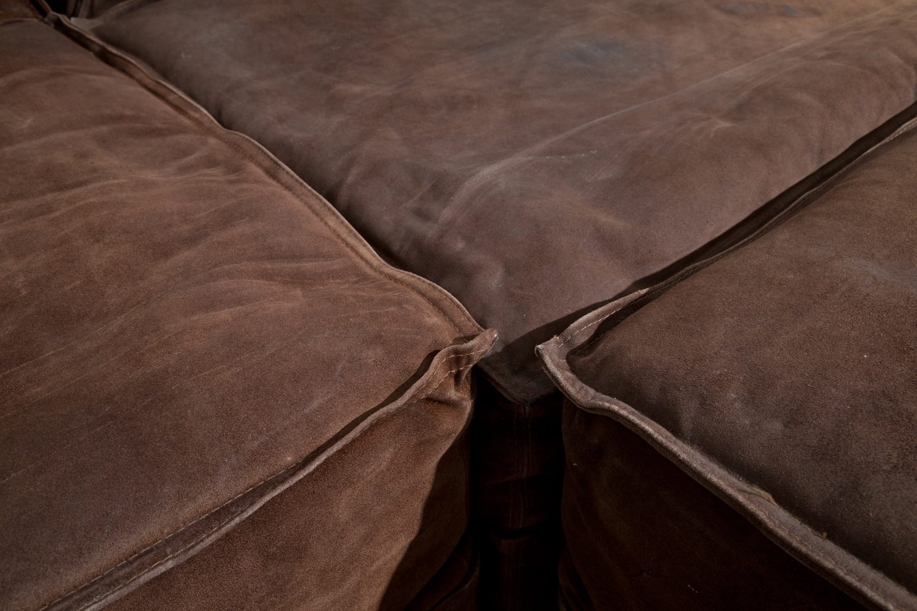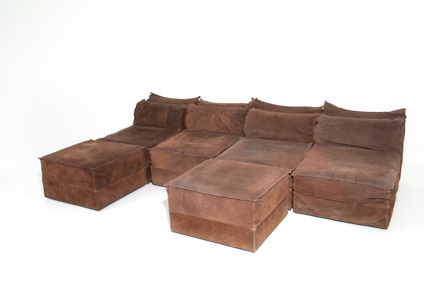 ARCH. A. COLOMBI e P. GUZZETTI per ABA. Quattro poltrone modulari e due pouff Mod. Bonzo in camoscio e legno. Marcati sul fondo plastico. Anni '70. Mis. poltrone Lung. cm. 70 Alt. cm. 72 Prof. cm. 104 ca. Mis. pouff Lung. cm. 70 Alt. cm. 40 Prof. cm. 60 ca.