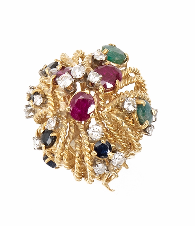 montatura bombata traforata lavorata a cordonetto decorata da rubini, smeraldi, zaffiri e brillanti, g 29, una pietra mancante