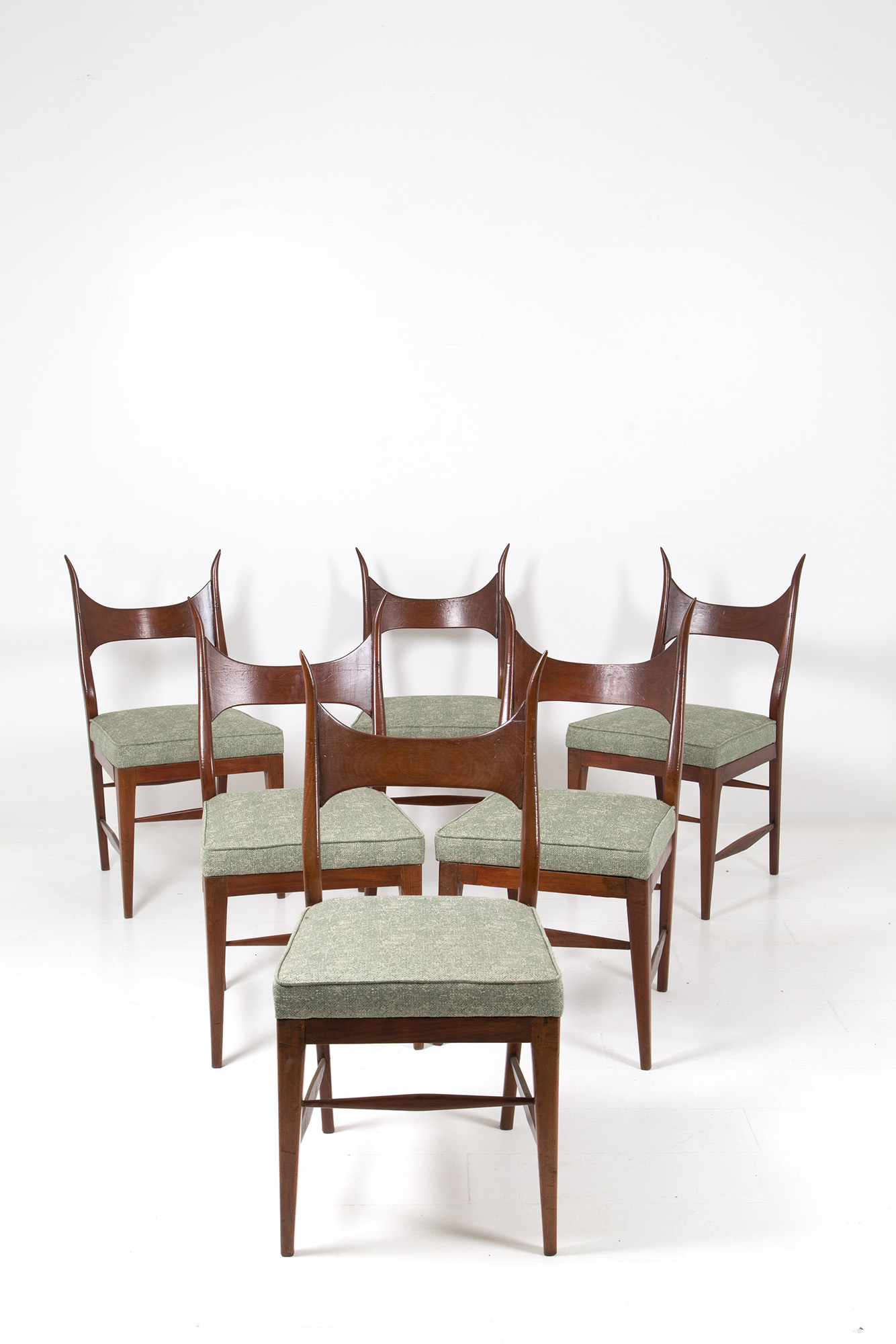 EDWARD WORMLEY (Oswego, 1907 - Illinois, 1995). Sei sedie in legno con seduta imbottita. Anni '50. Mis. Lung. cm. 46 Alt. cm. 91.5 Prof. cm. 47 ca.
