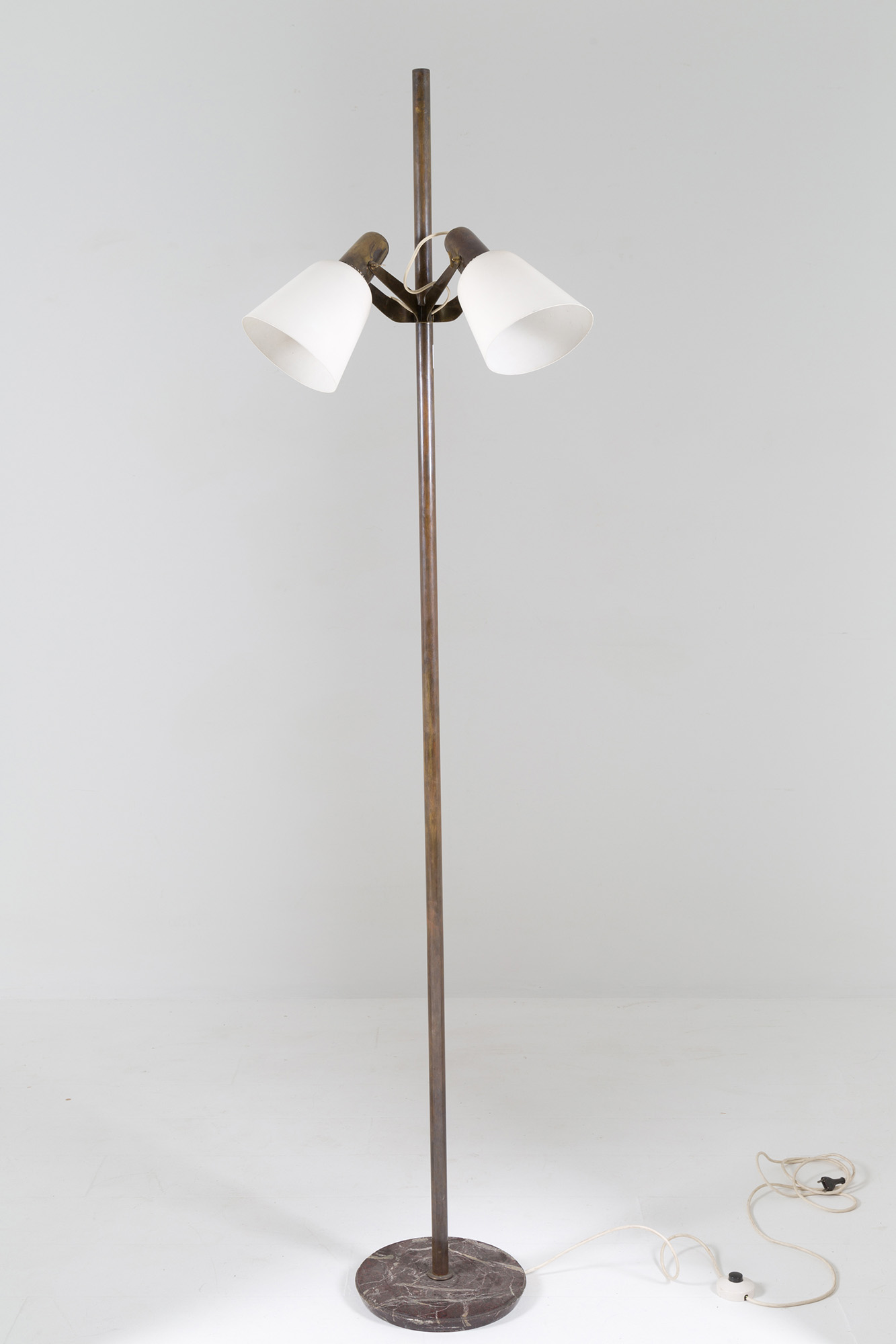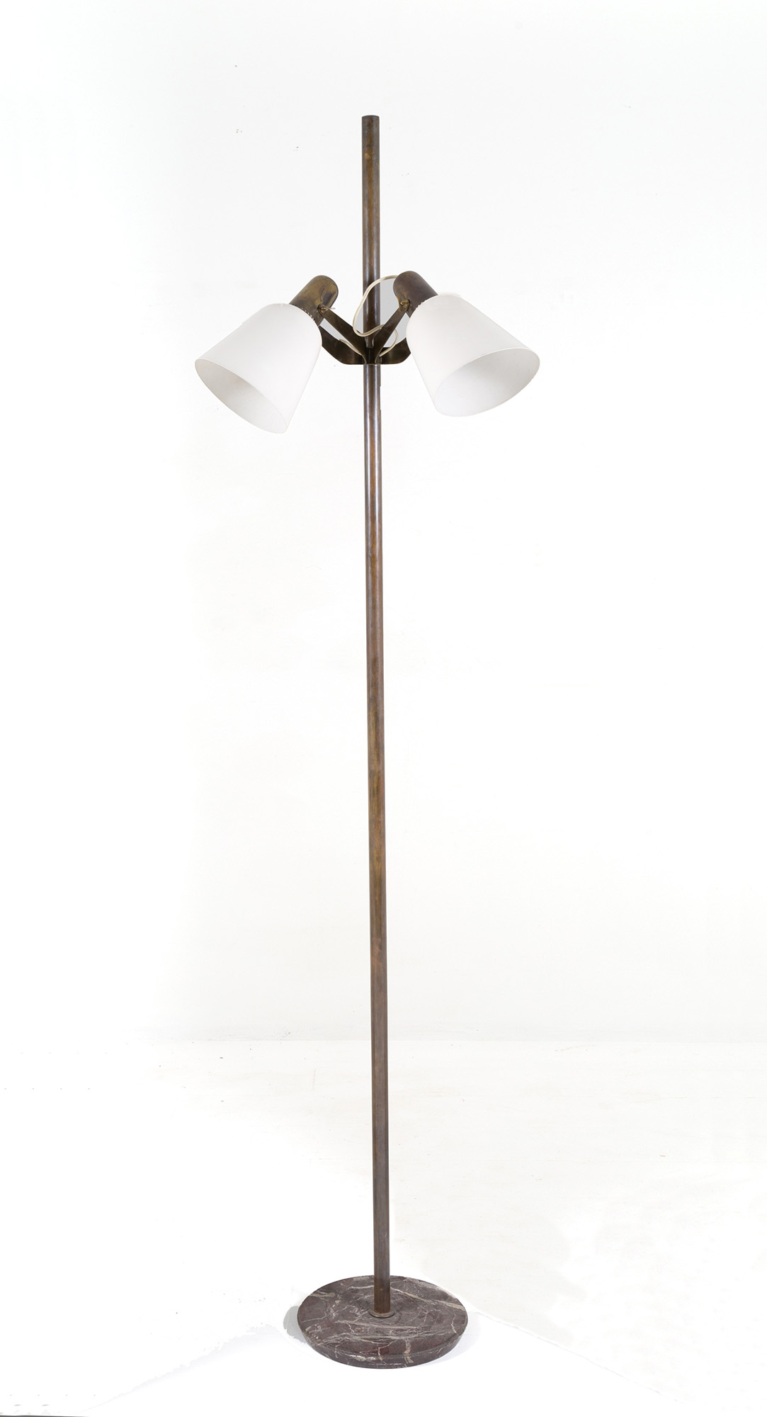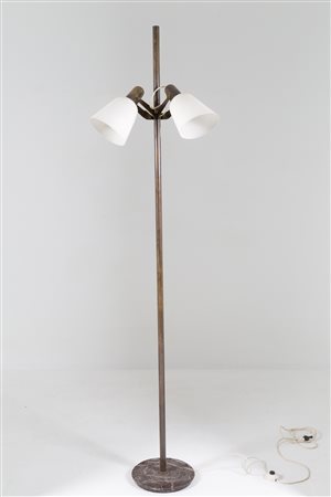 GINO SARFATTI (Venezia, 1912 - Gravedona, 1985) per ARTELUCE. Lampada da terra in ottone e metallo smaltato. Base in marmo. Anni '50. Certificata. Esempio simile pubblicato in M. Romanelli e S. Severi, Gino Sarfatti. Opere scelte 1938-1973. Mis. Alt. cm. 205 ca.