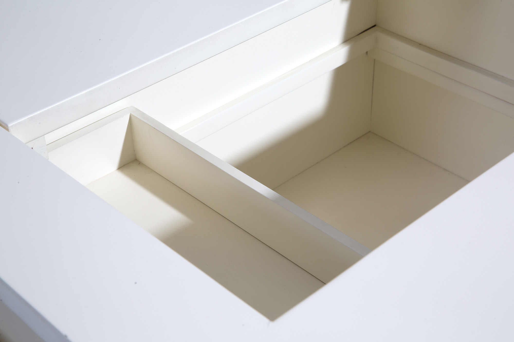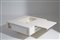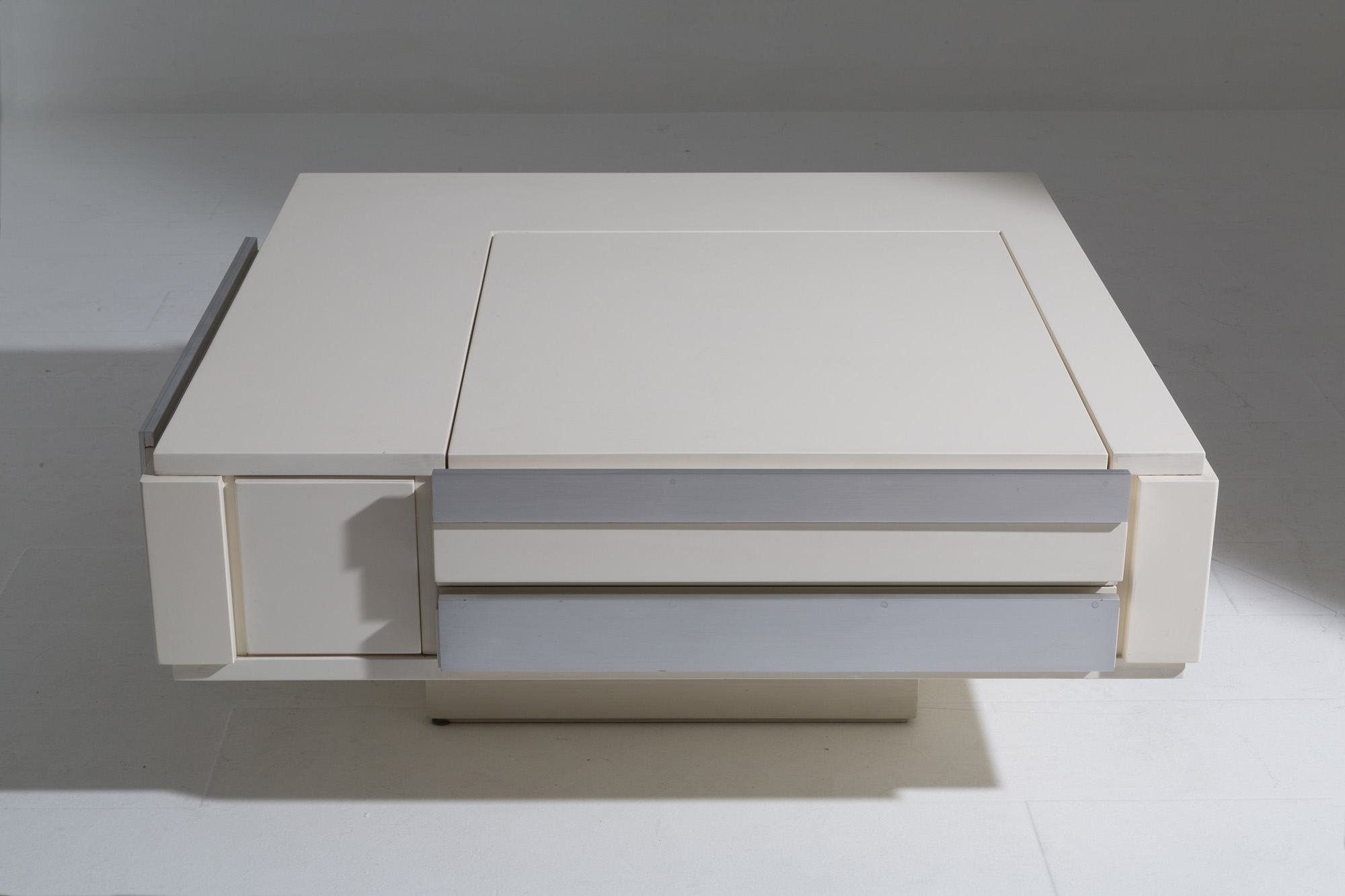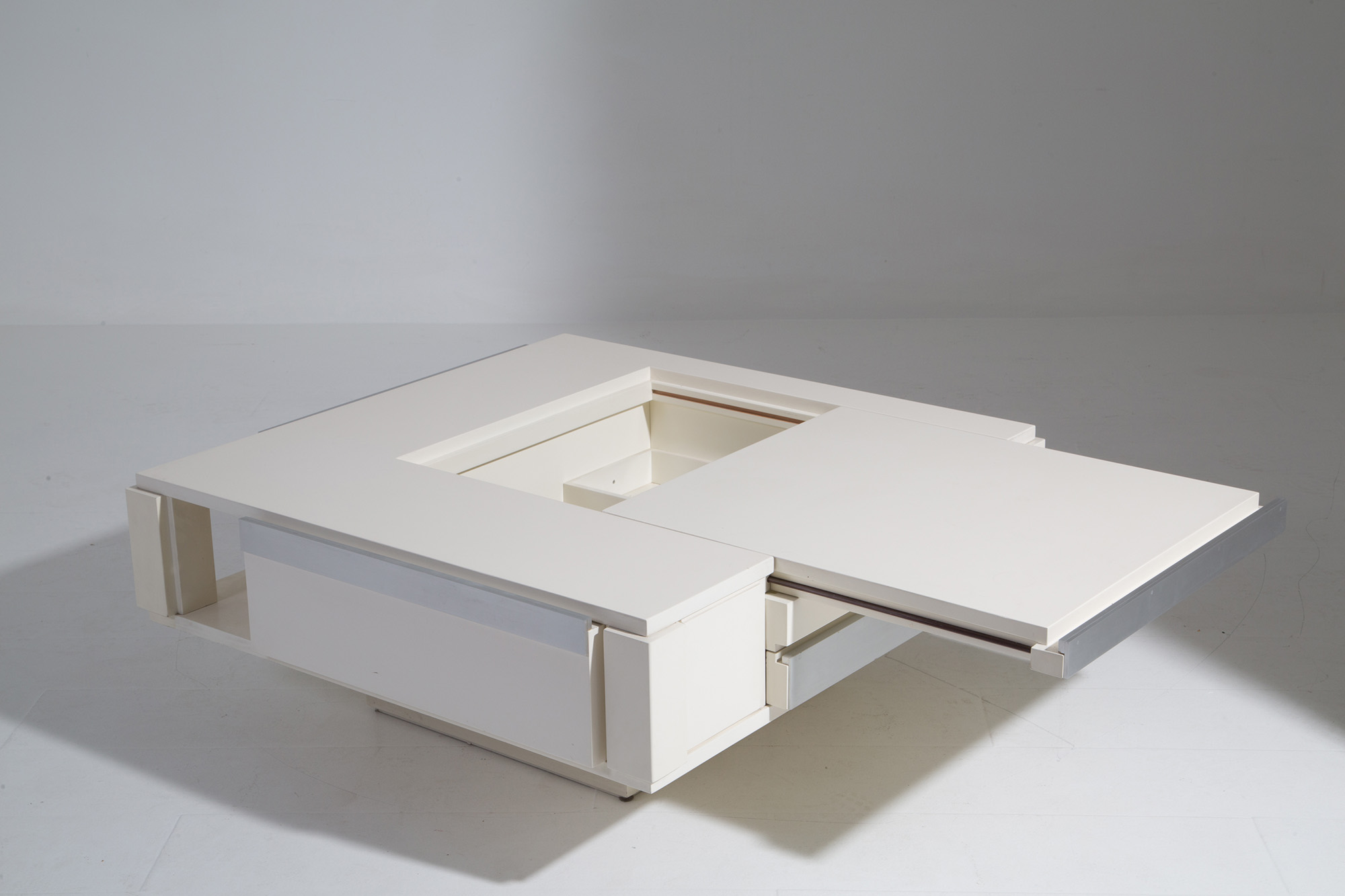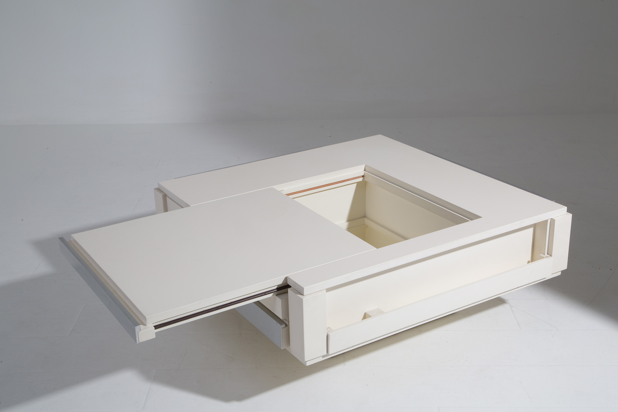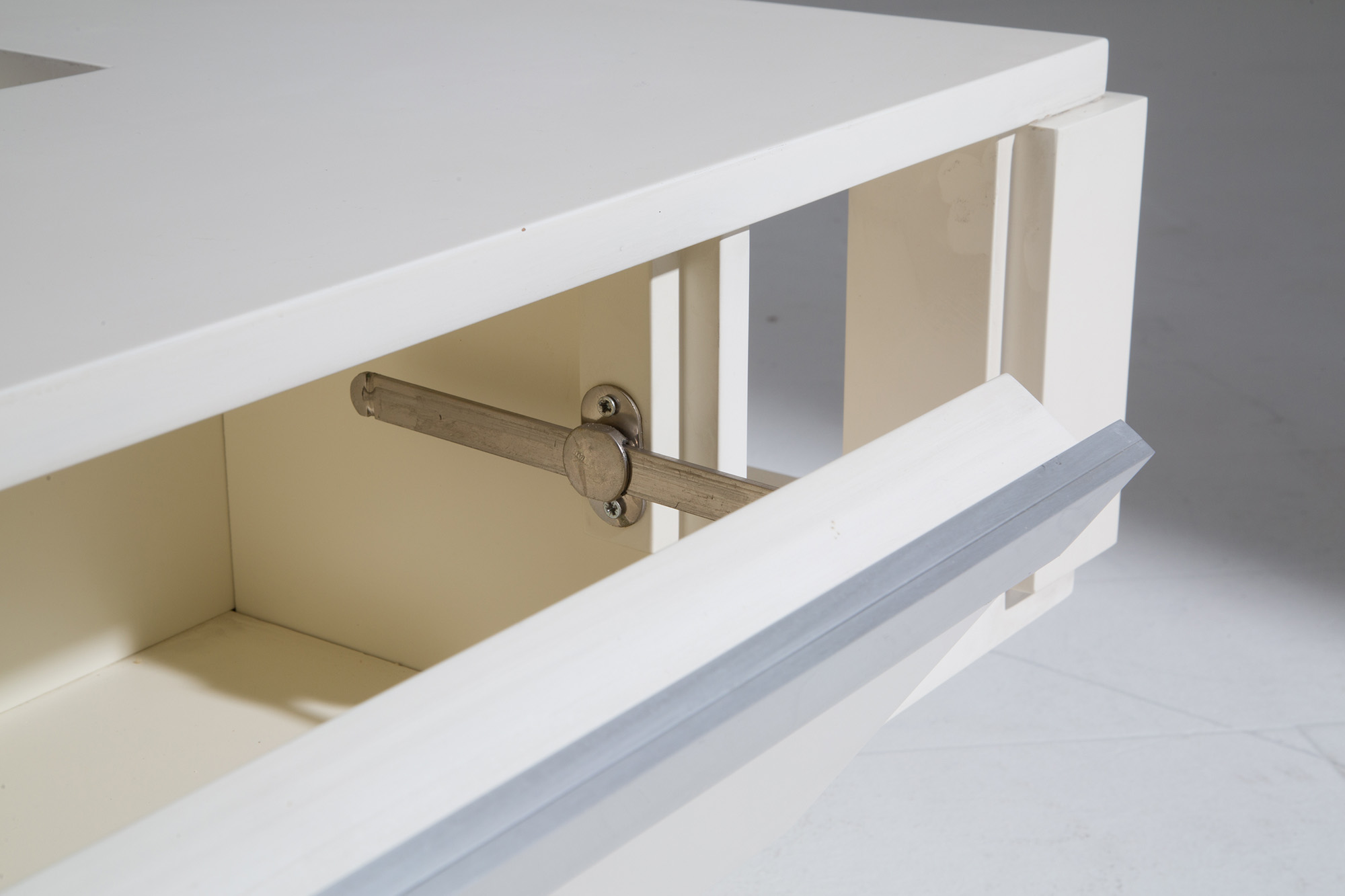 CESARE AUGUSTO NAVA. Coffee-table in legno laccato bianco con profili in metallo grigio, vani portaoggetti e un cassetto sulla fascia. Anni '70. Segni di usura. Con certificato dell'artista su fotografia. Mis. Lung. cm. 97 Alt. cm. 38 Prof. cm. 95 ca.