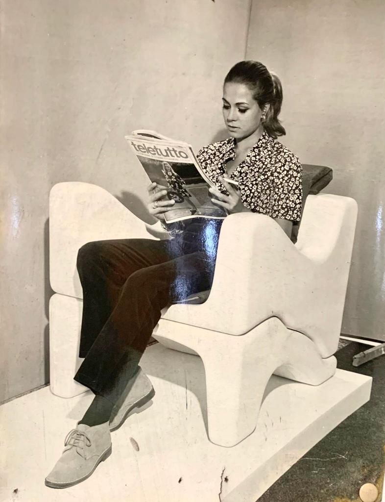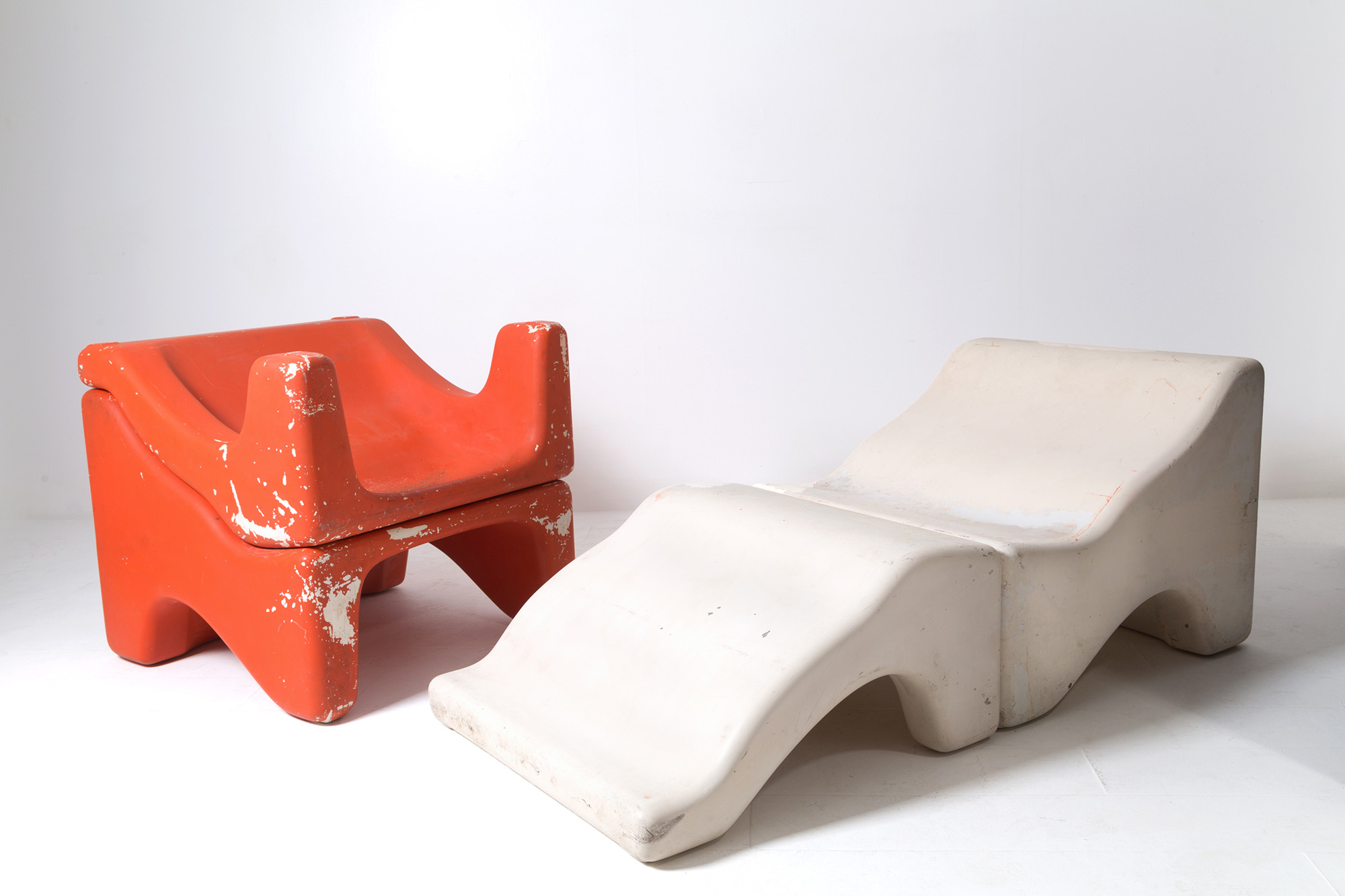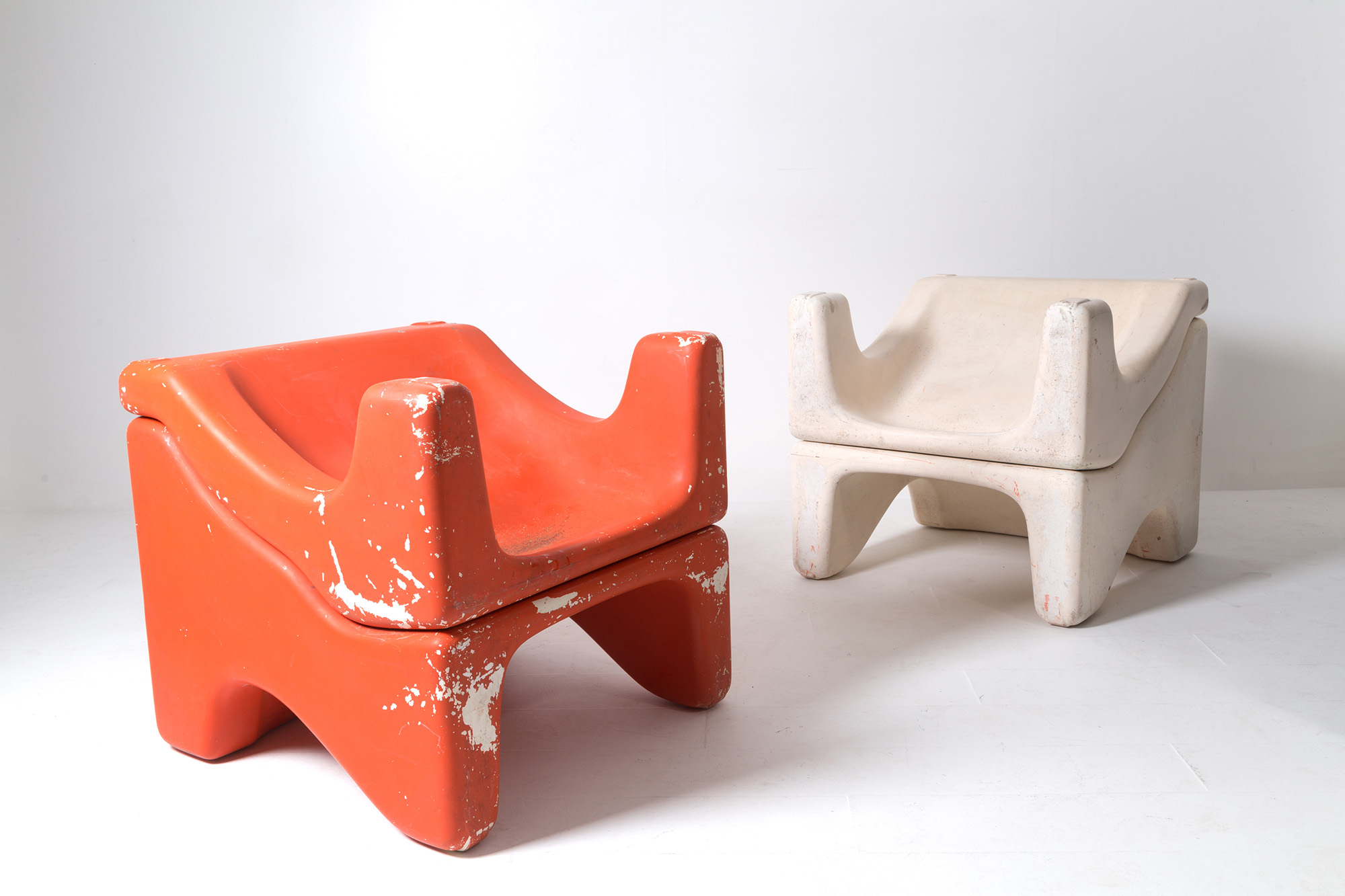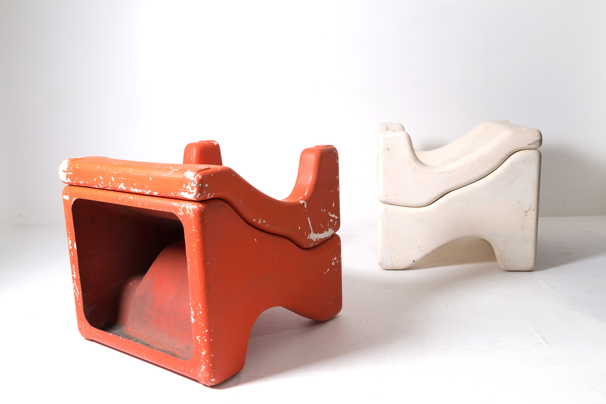 CESARE AUGUSTO NAVA. Due rare poltrone modulari quattro pezzi in vetroresina. Anni '60-'70. Pubblicate su Domus. Difetti. Mis. poltrona Lung. cm. 80 Alt. cm. 64 Prof. cm. 80 Mis. pouff Lung. cm. 80 Alt. cm. 38 Prof. cm. 80