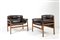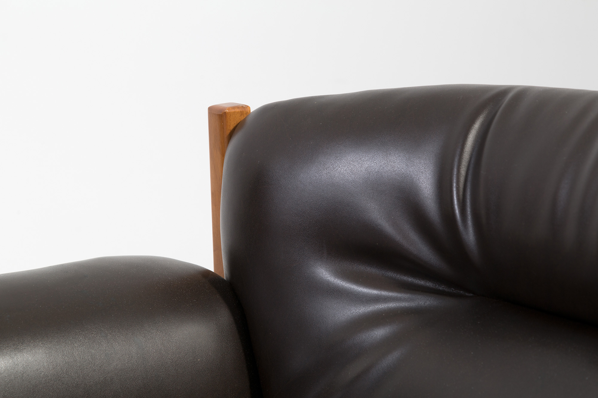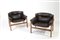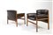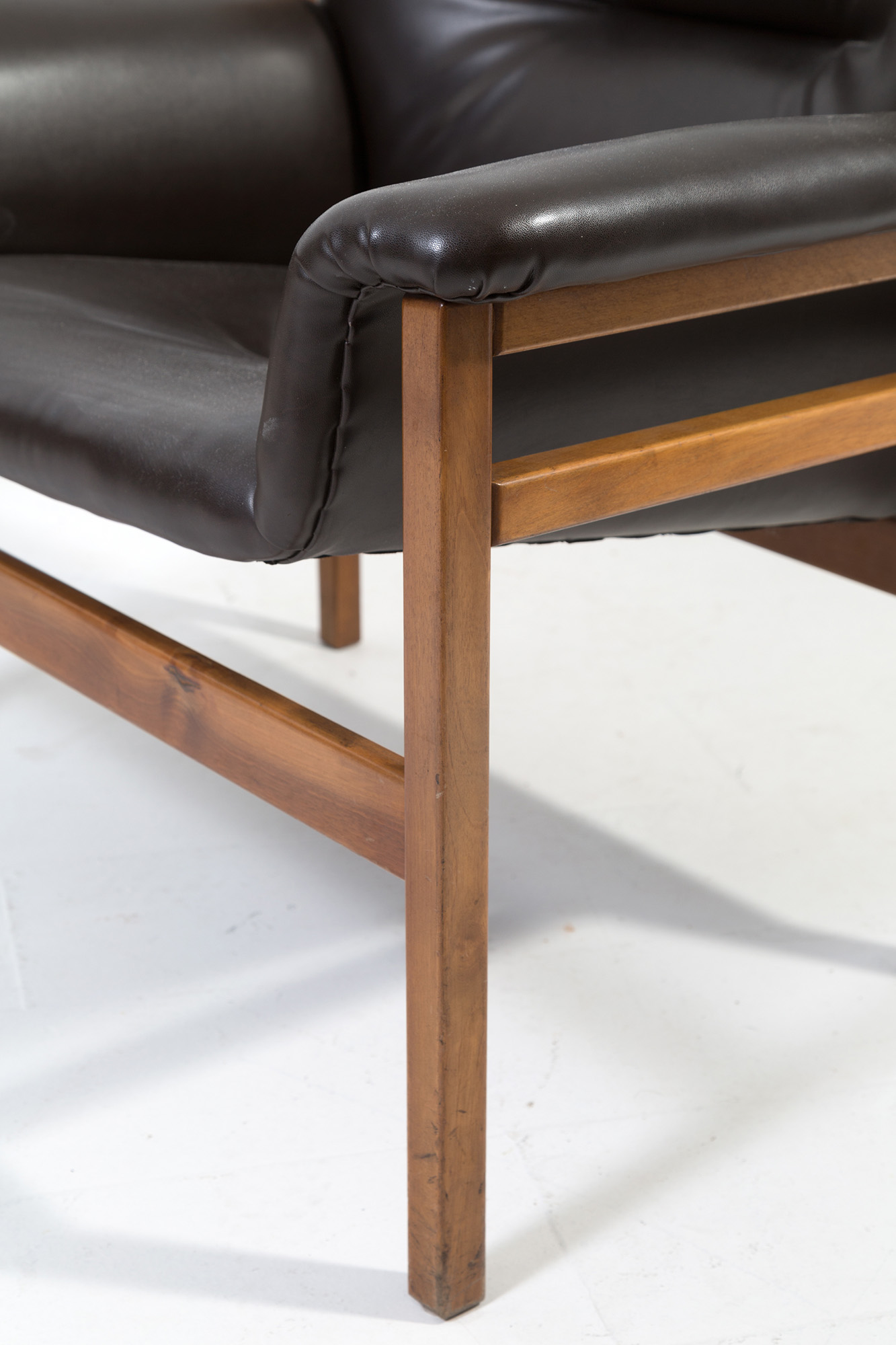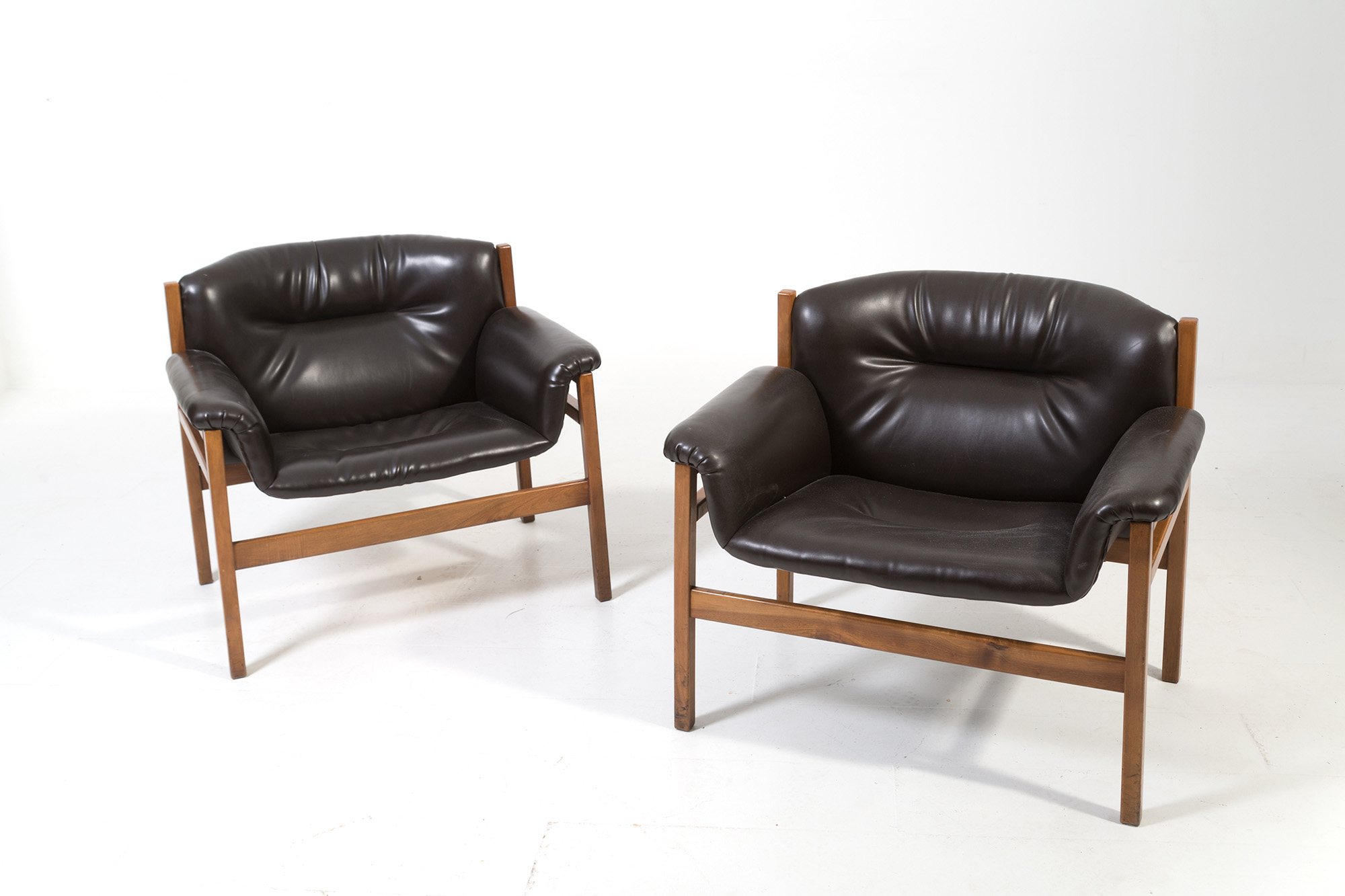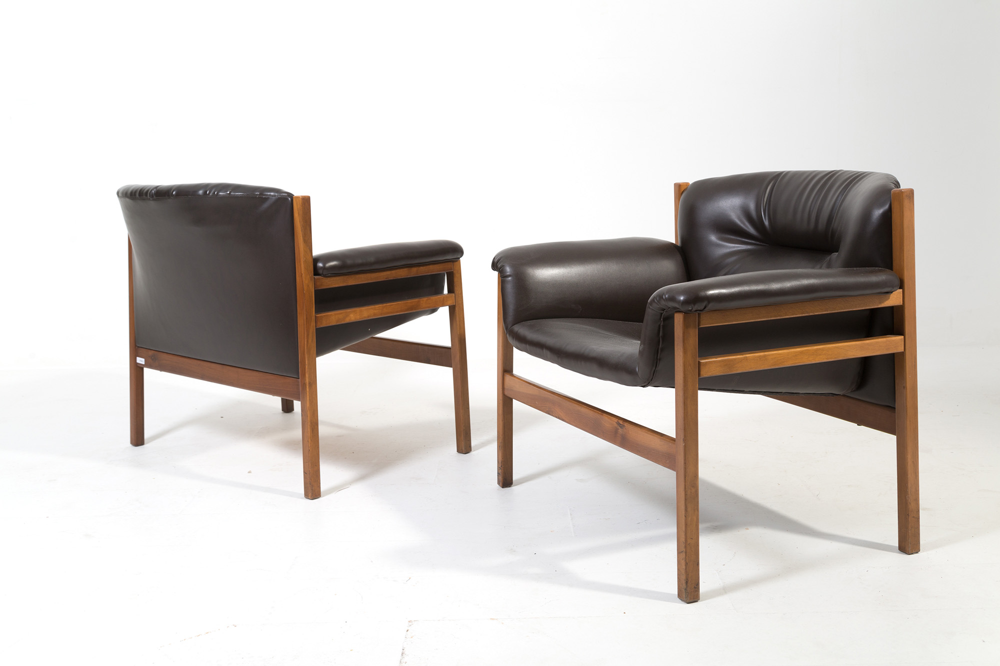 TITO AGNOLI (Lima, 1931 - Milano, 2012). Due poltrone in legno e sky nero. Anni '60. Mis. Lung. cm. 80 Alt. cm. 70 Prof. cm. 70 ca.