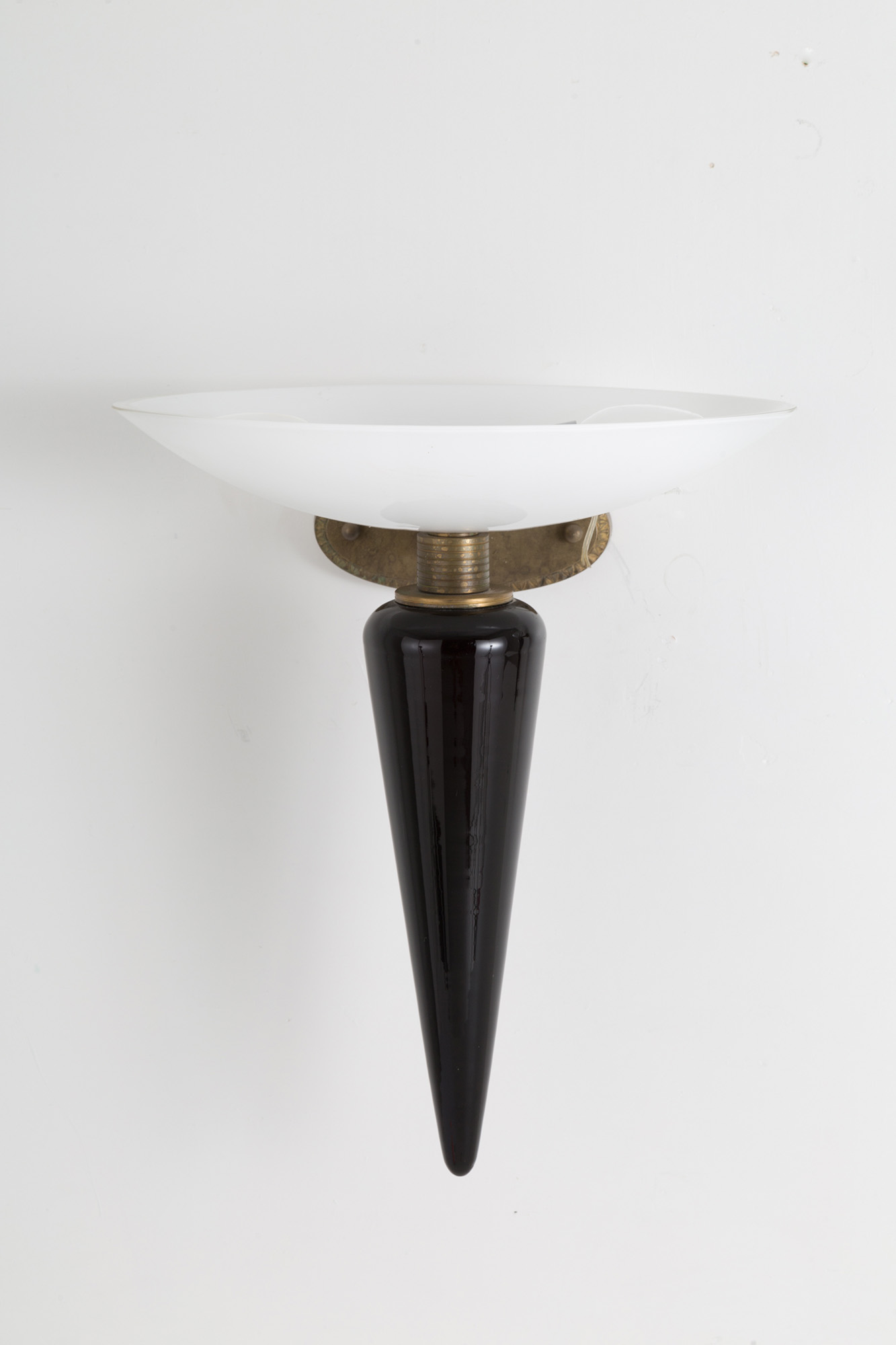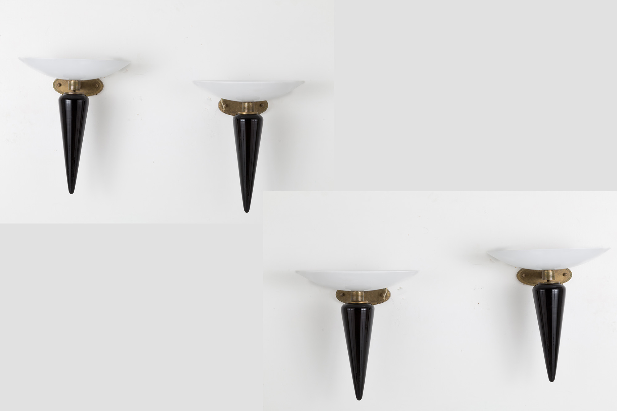Quattro applique in vetro nero, lattimo e ottone. Anni '70. Mis. Lung. cm. 37 Alt. cm. 45 Prof. cm. 24 ca.