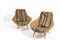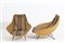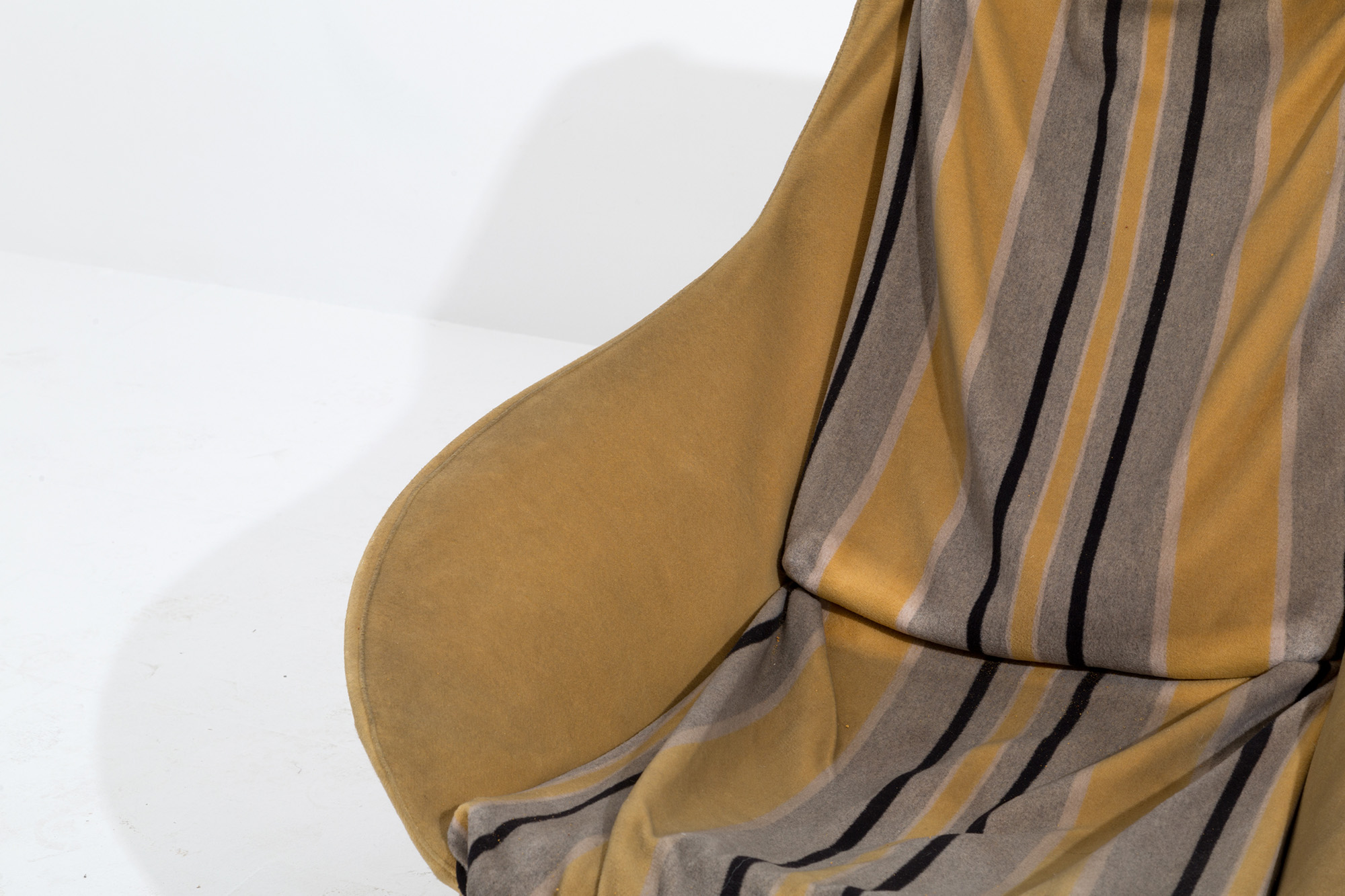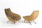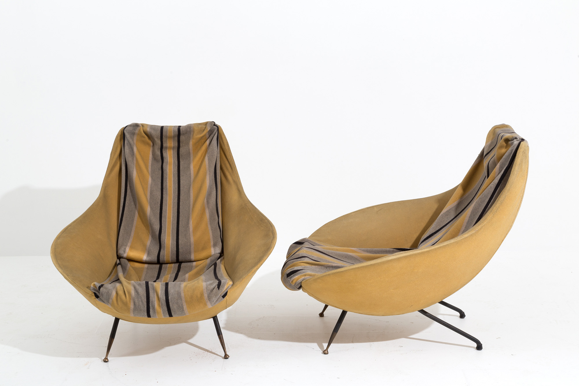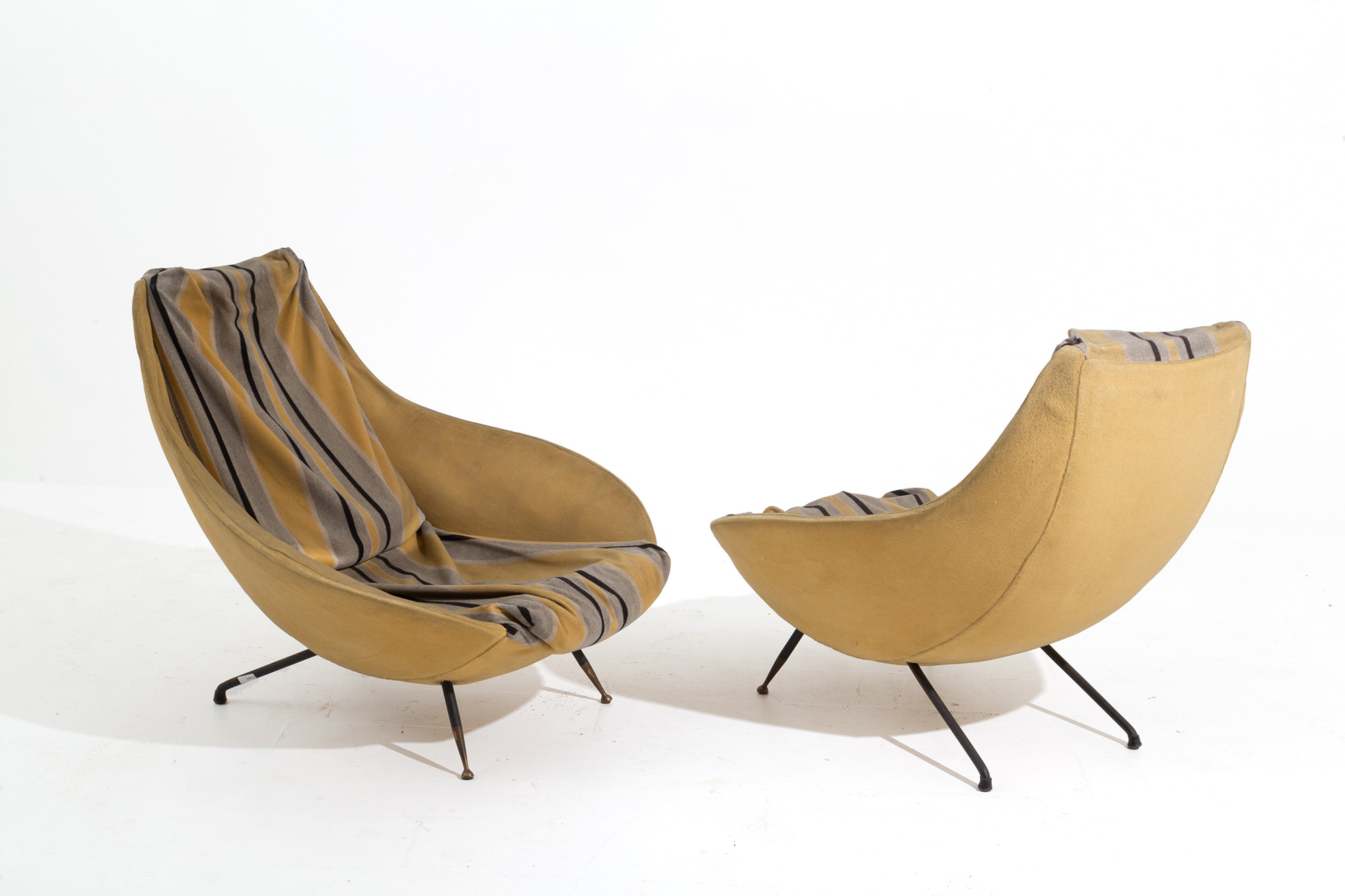 Coppia di rare poltrone rivestite in tessuto giallo. Manifattura italiana. Anni '50. Mis. Lung. cm. 90 Alt. cm. 85 Prof. cm. 80 ca.