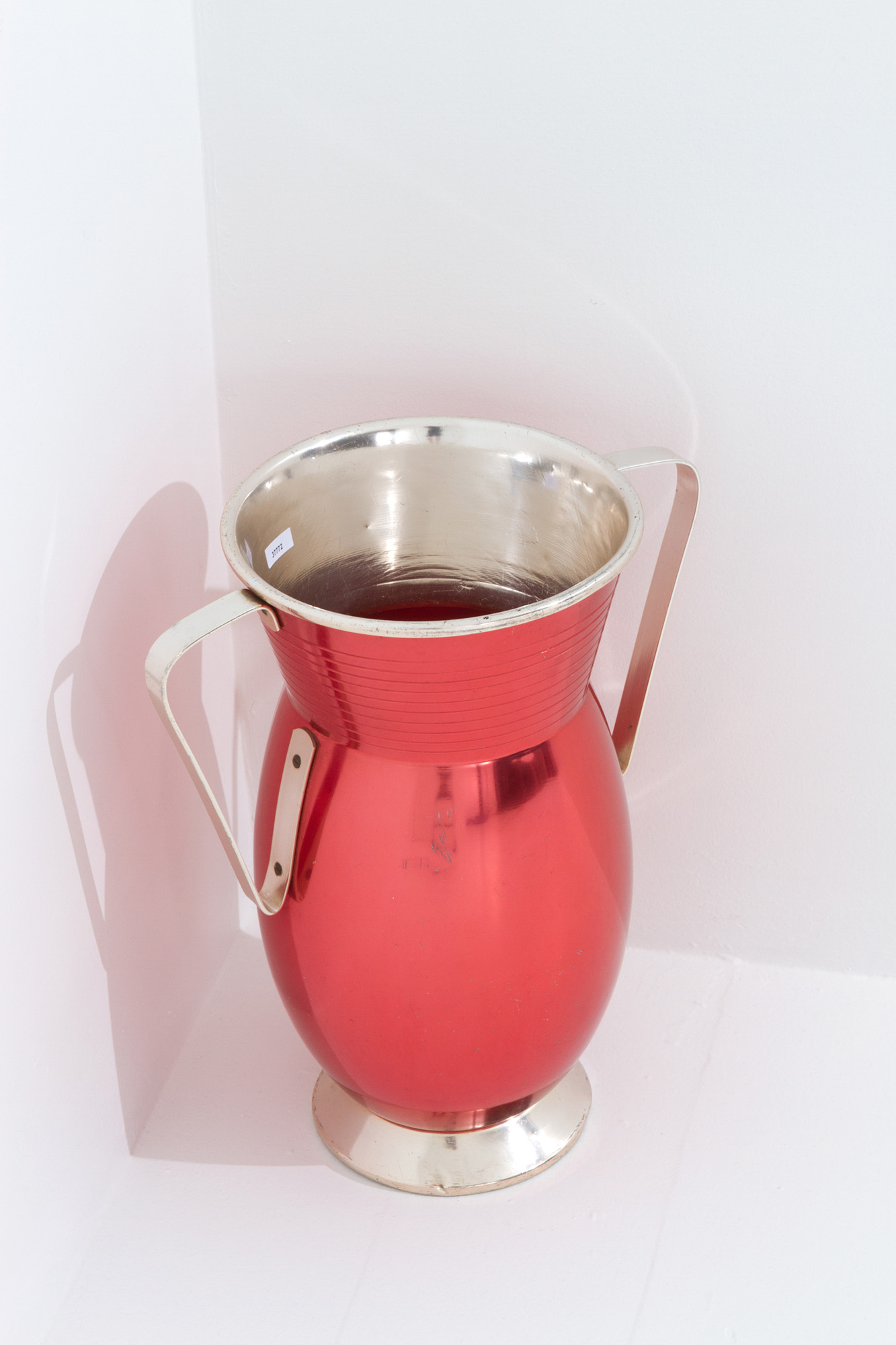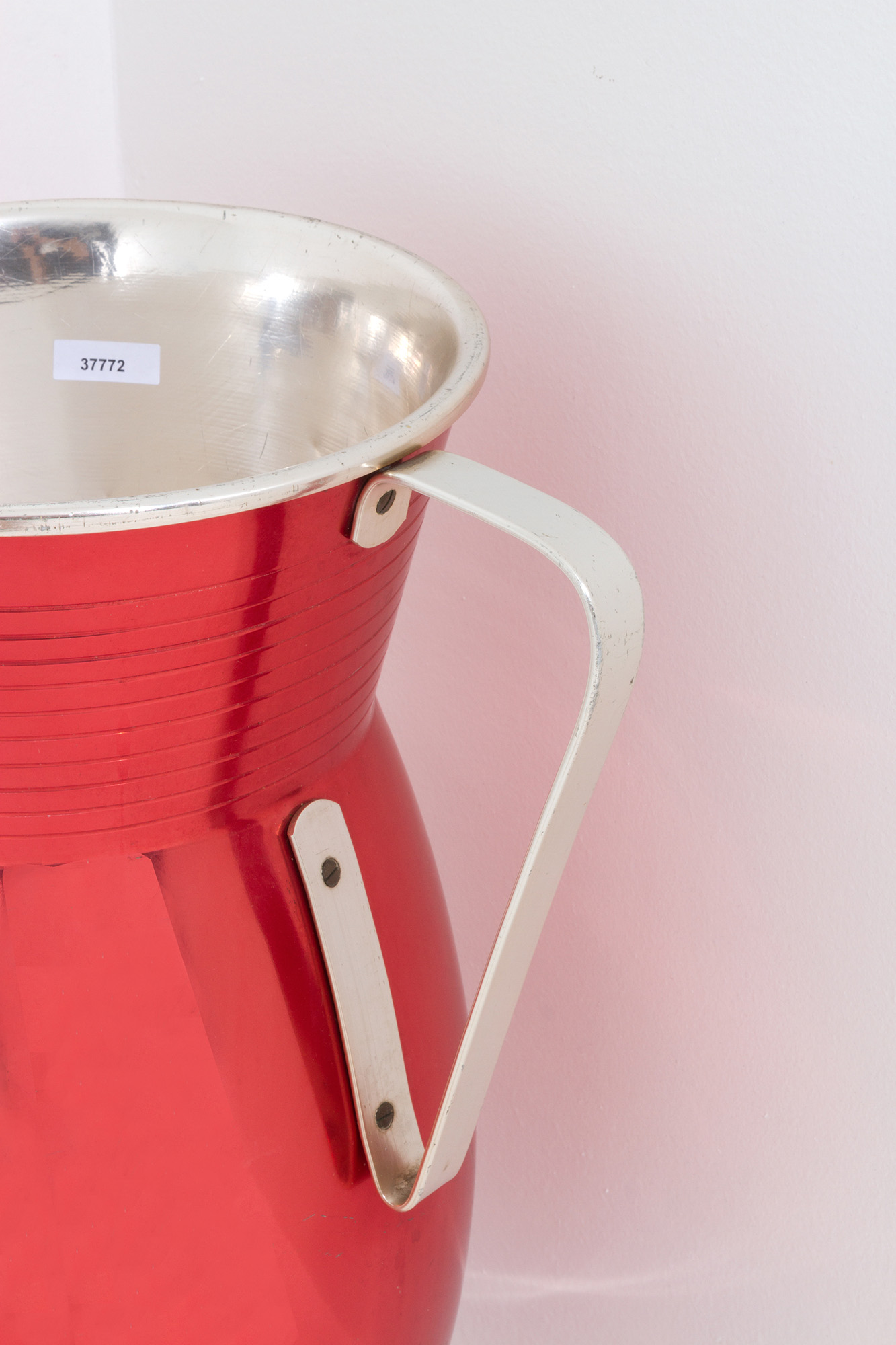 ETTORE SOTTSASS (Innsbruck, 1917 - Milano, 2007) per RINNOVELL. Portaombrelli a forma di coppa in metallo cromato verniciato rosso. Marchio sul fondo. Anni '50. Difetti e usure del tempo. Mis. Lung. cm. 46 Alt. cm. 50 Diam. cm. 28 ca.
