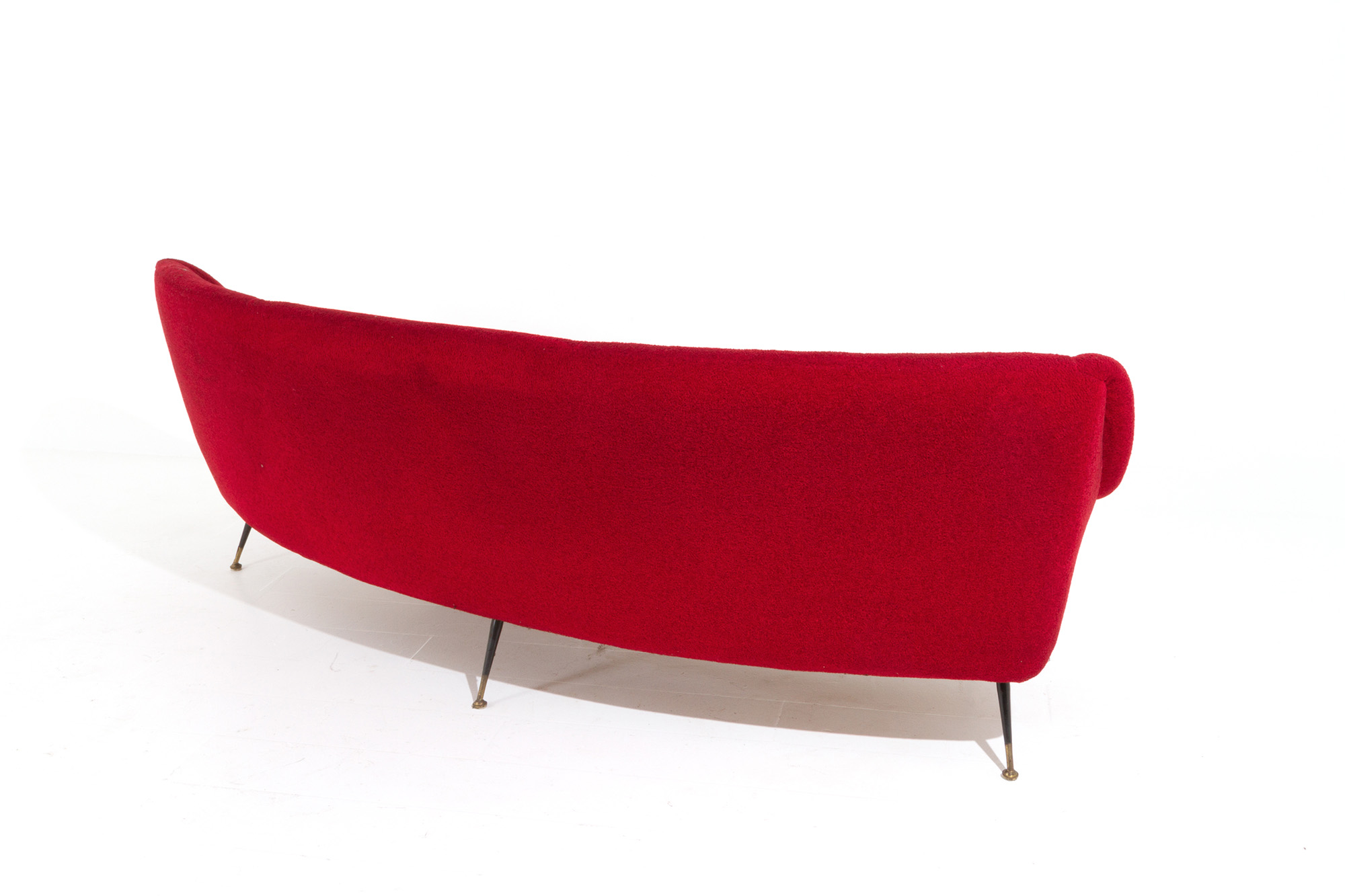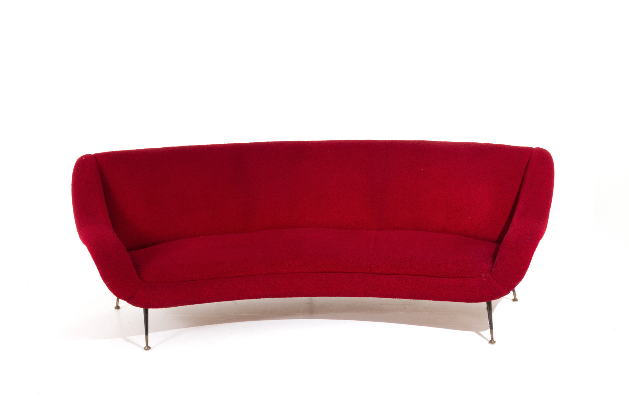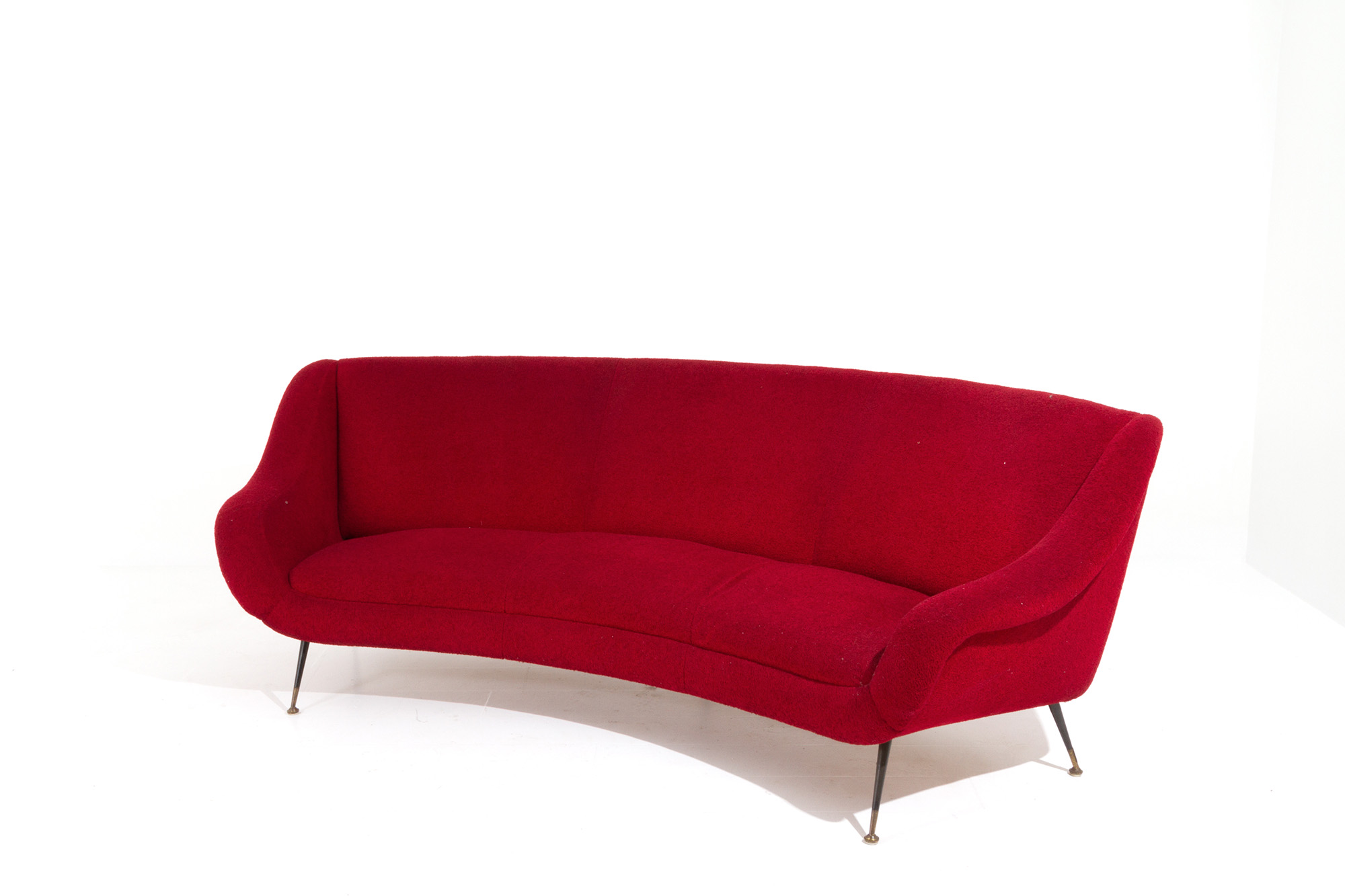 GIGI RADICE. Divano in lana rossa con piedini in metallo. Anni '50. Mis. Lung. cm. 250 Alt. cm. 81 Prof. cm. 100 ca.