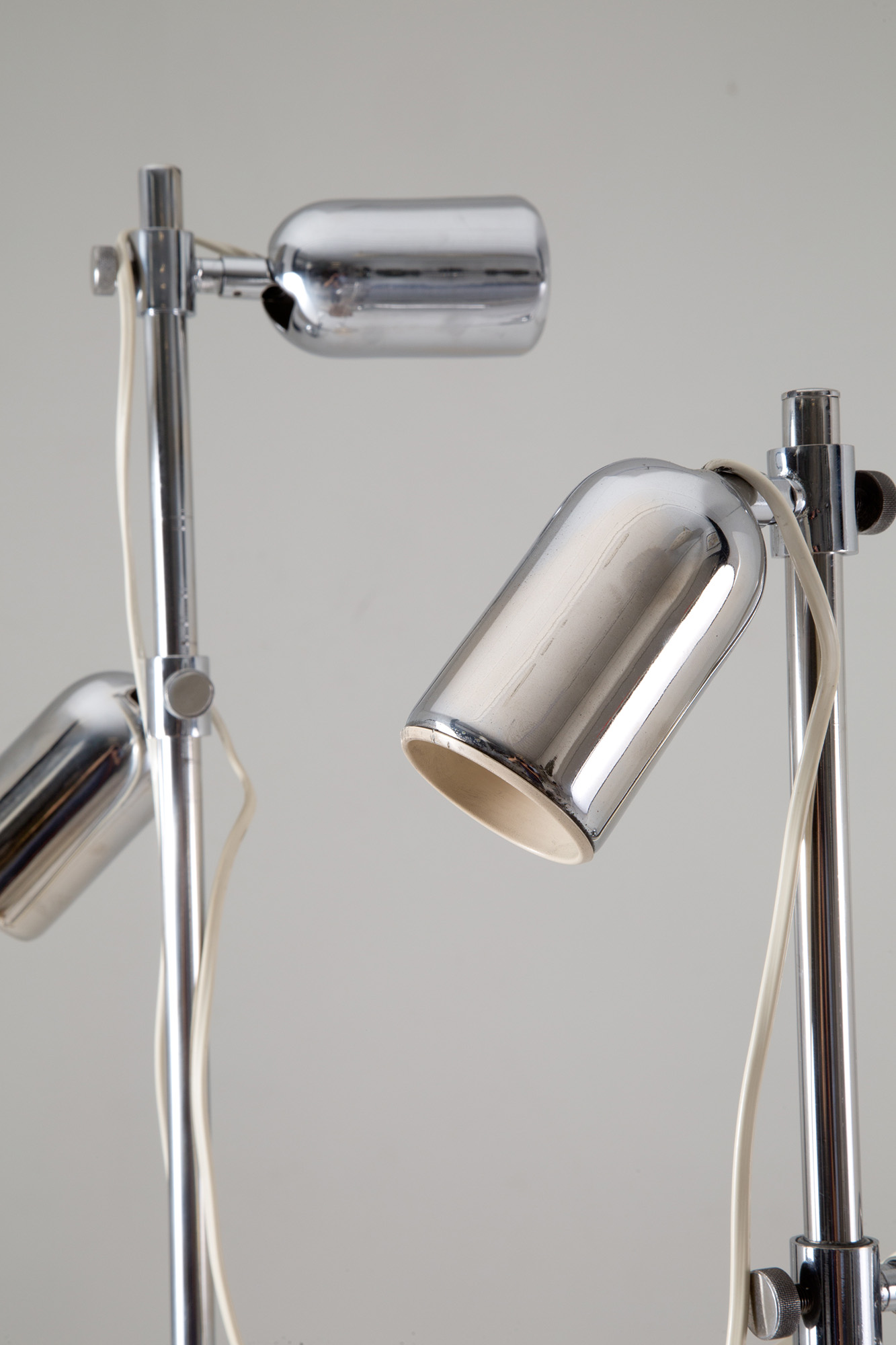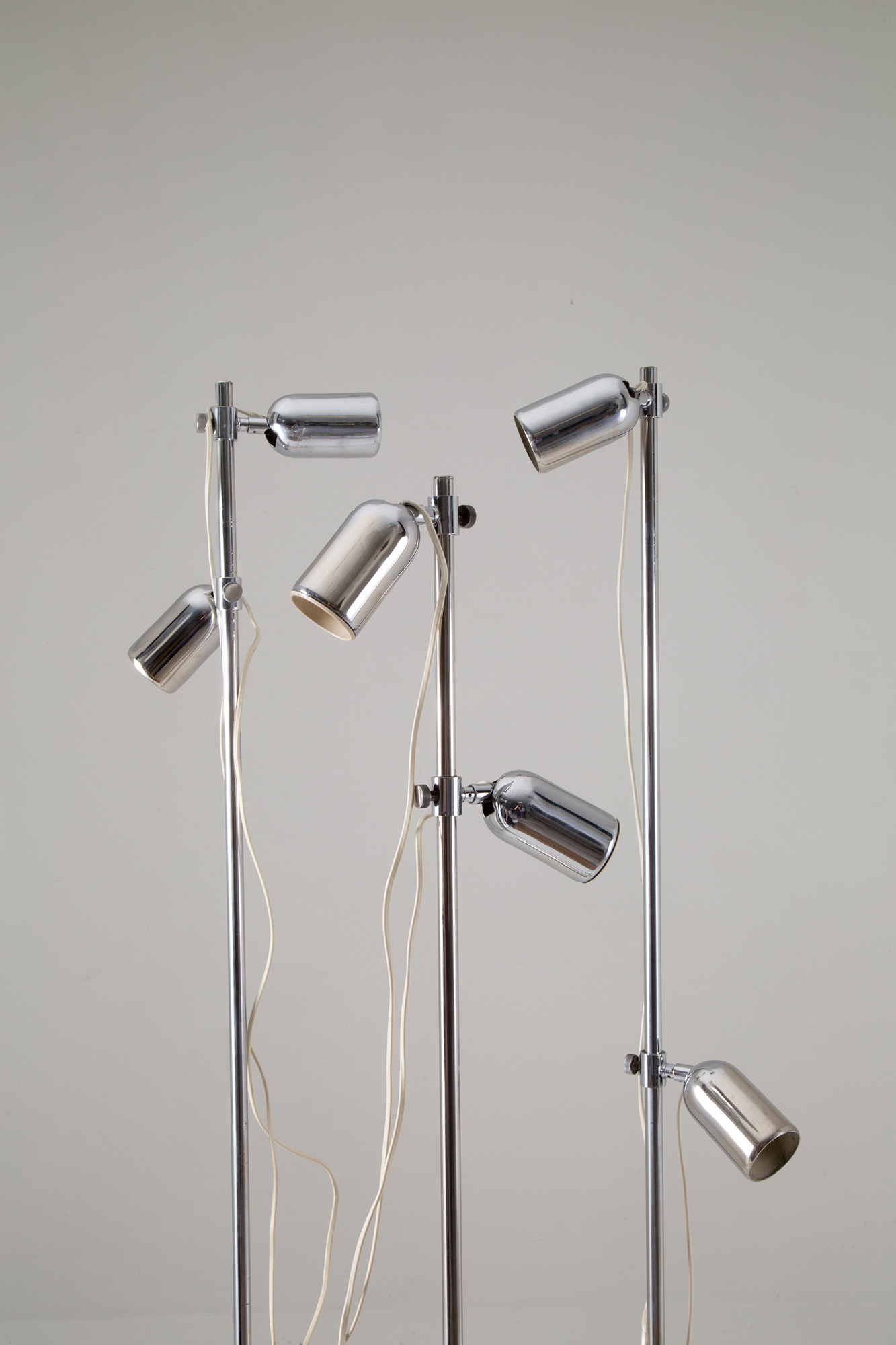 GOFFREDO REGGIANI (1929-2004) per REGGIANI. Tre piantane due luci in acciaio cromato. Con marchio del produttore sul fondo. Anni '70. Mis. Alt cm. 175 due e una 163 Diam. cm. 30 ca.
