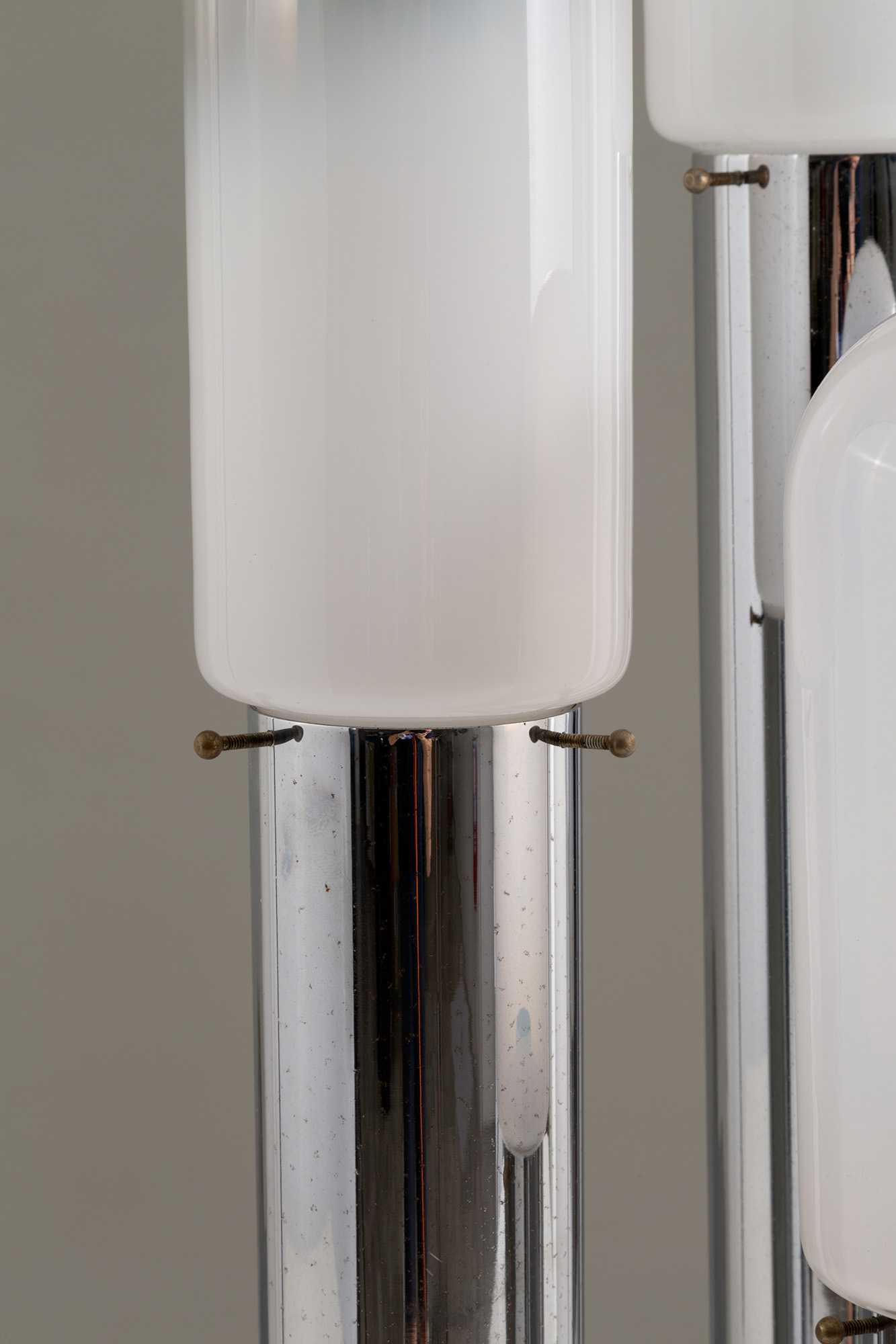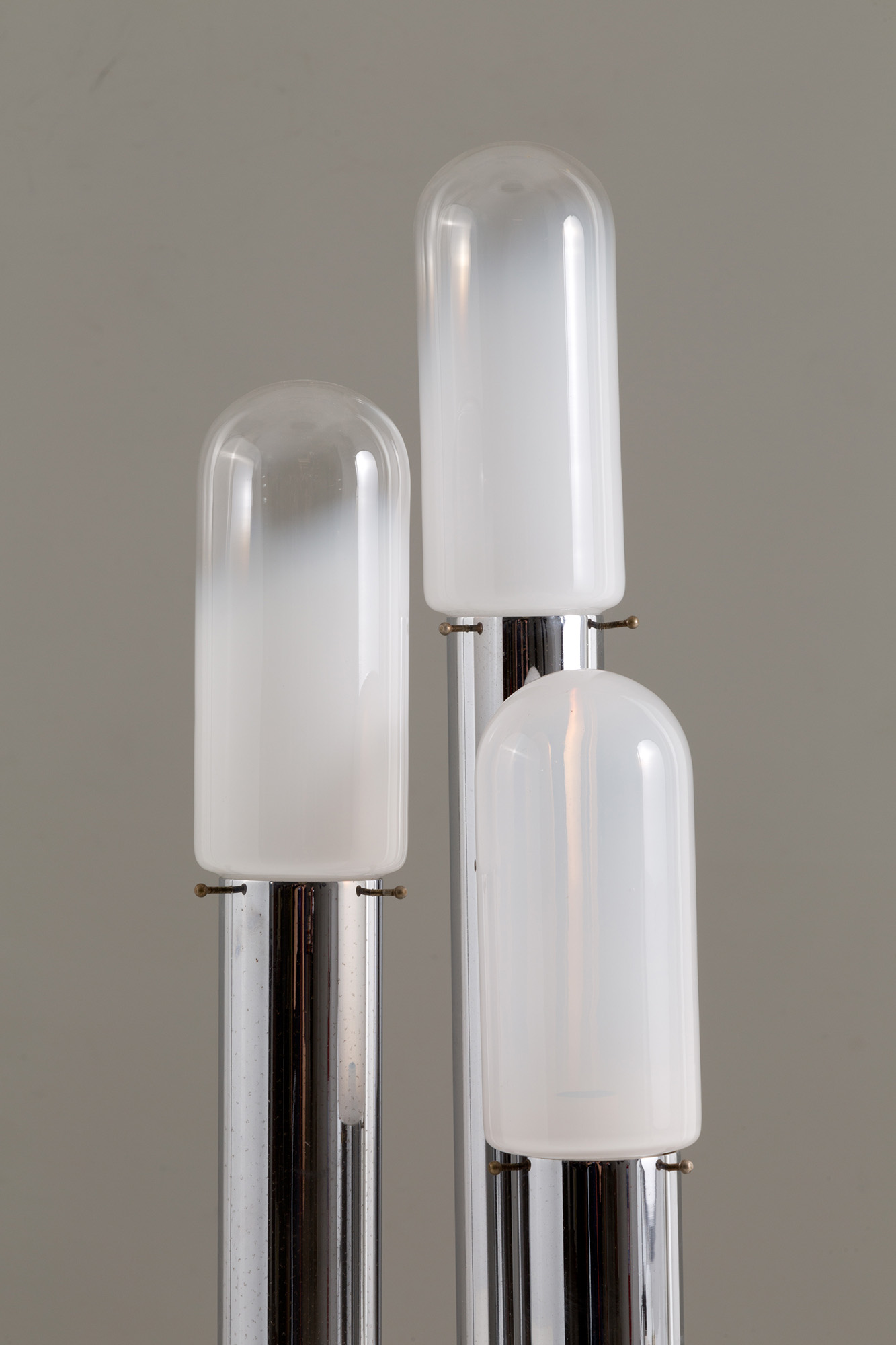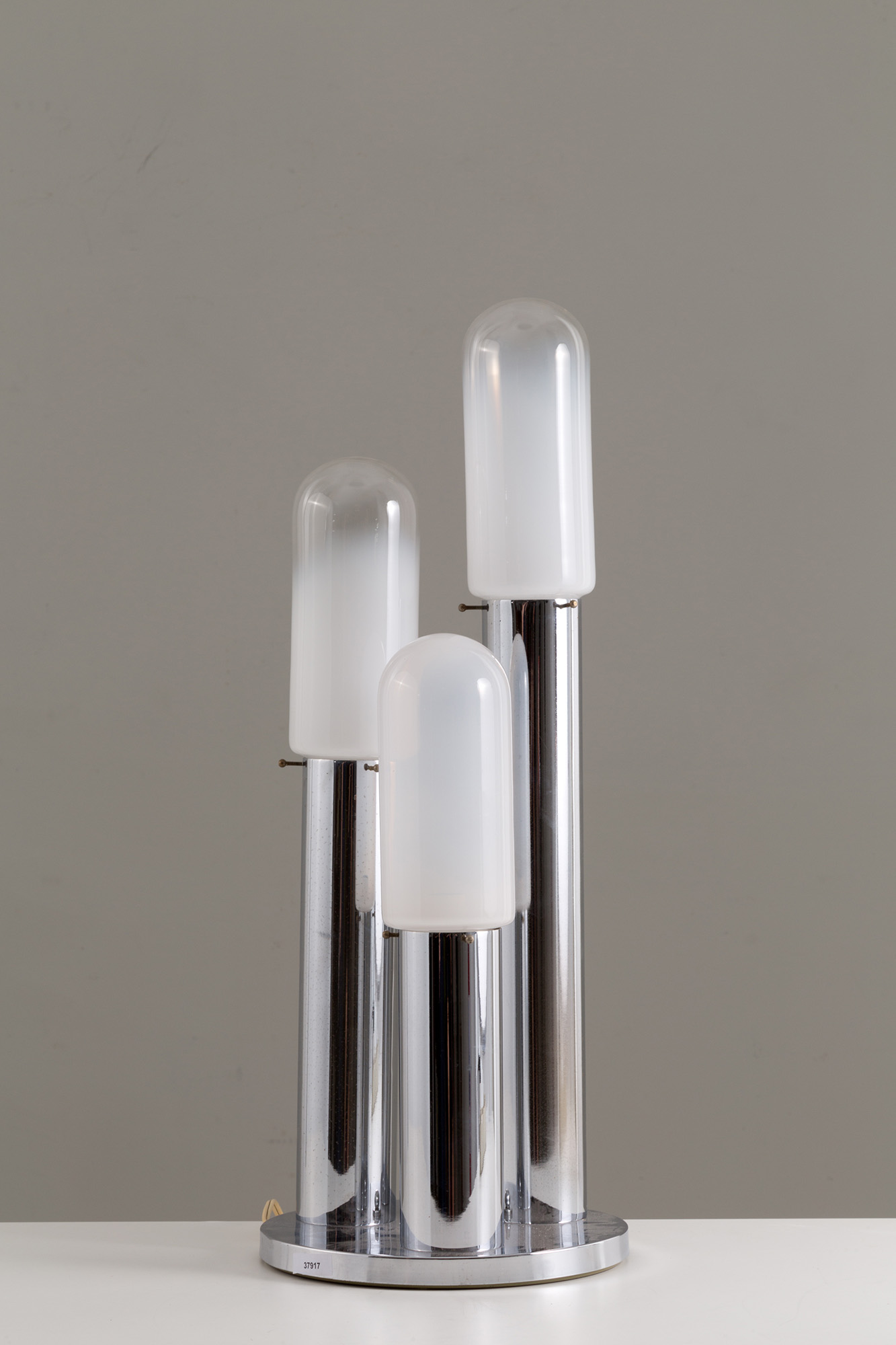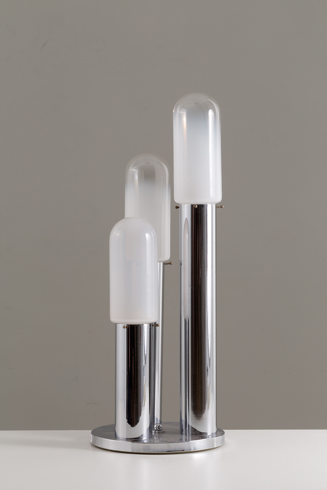 Lampada da tavolo tre luci in vetro di Murano con base in metallo cromato. Anni '70. Mis. Alt. cm. 67 Diam. cm. 26 ca.