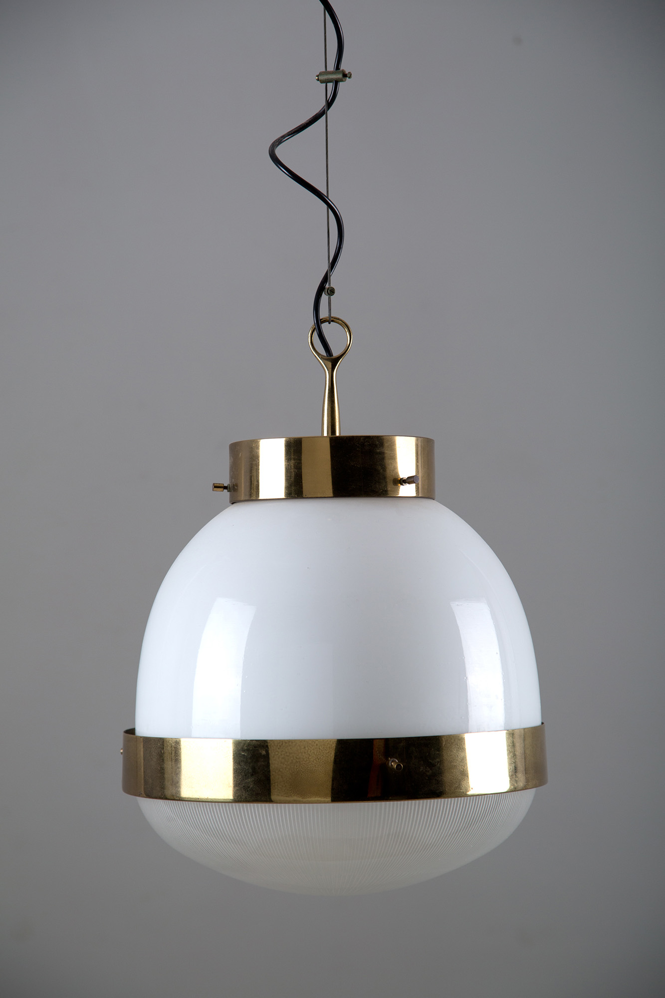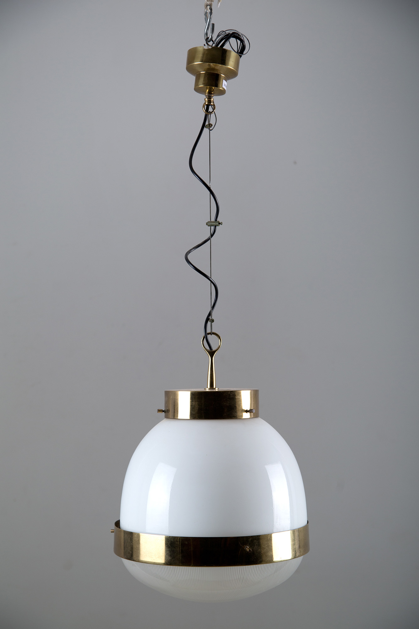 SERGIO MAZZA (Milano, 1931) per ARTEMIDE. Lampadario Delta Grande ad altezza regolabile in vetro e metallo. Anni '60. Alt. min. cm. 60 Alt. max. cm. 150 Mis. Diam. cm. 35 ca.