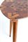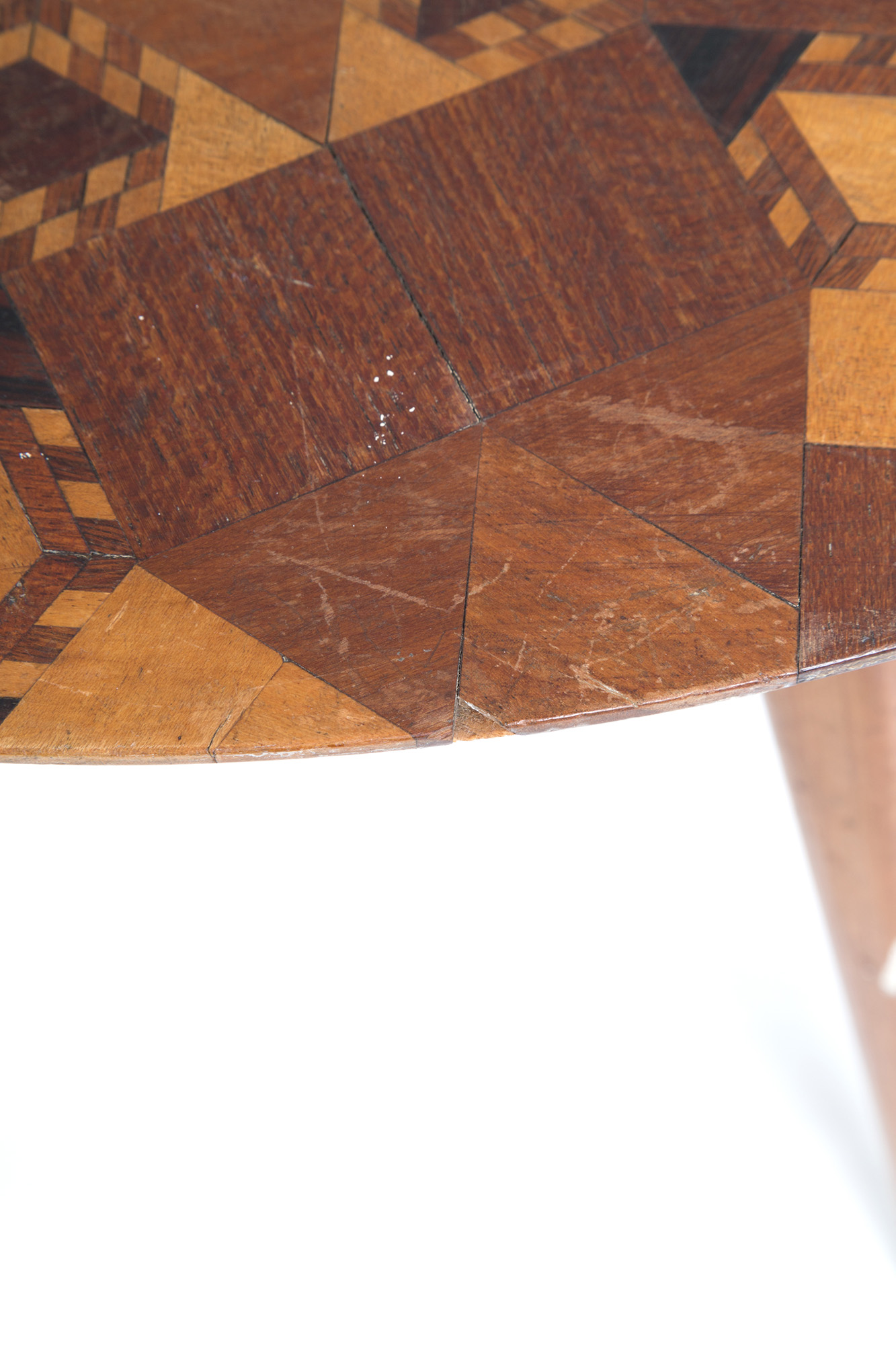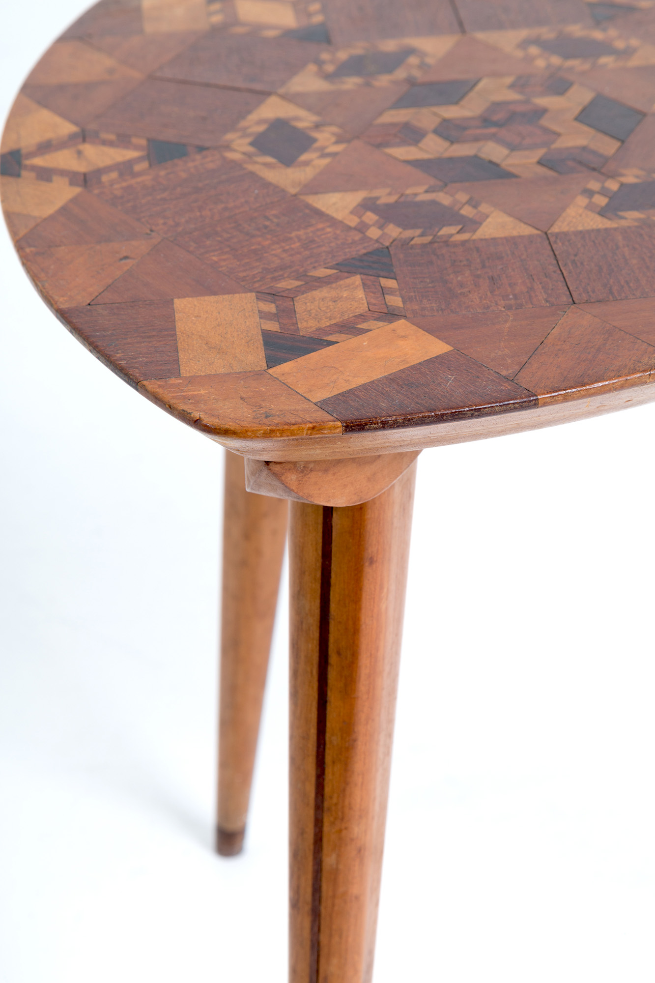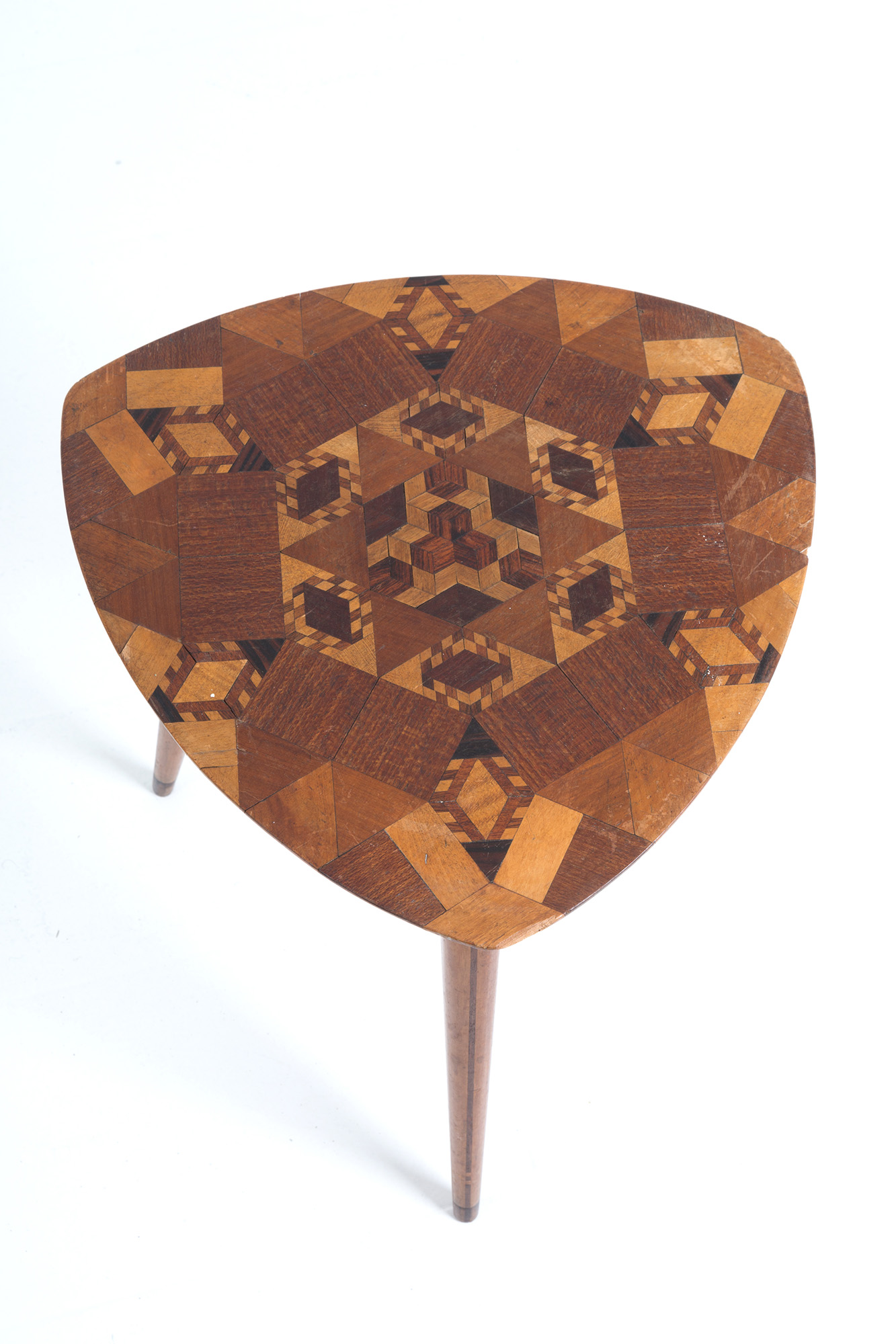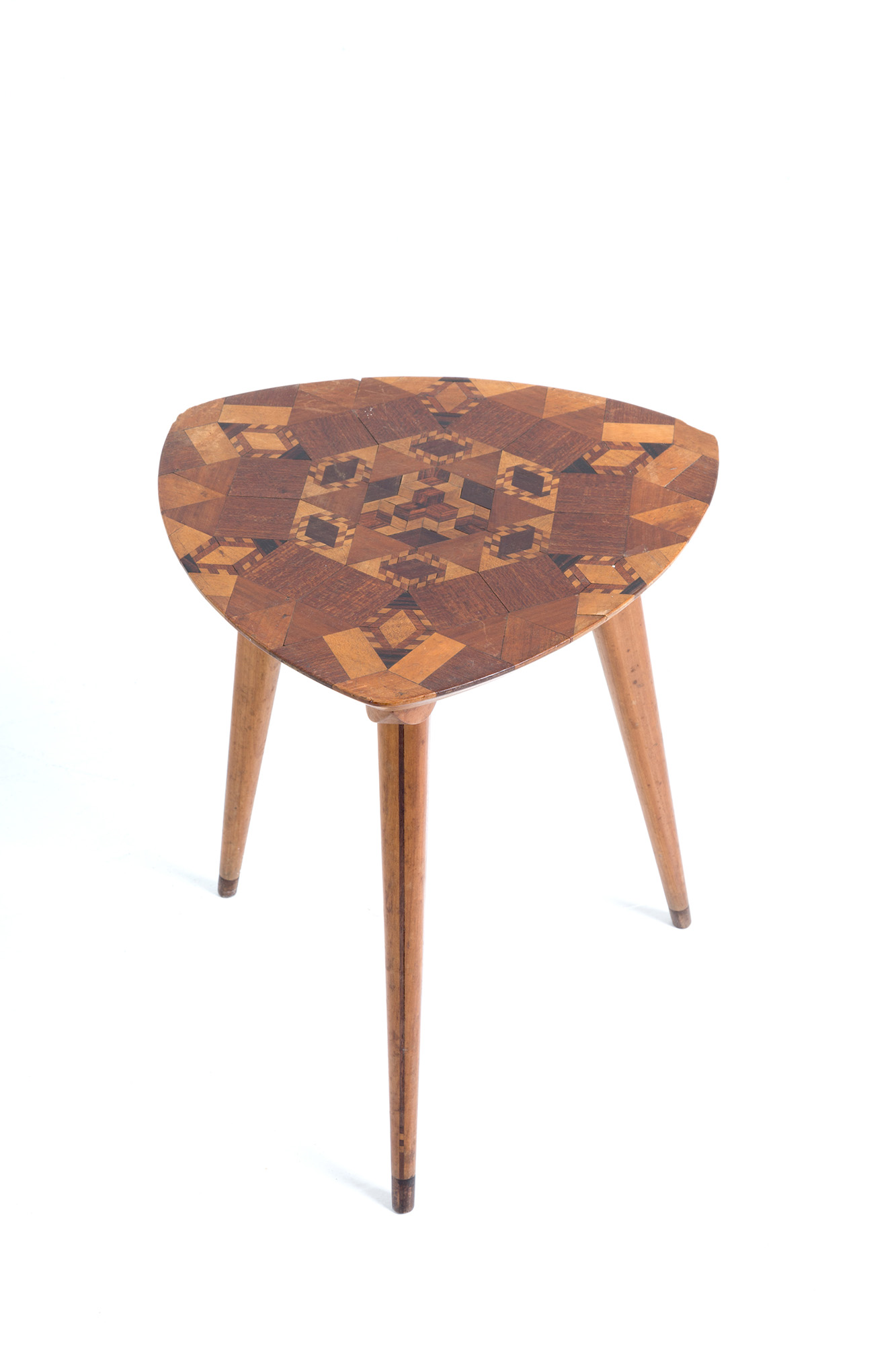 Side table con piano triangolare rifinito e intarsiato a motivi geometrici in varie essenze di legno. Manifattura italiana. Anni '50. Mis. Lung. cm. 36 Alt. cm. 44 Prof. cm. 36 ca.