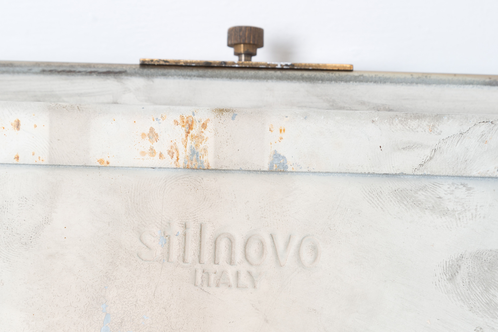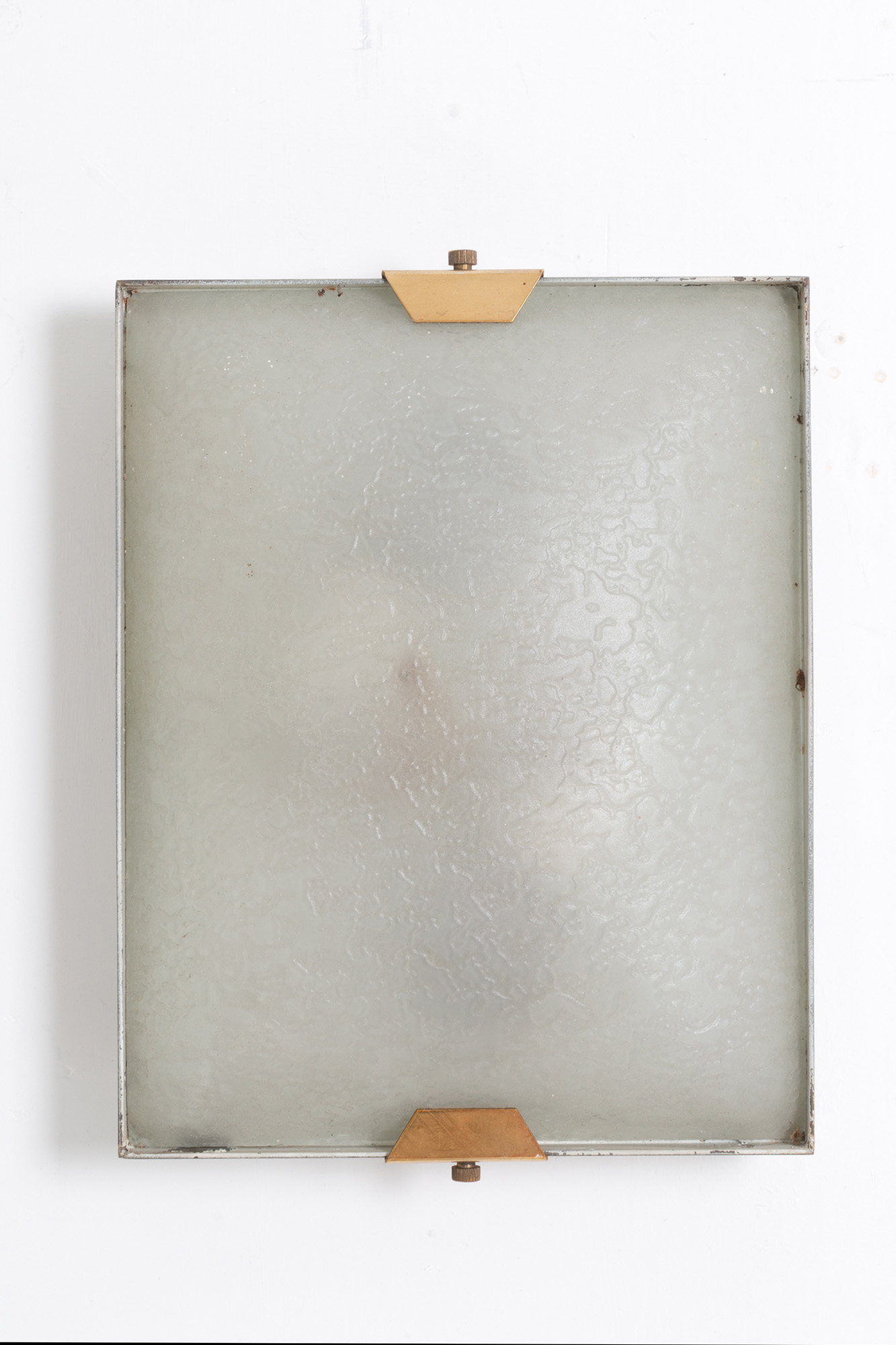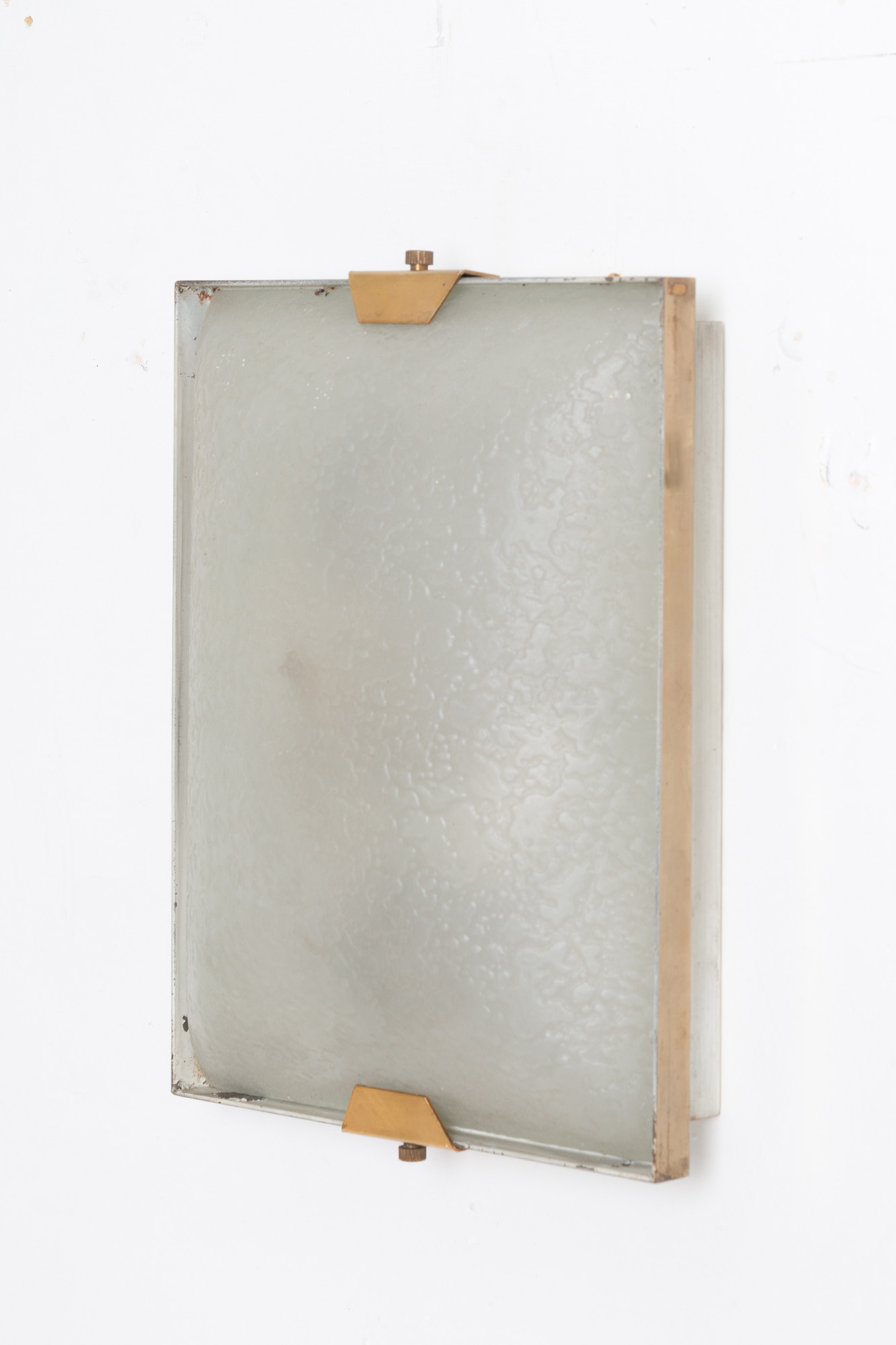Plafoniera 1122 in vetro e ottone. Produzione STILNOVO. Con marchio del produttore. Anni '60. Pubblicata in Catalogo Stilnovo numero 10, 1965, p. 16. Mis. Lung. cm. 25 Alt. cm. 19 Prof. cm. 8 ca.